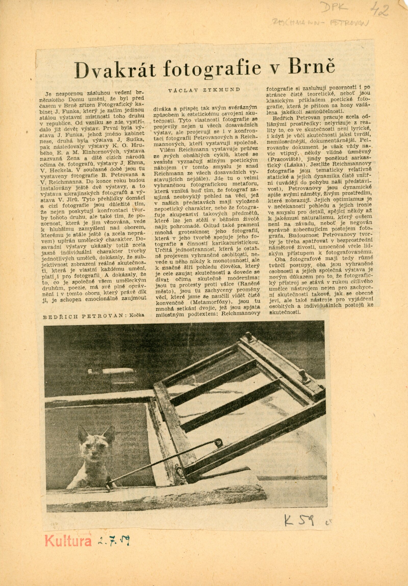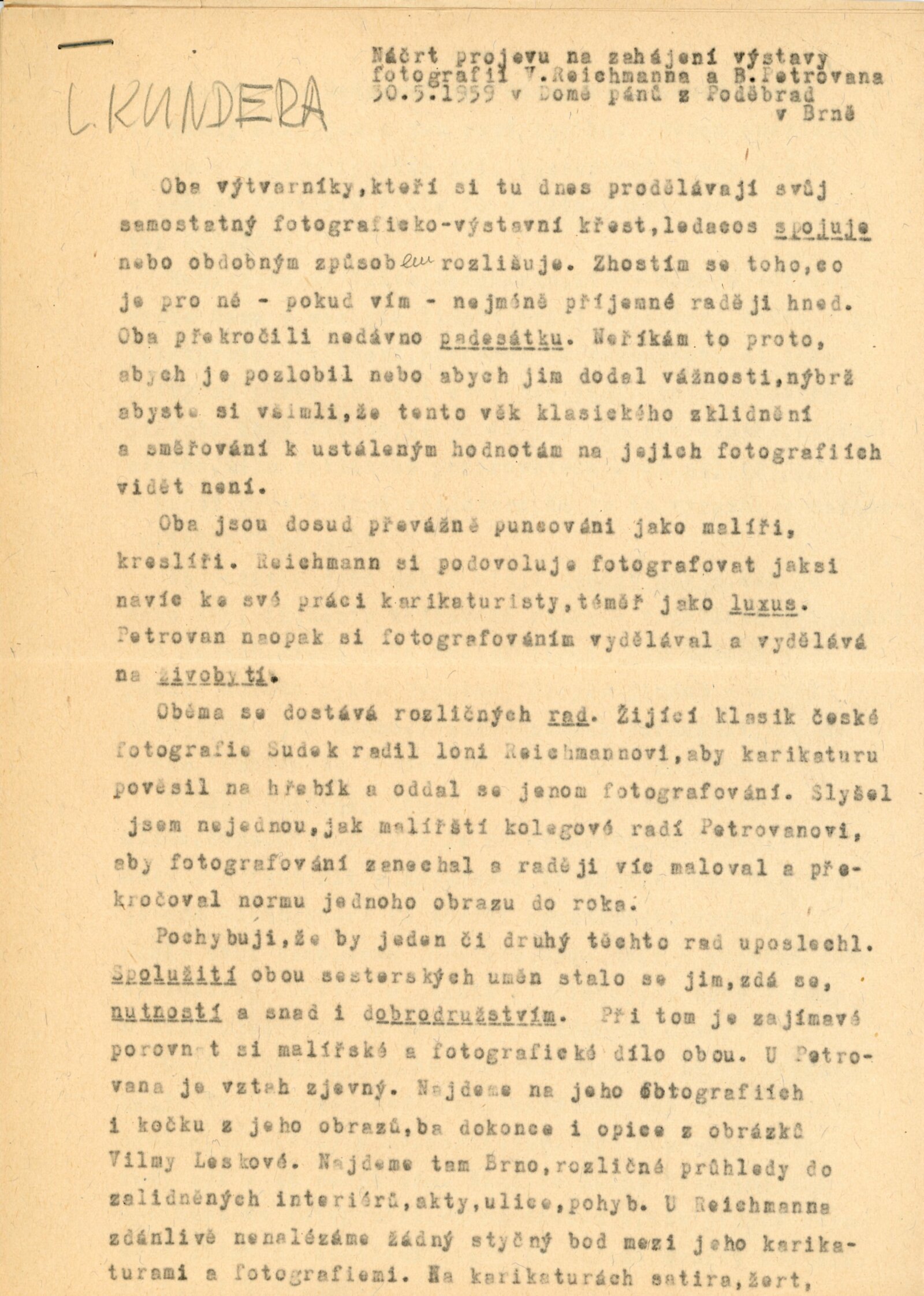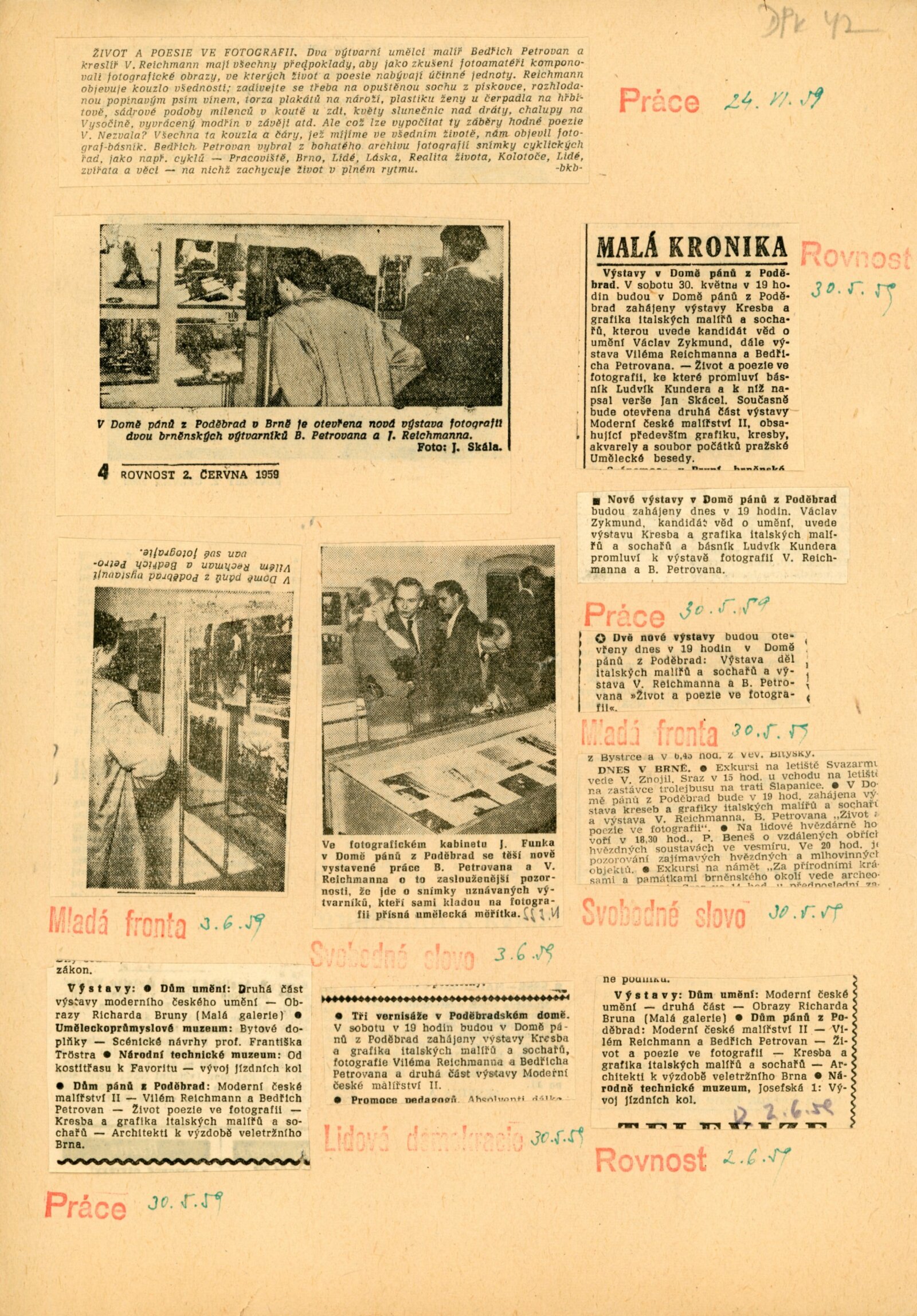 pozvánka, úvodní slovo na zahájení výstavy (Ludvík Kundera), báseň „Fotografie z Pavlova“ (Jan Skácel), fotografie z vernisáže, provozní korespondence, recenze v tisku