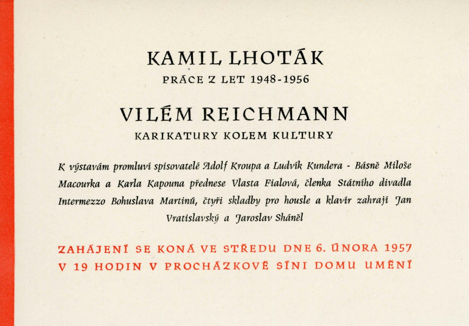 pozvánka, katalog, báseň (od K. Kapouna pro Viléma Reichmanna), projev při zahájení (Ludvík Kundera), strojopis textu katalogu (Václava Zykmunda), žádost o výstavu (Vilém Reichmann), adresy na pozvánky