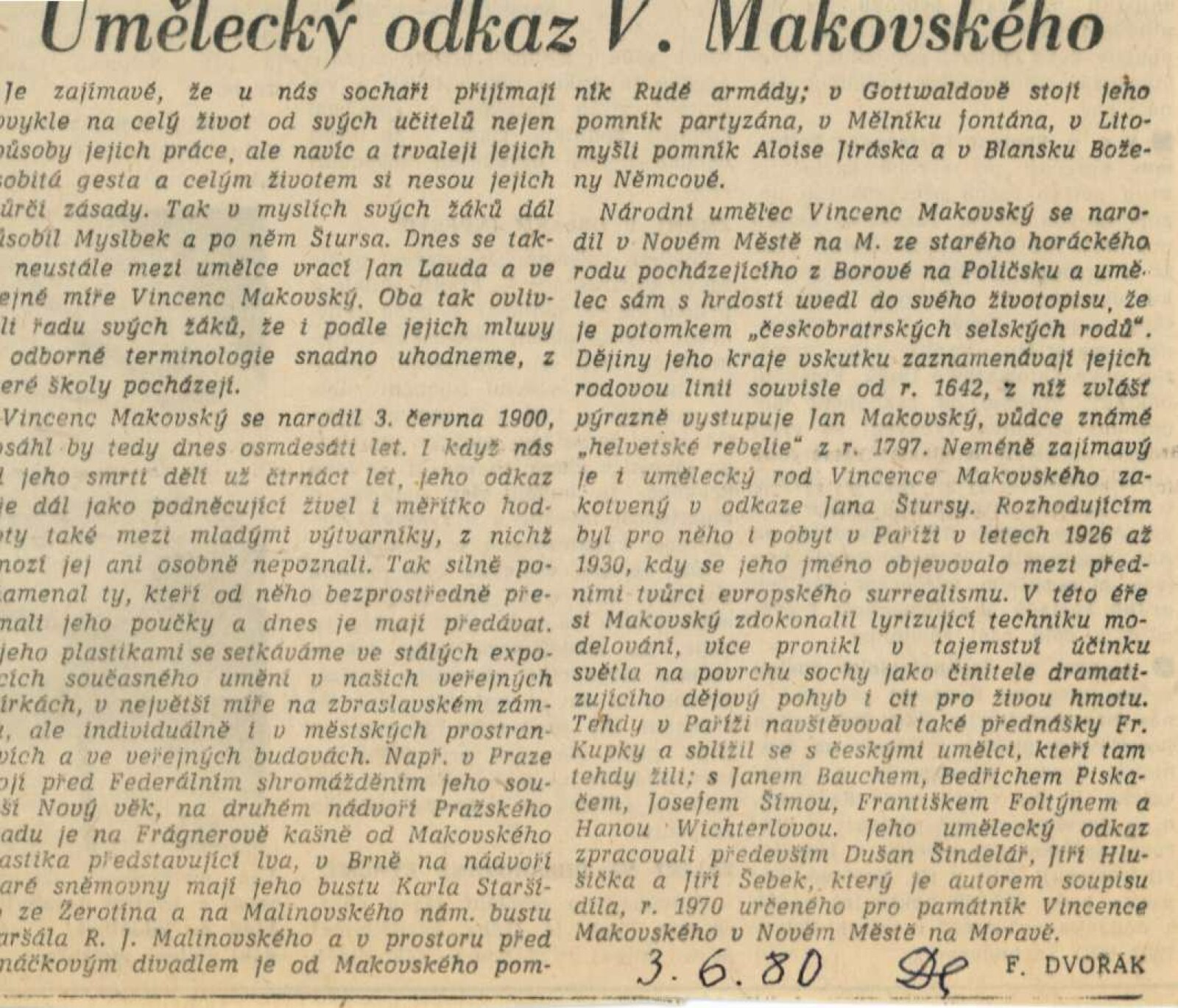 Vincenc Makovský. Sochařská kresba: Dům umění města Brna / Dům pánů z Kunštátu, 97. výstava Kabinetu grafiky, 8. 11. – 1. 12. 1968 / Text: Václav Zykmund. – Brno: DUmB, 1968. – 8 s., obr., DPK 393. – MZK; MG