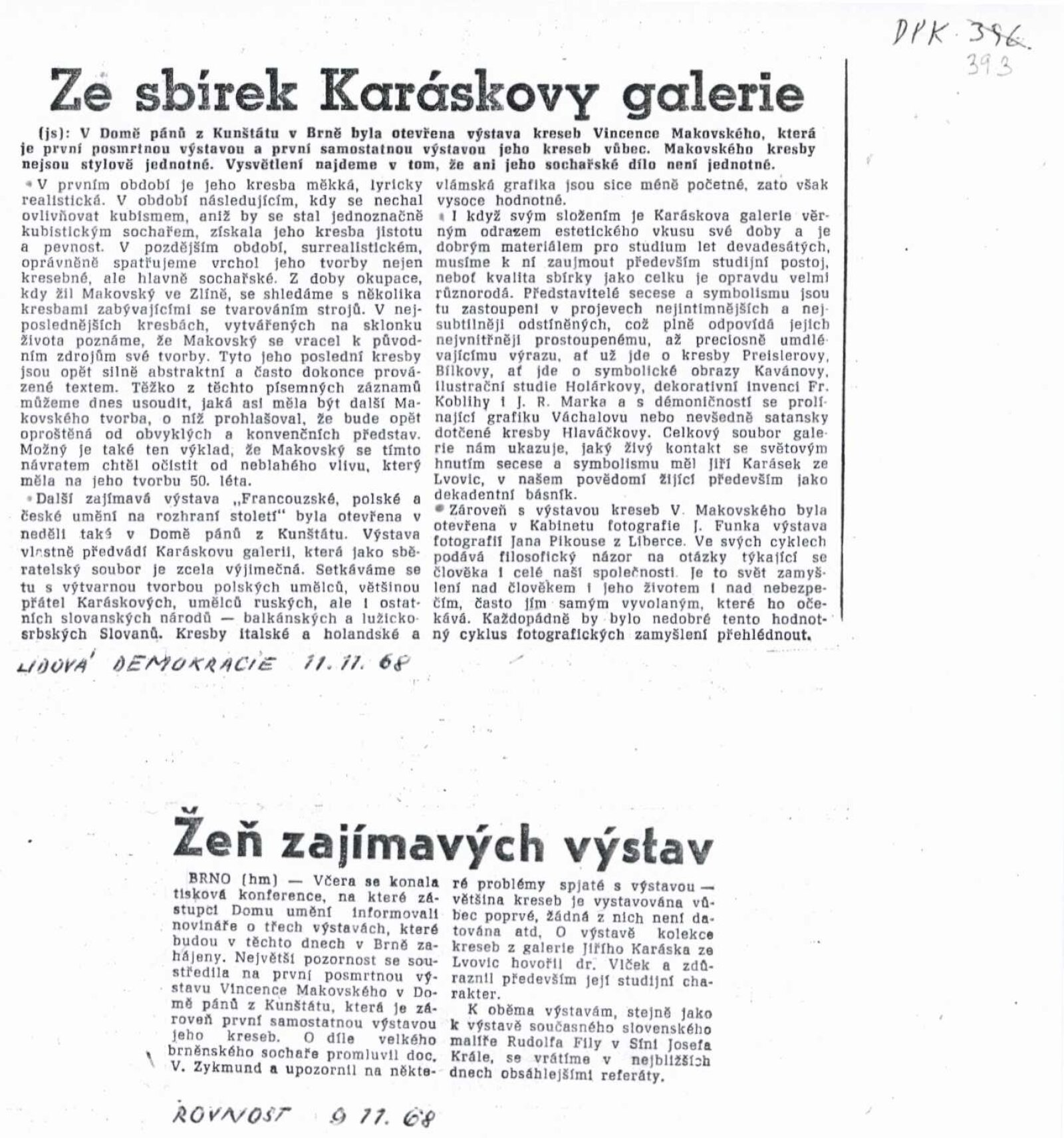 společná pozvánka DPK 393–395, katalog, strojopis textu pro katalog, fotografie děl, provozní korespondence, reverzy, recenze v tisku