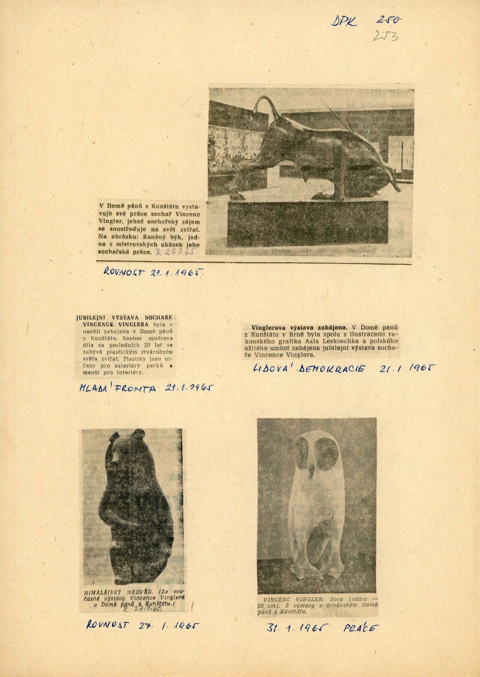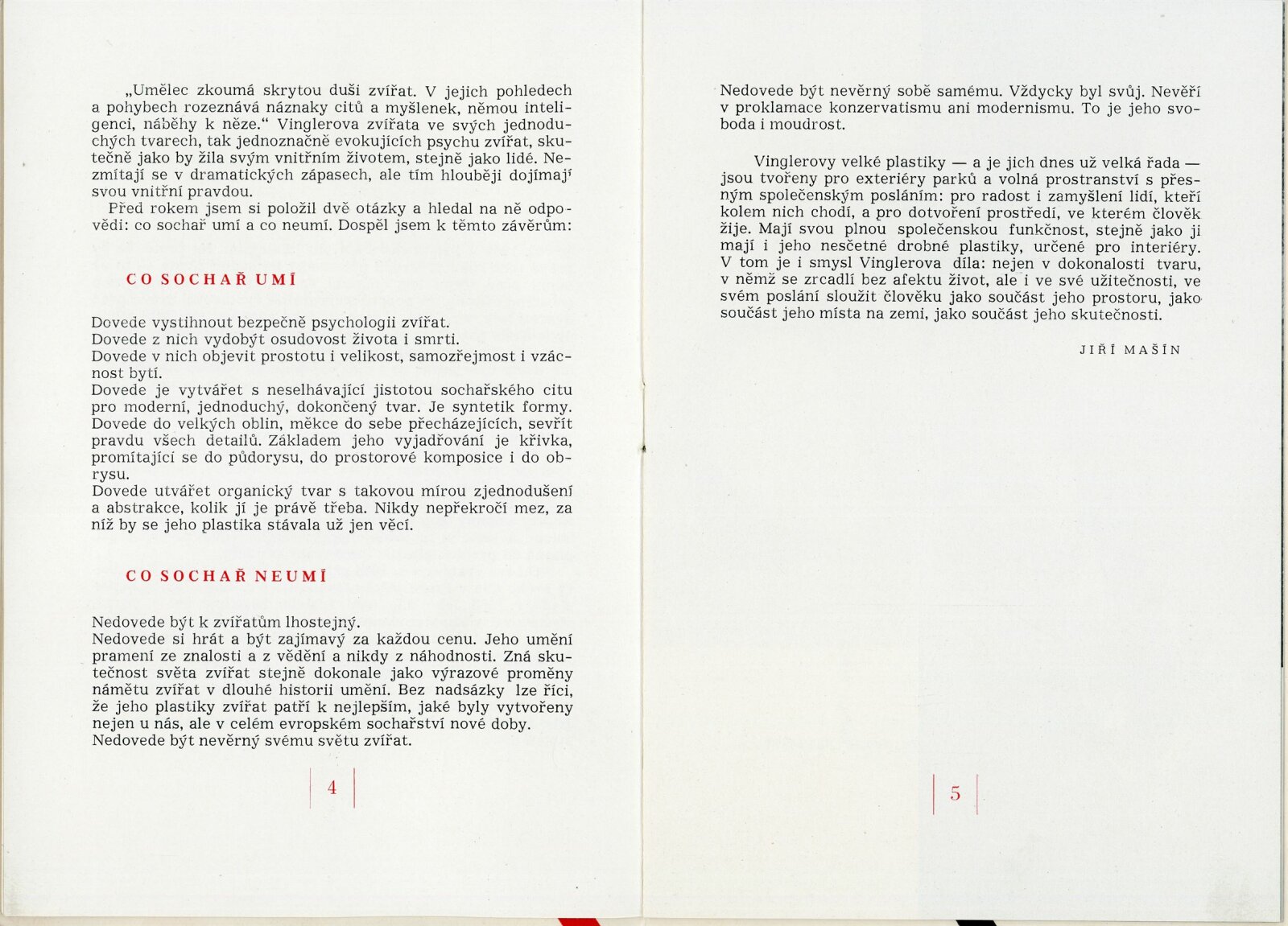 Vincenc Vingler. Sochy 1944–1964: Dům umění města Brna / Dům pánů z Kunštátu, 1. patro, 17. 1. – 21. 2. 1965 / Převzatý katalog. Vincenc Vingler. Sochy 44/64: Oblastní galerie Olomouc, říjen–listopad 1964 / Text: Jiří Mašín. – Olomouc: Oblastní galerie, 1964. – 15 s., obr., DPK 253. – MZK