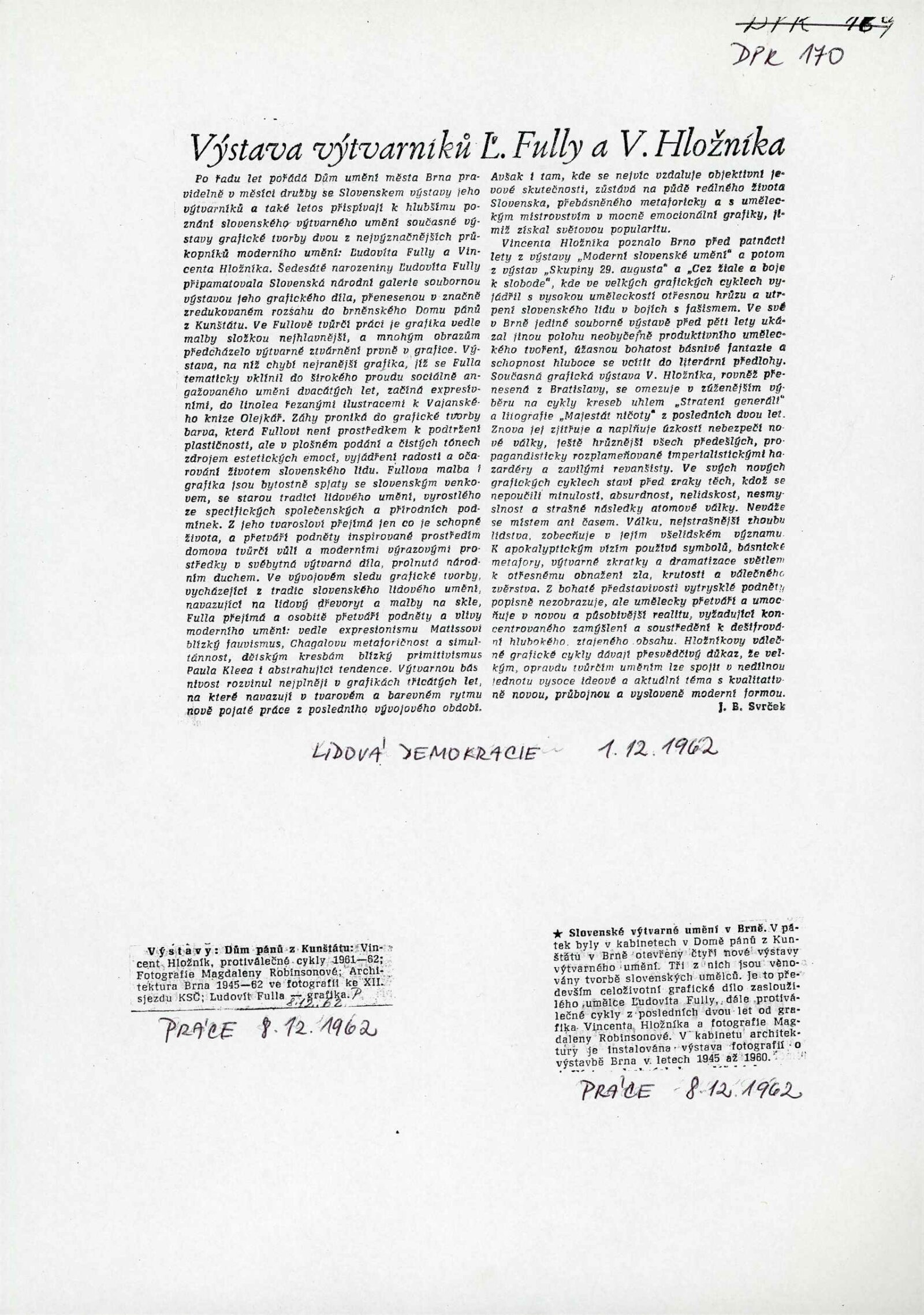 společná pozvánka DPK 169, 171 a 172, katalog, korespondence (dopisy Adolf Kroupa, Ladislav Kára a Vincent Hložník), recenze v tisku