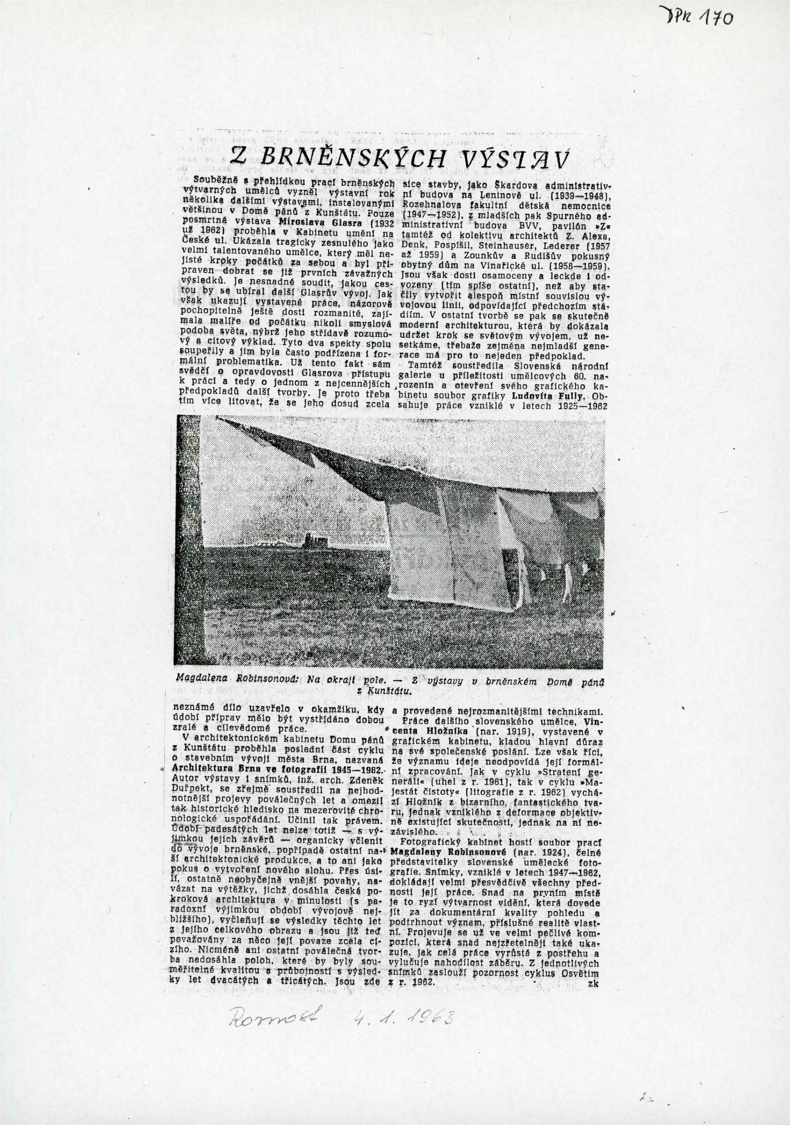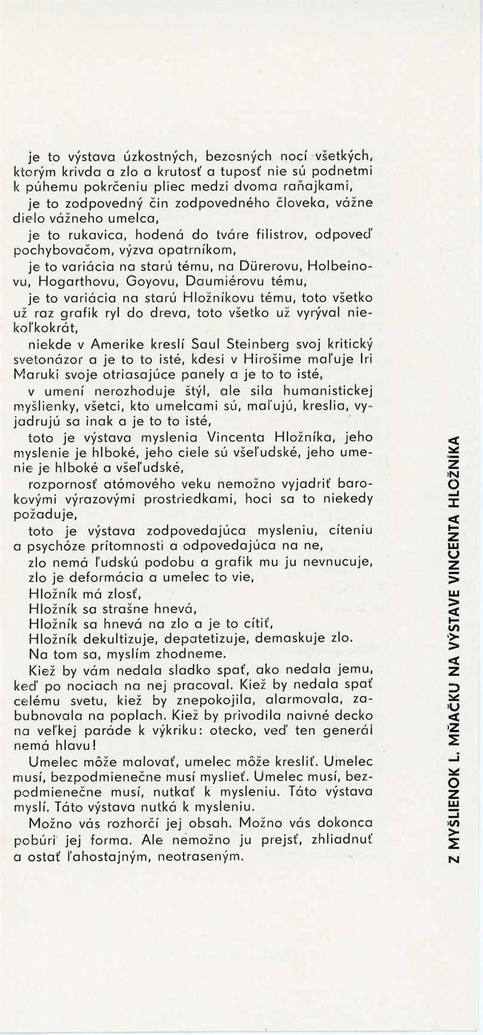Vincent Hložník. Majestát ničoty. Stratení generáli. Protivojnové cykly 1961–1962: Dům umění města Brna / Dům pánů z Kunštátu, 38. výstava Kabinetu grafiky, 7. 12. 1962 – 1. 1. 1963 / Dle L. Mňačka. – Brno: DUmB, 1962. – skládačka, 6 s., obr., DPK 170. – MG; MMB