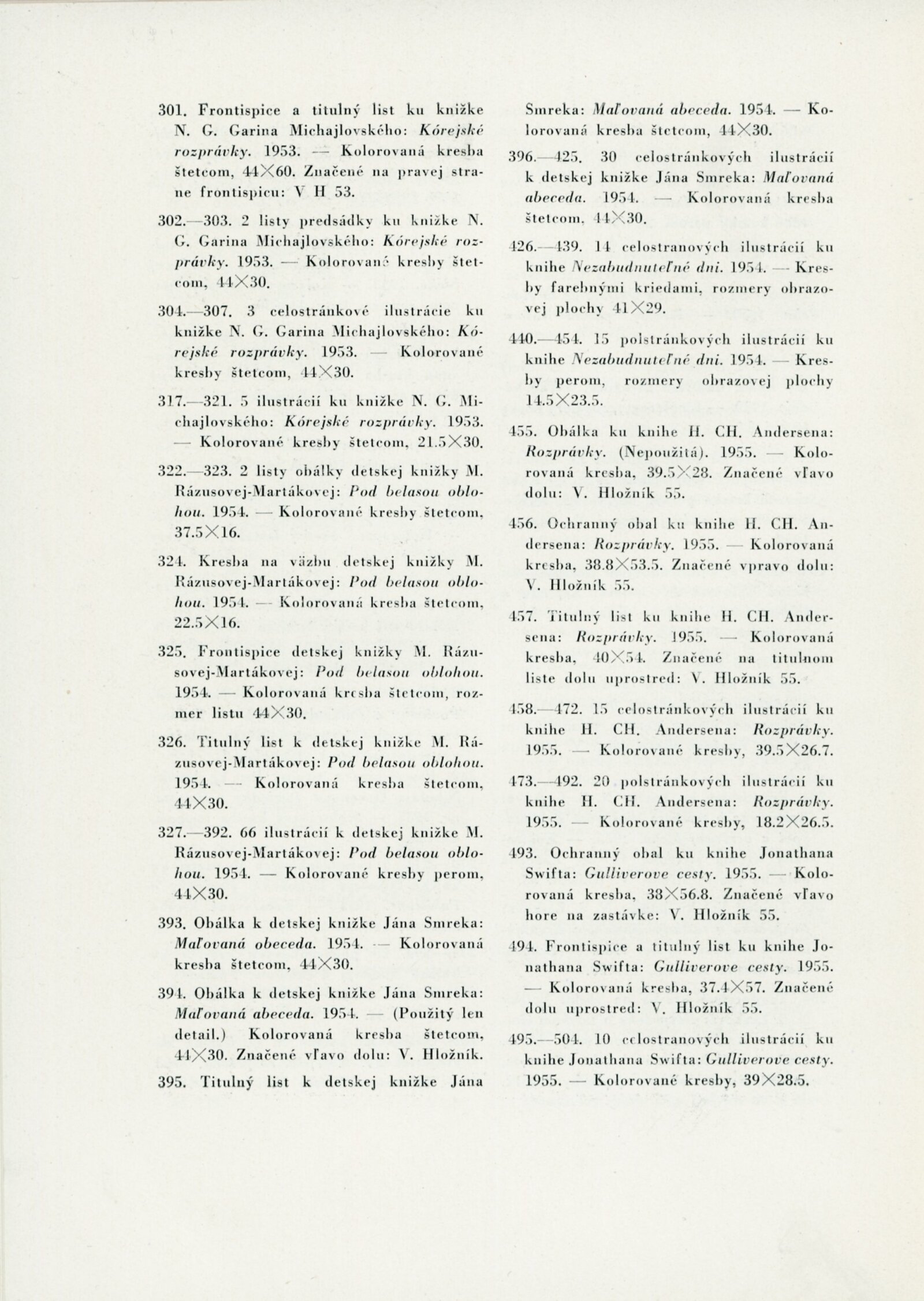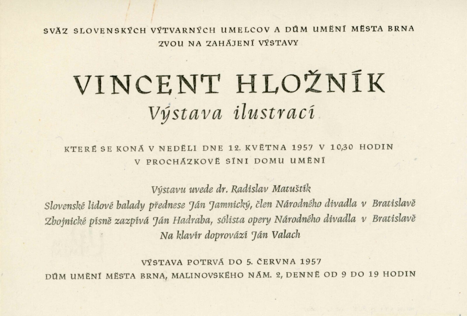 Vincent Hložník: Dům umění, 12. 5. – 5. 6. 1957 / Převzatý katalog. Vincent Hložník. Výstava ilustrací: Sväz slovenských výtvarných umelcov, Šafaríkovo nám. č. 7, 14. 4. – 5. 5. 1957 / Text: Karol Vaculík. – Bratislava: Reklama, podnik Slovenského fondu výtvarných umení, 1957. – 48 s., obr., portrét, DU 287