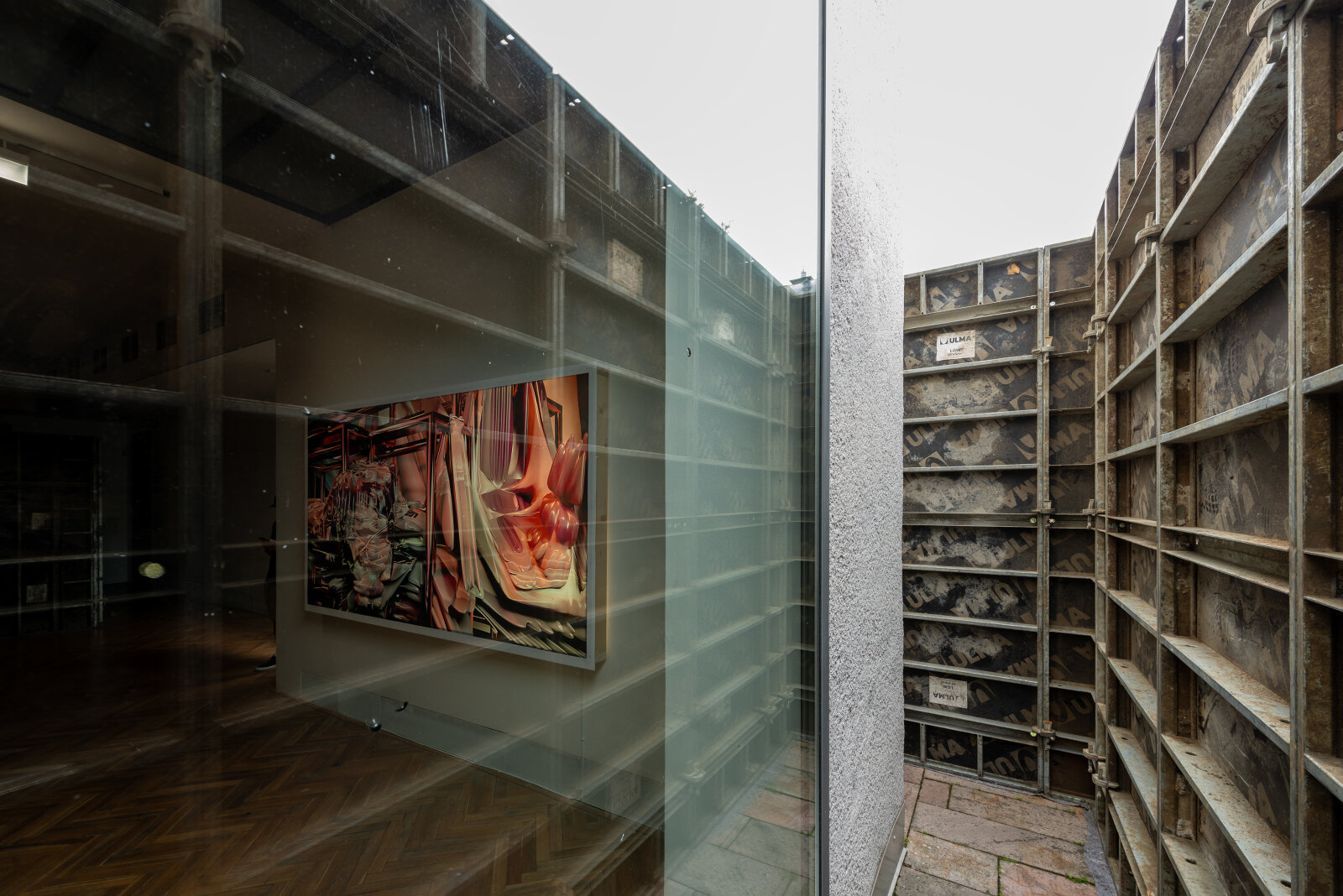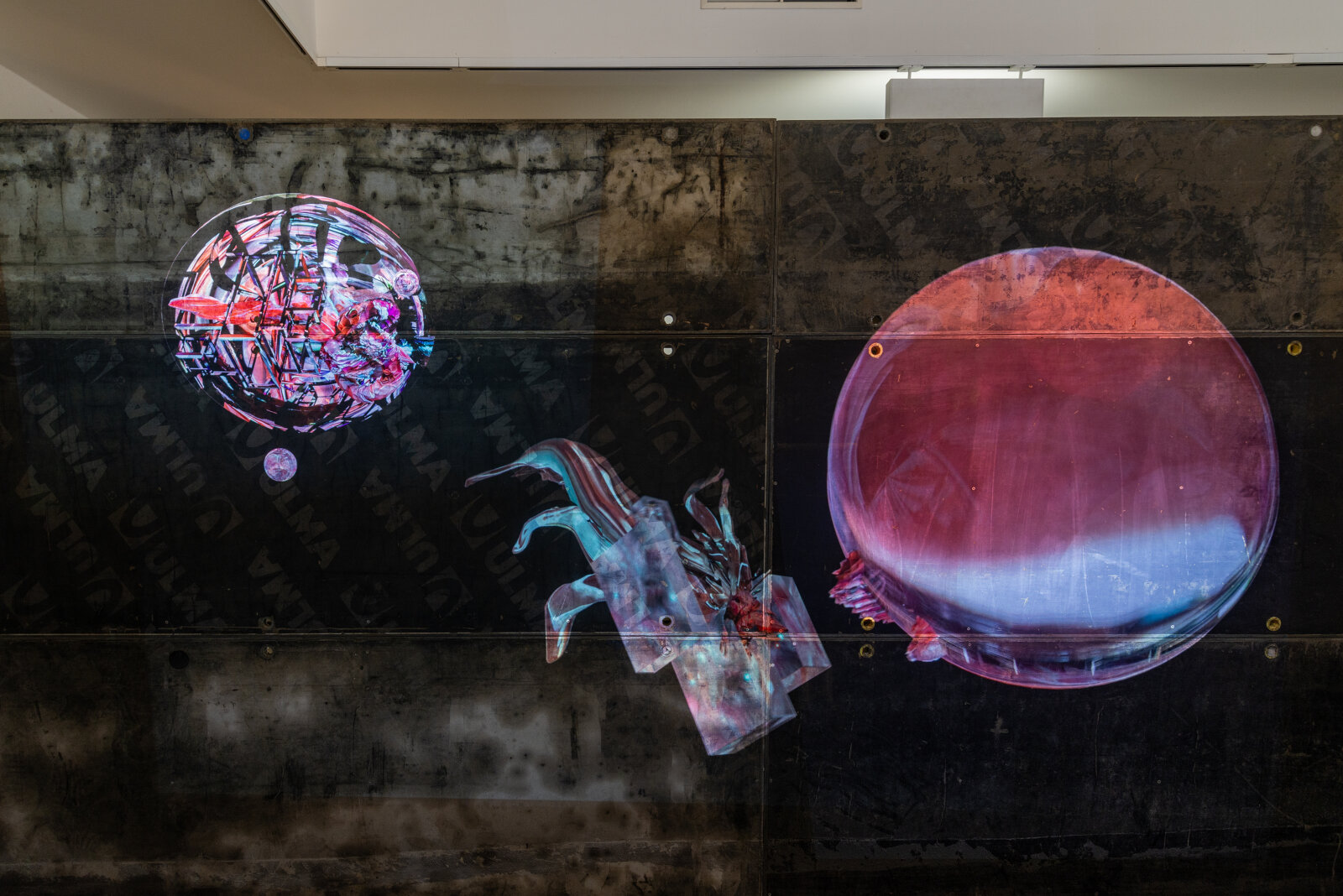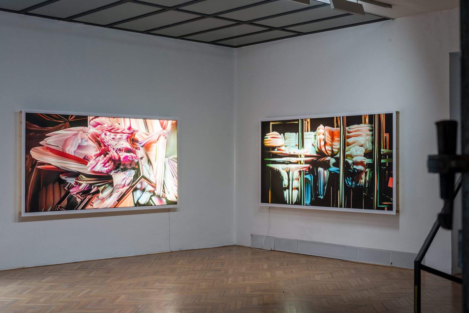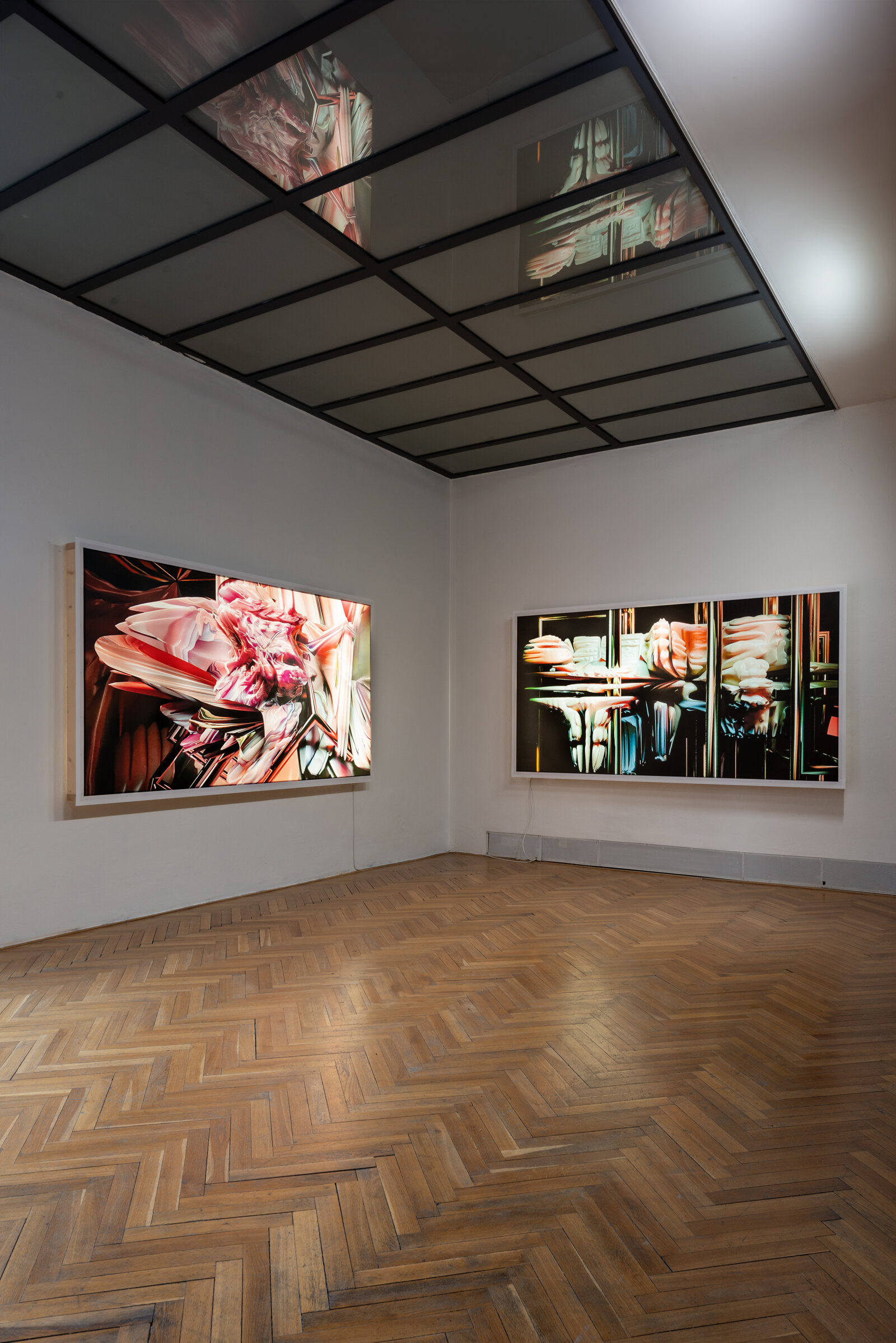 The exhibition Viscera Domus presents a spatial-visual dialogue between Helena Lukášová and Michal Palaščak, inspired by a specific building - the recently opened extension of the Faculty of Education at Masaryk University in Brno, Poříčí, which includes several spacious studios for art students and comfortable resting facilities for students and their teachers with views of the green surroundings. In the Jaroslav Kral Gallery, visitors enter Michal Palaščak's experimentally designed architectural labyrinth, built from basic, already used building materials. The installation provides a framework for Helena Lukášová's paintings, projected onto a holographic screen and stretched into light boxes. Her works evoke a biological structure - a painting of exposed tissue created by computer manipulation. The intention of the artists is to lead the audience through a corridor with views and vistas that offers the ultimate experience of the architectural design of the experimental installation of the works presented, and to show the house not as a utilitarian thing, but as an organism living in symbiosis with man.