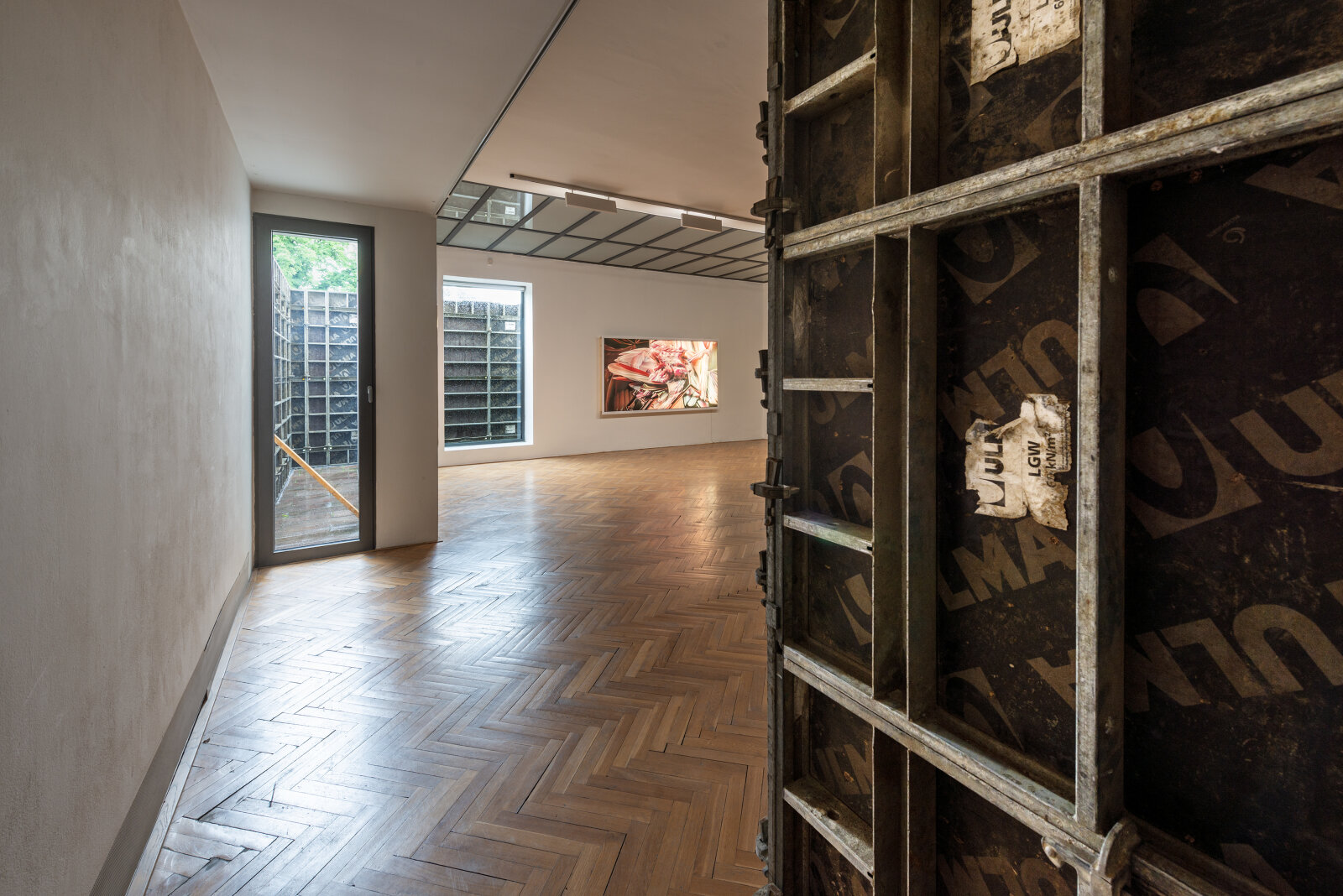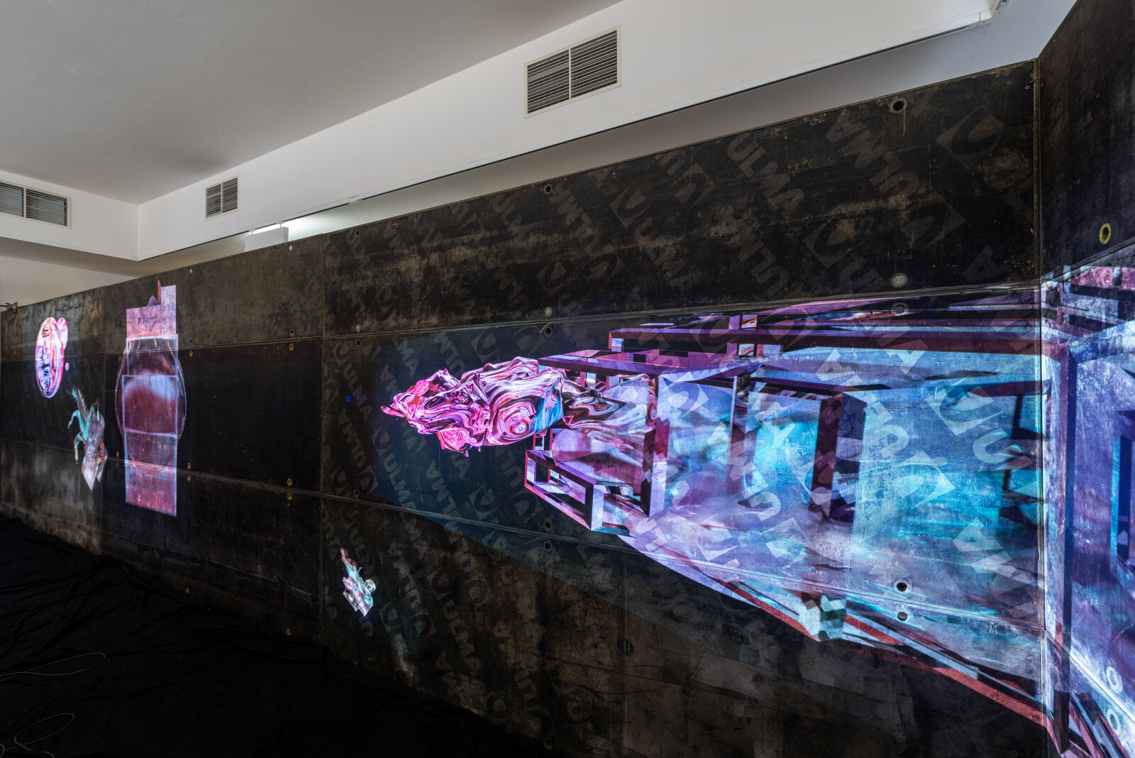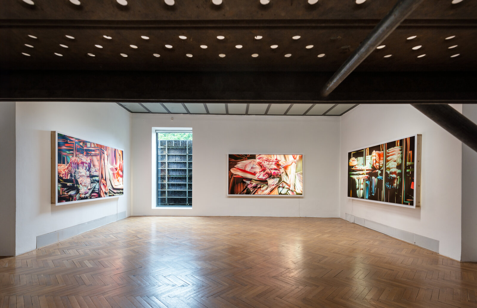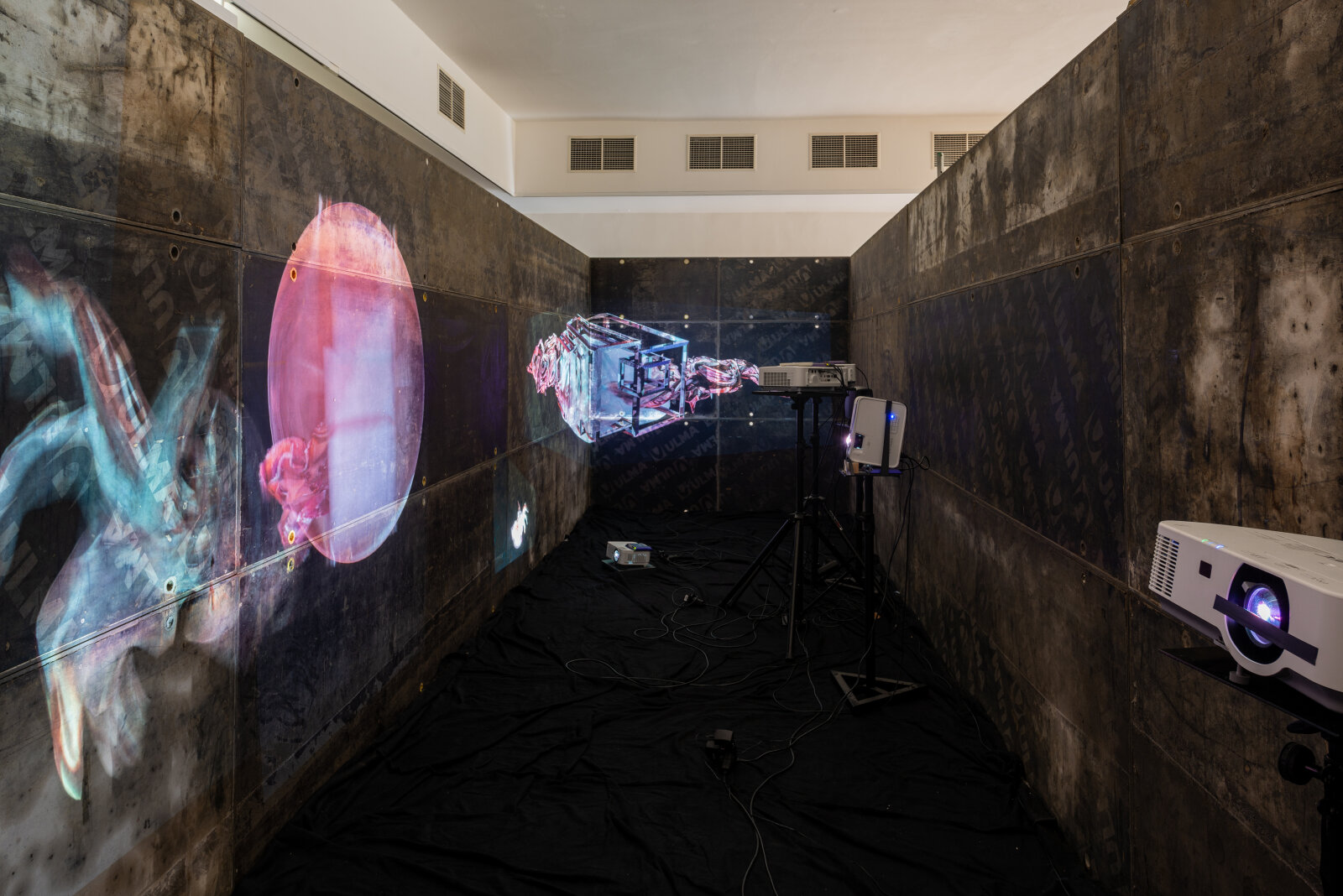 The exhibition Viscera Domus presents a spatial-visual dialogue between Helena Lukášová and Michal Palaščak, inspired by a specific building - the recently opened extension of the Faculty of Education at Masaryk University in Brno, Poříčí, which includes several spacious studios for art students and comfortable resting facilities for students and their teachers with views of the green surroundings. In the Jaroslav Kral Gallery, visitors enter Michal Palaščak's experimentally designed architectural labyrinth, built from basic, already used building materials. The installation provides a framework for Helena Lukášová's paintings, projected onto a holographic screen and stretched into light boxes. Her works evoke a biological structure - a painting of exposed tissue created by computer manipulation. The intention of the artists is to lead the audience through a corridor with views and vistas that offers the ultimate experience of the architectural design of the experimental installation of the works presented, and to show the house not as a utilitarian thing, but as an organism living in symbiosis with man.