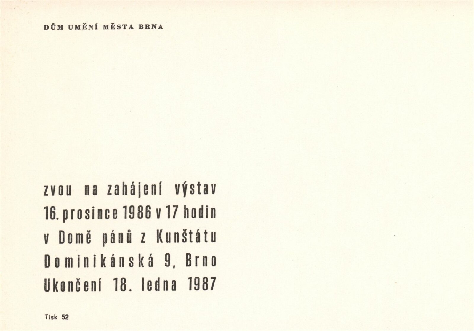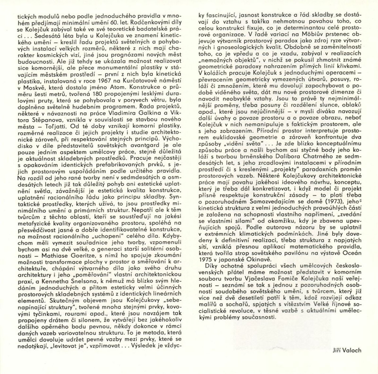 Vjačeslav Fomič Kolejčuk. Plastiky, koláže, dokumentace: Dům umění / Dům pánů z Kunštátu, Kabinet architektury, 16. 12. 1986 – 18. 1. 1987 / Text: Jiří Valoch. – Brno: DUmB, 1986. – [25] s., obr., životní data, výstavy, DPK 880. – MZK; MG; MMB