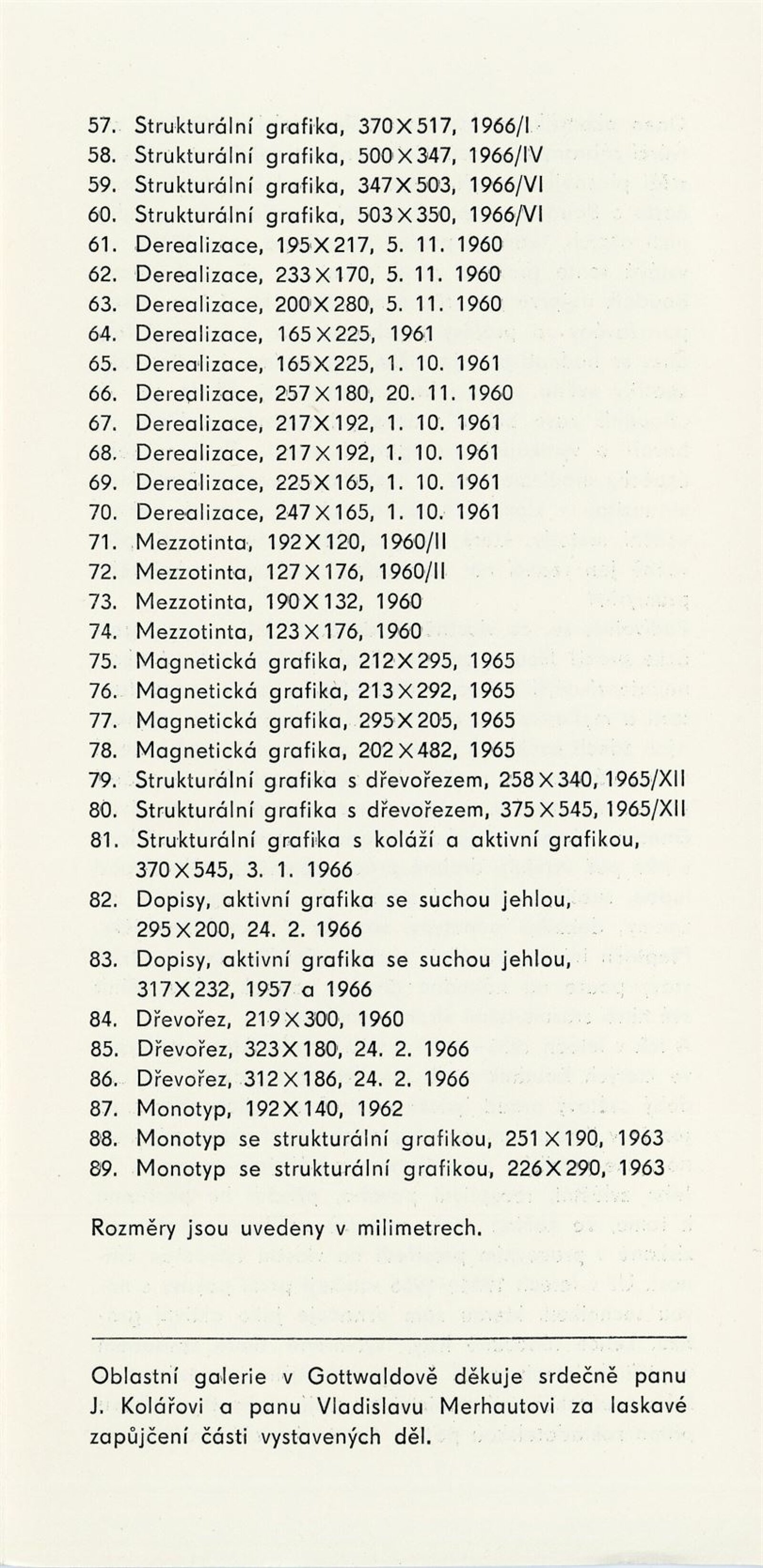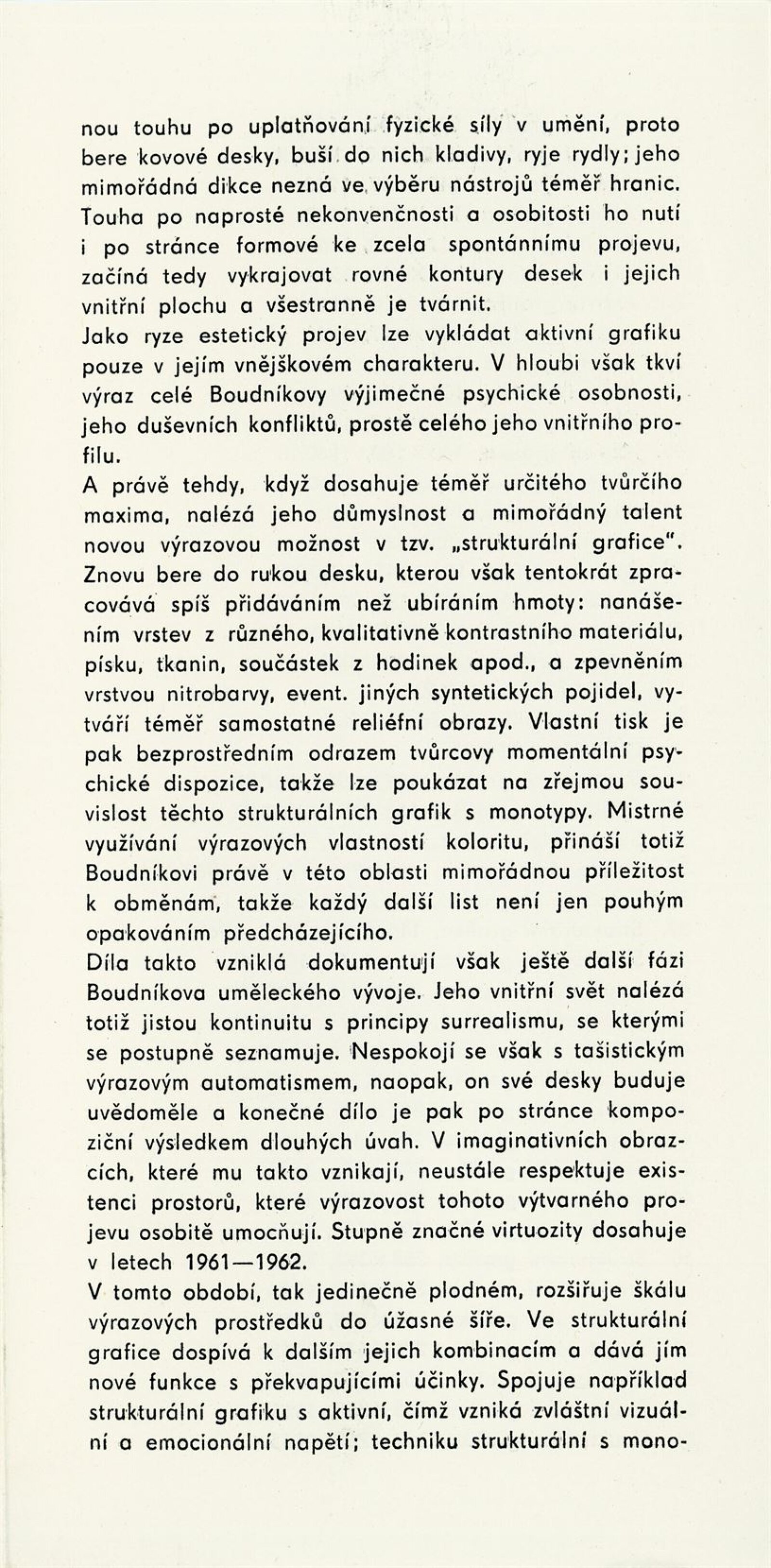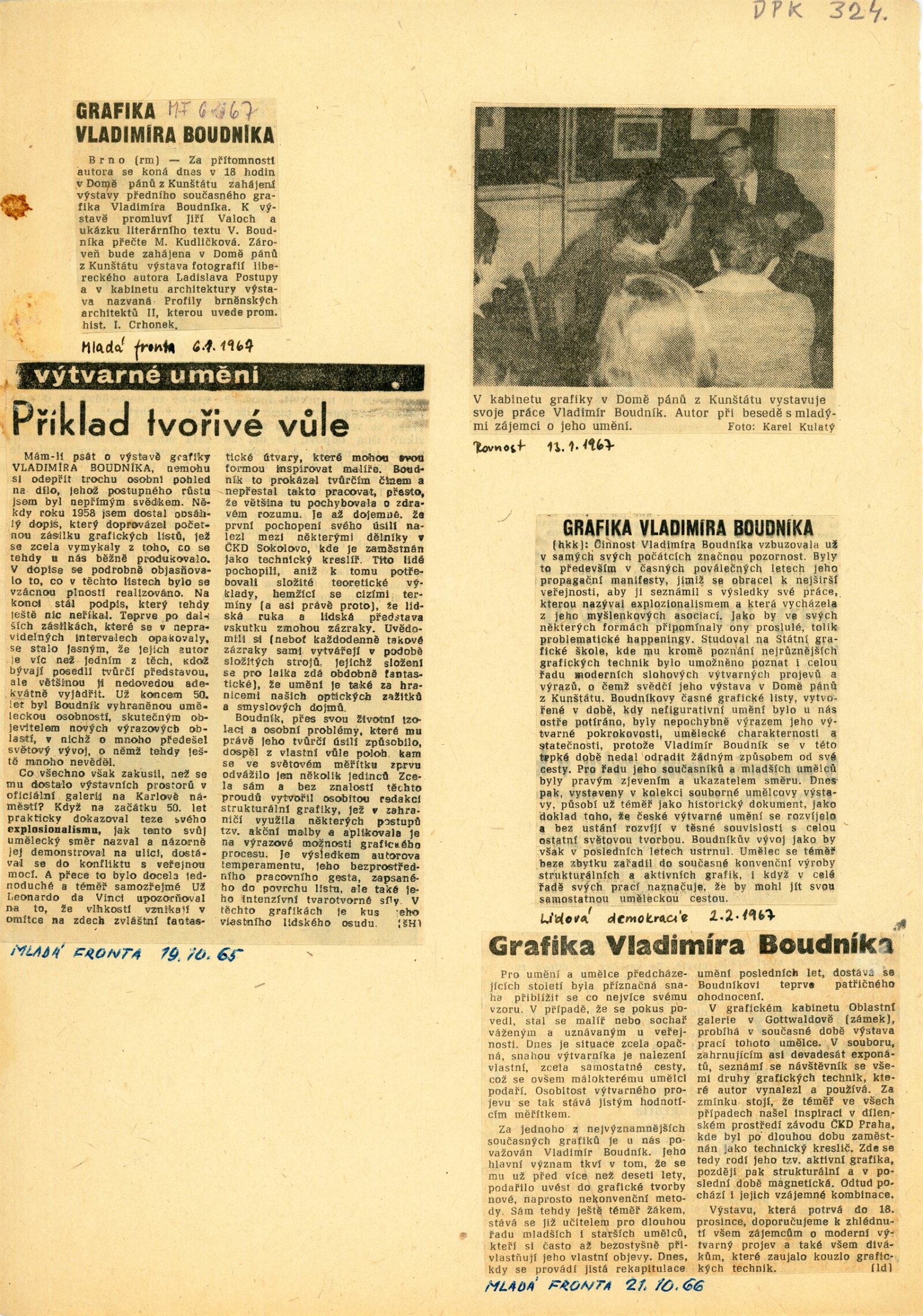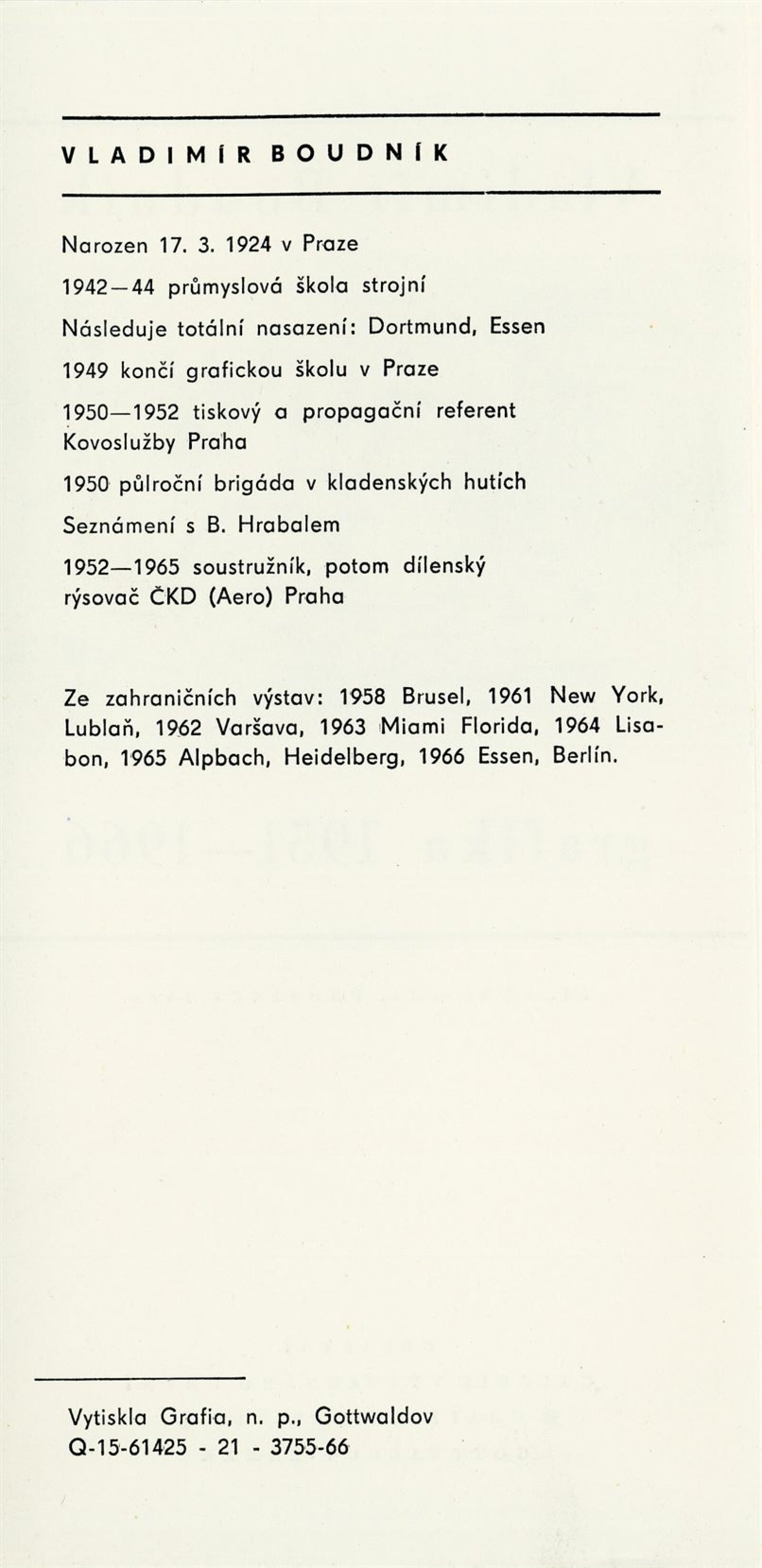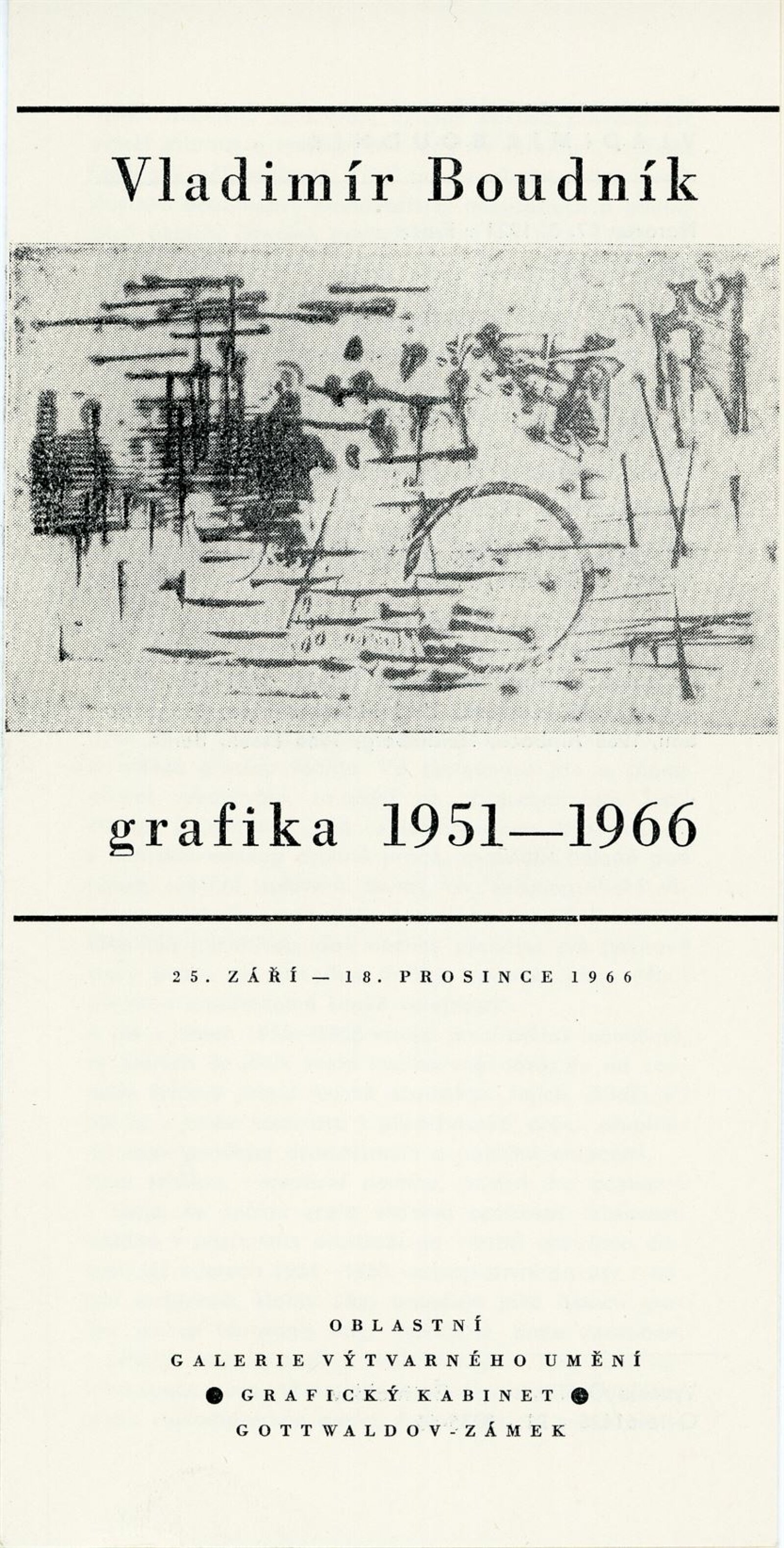 Vladimír Boudník. Grafika 1951–1966: Dům umění města Brna/ Dům pánů z Kunštátu, 79. výstava Kabinetu grafiky, 6. 1. – 30. 1. 1967/ Převzatý katalog. Vladimír Boudník. Grafika 1951–1966: Oblastní galerie výtvarného umění, grafický kabinet, Gottwaldov (Zlín), 25. 9. – 18. 12. 1966/ Text: Libuše Dědková. – Gottwaldov: Oblastní galerie výtvarného umění, 1966. – skládačka, 8 s., obr., DPK 324. – MZK; MG