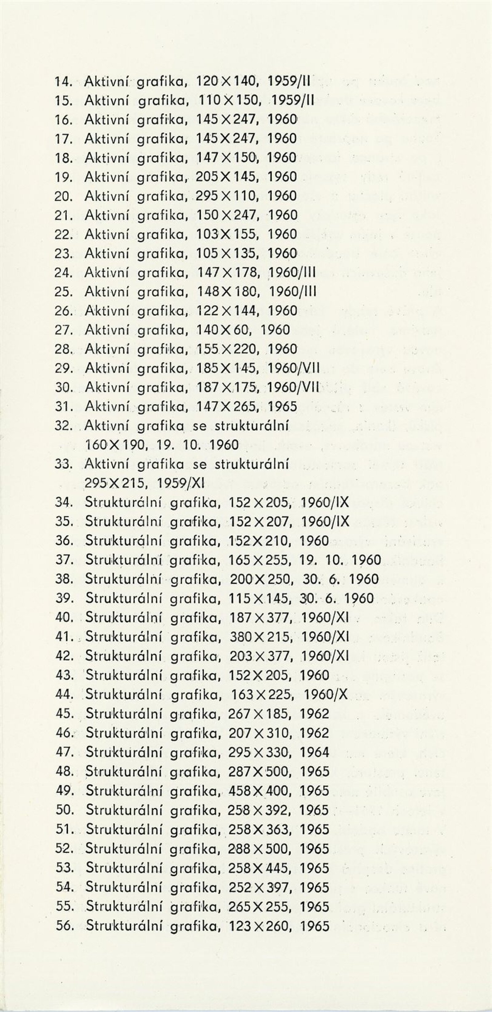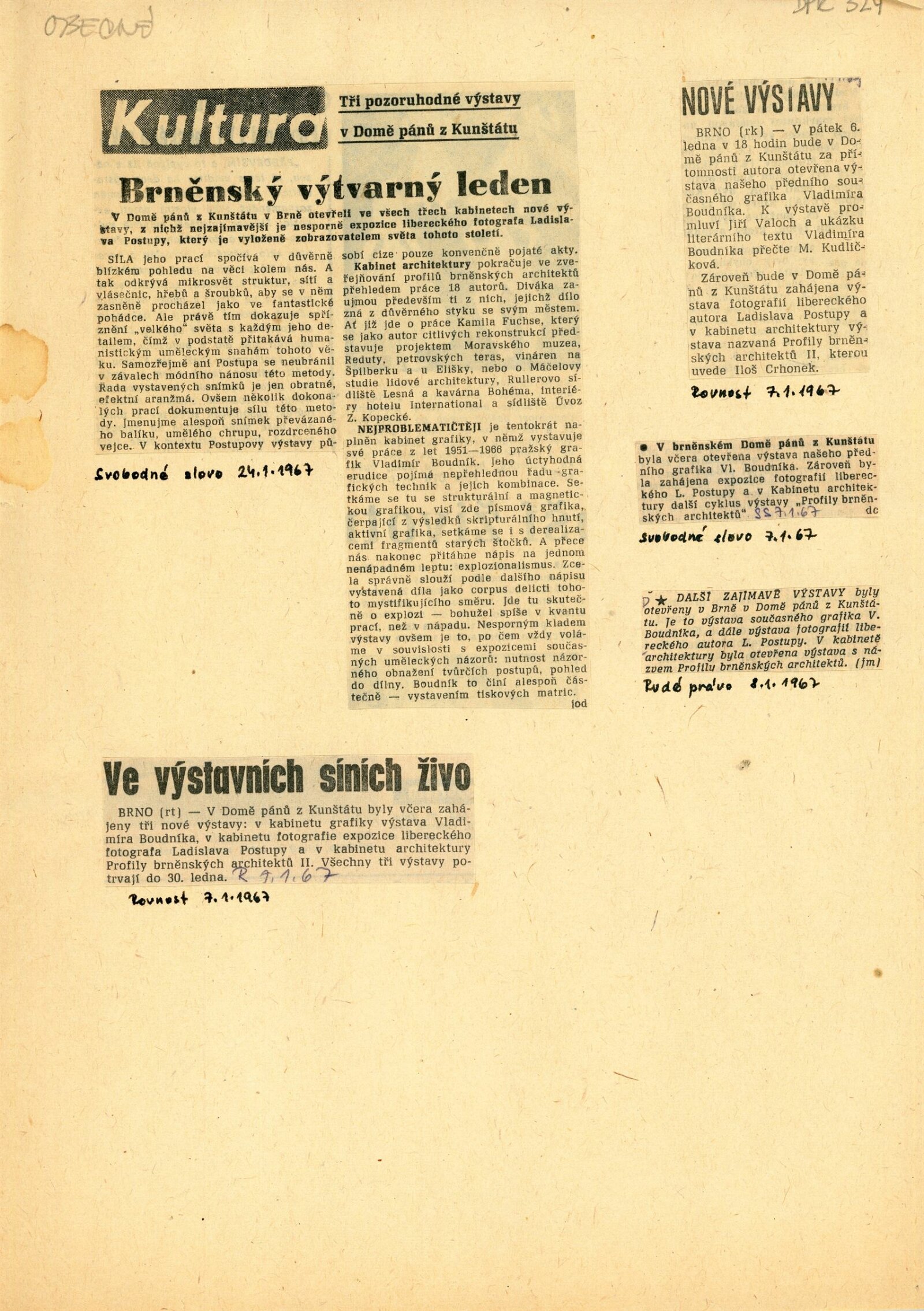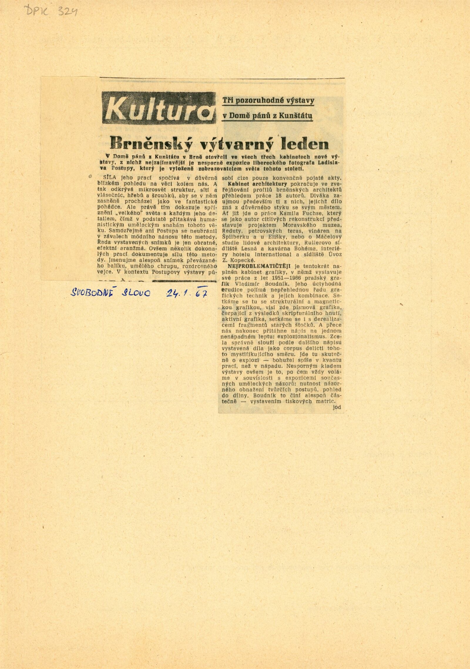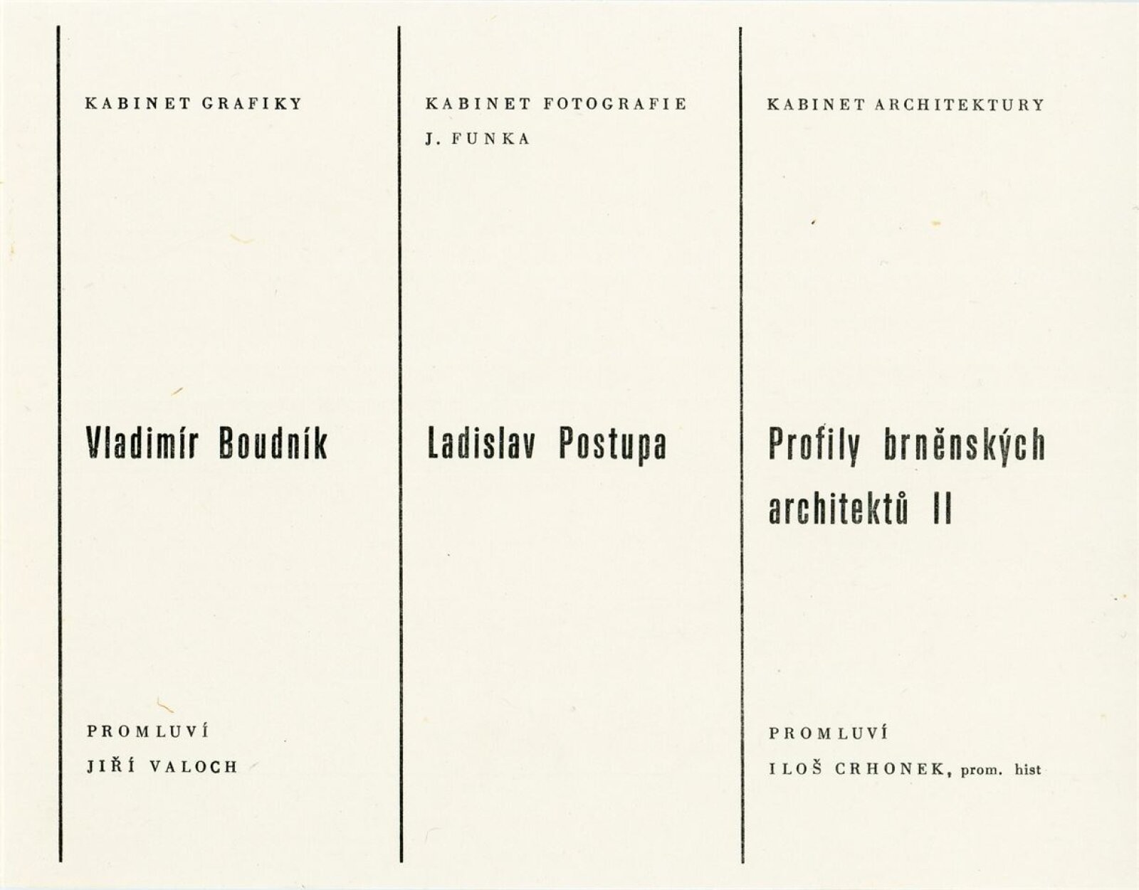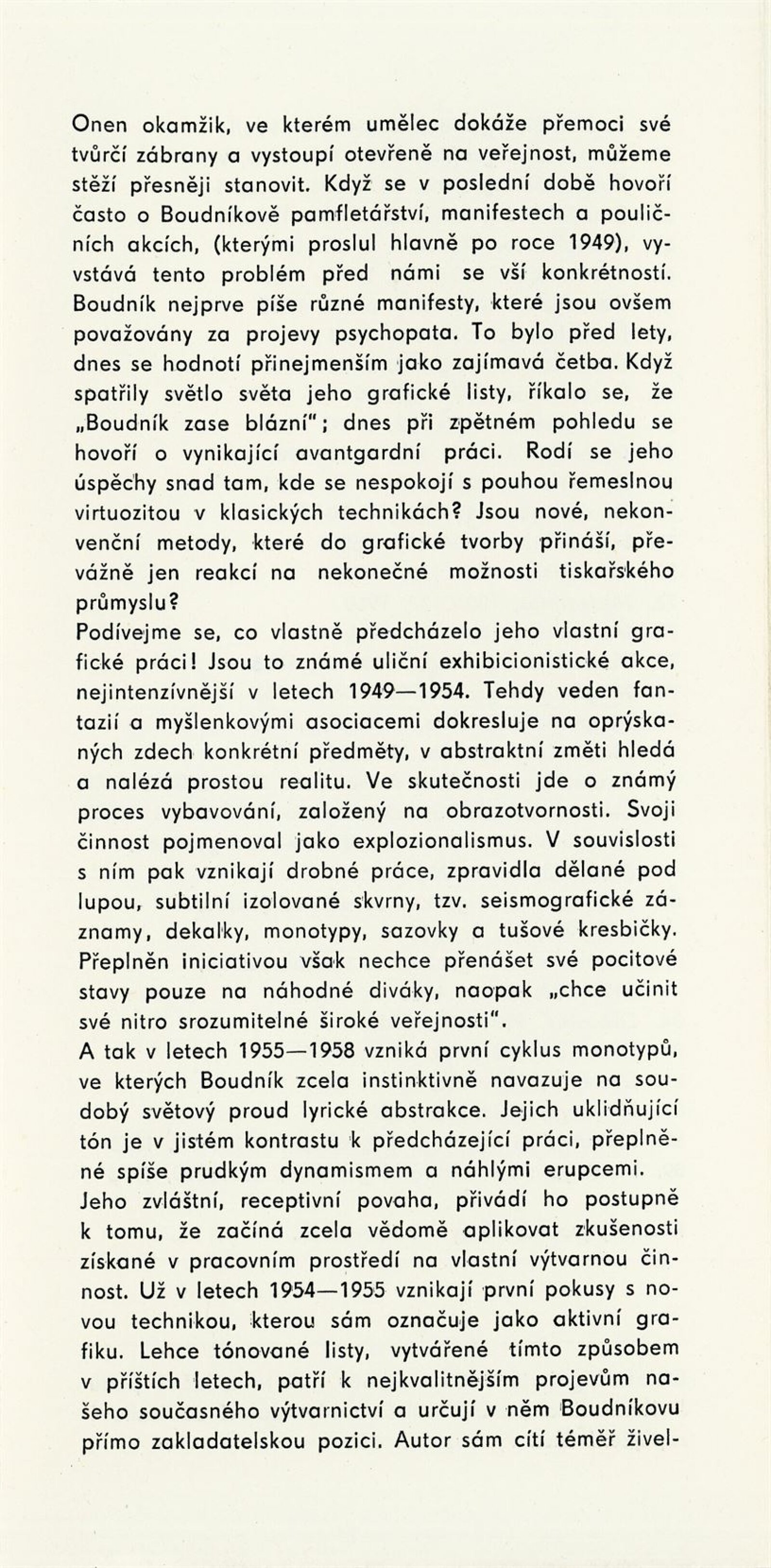 Vladimír Boudník. Grafika 1951–1966: Dům umění města Brna/ Dům pánů z Kunštátu, 79. výstava Kabinetu grafiky, 6. 1. – 30. 1. 1967/ Převzatý katalog. Vladimír Boudník. Grafika 1951–1966: Oblastní galerie výtvarného umění, grafický kabinet, Gottwaldov (Zlín), 25. 9. – 18. 12. 1966/ Text: Libuše Dědková. – Gottwaldov: Oblastní galerie výtvarného umění, 1966. – skládačka, 8 s., obr., DPK 324. – MZK; MG