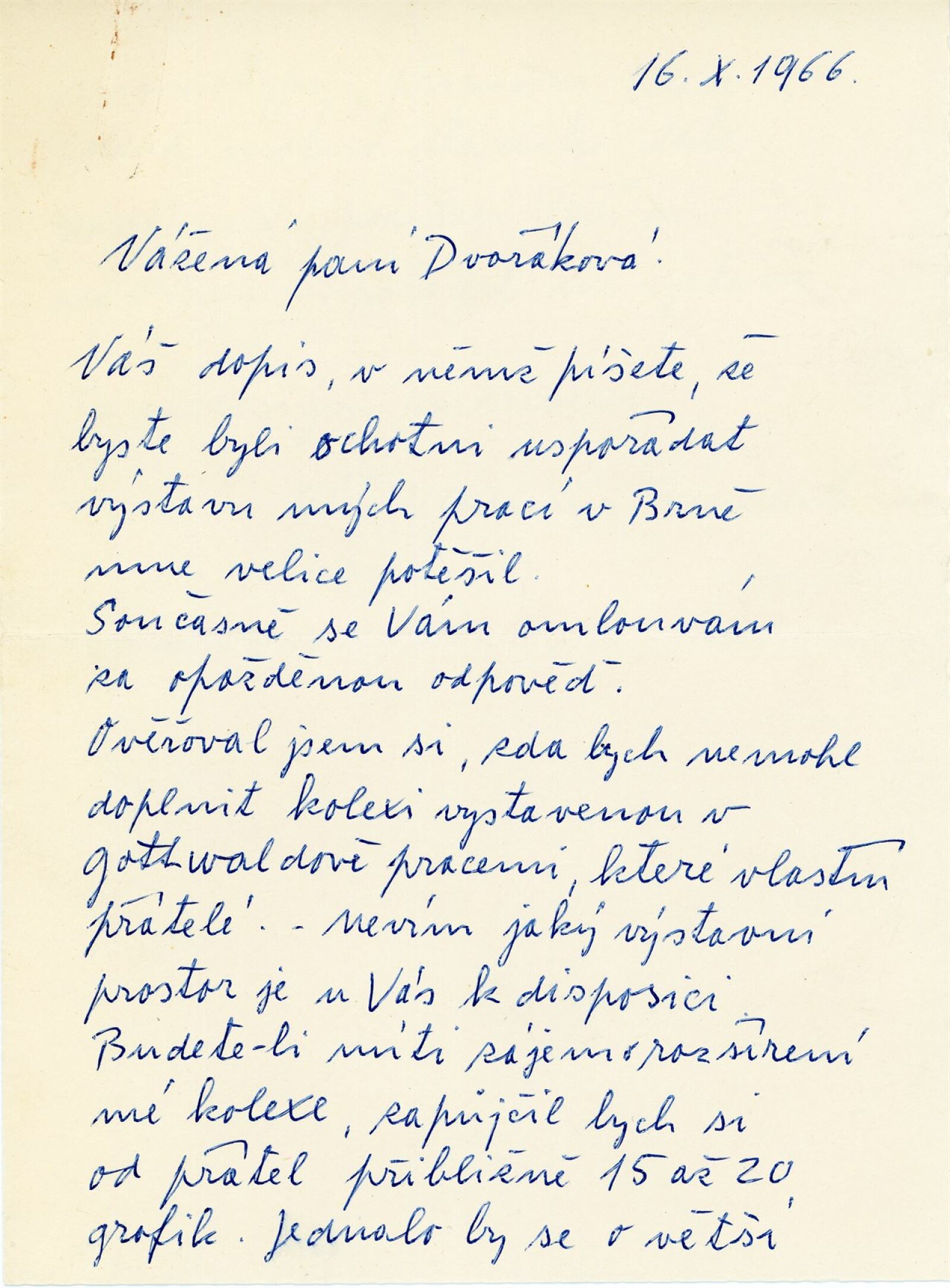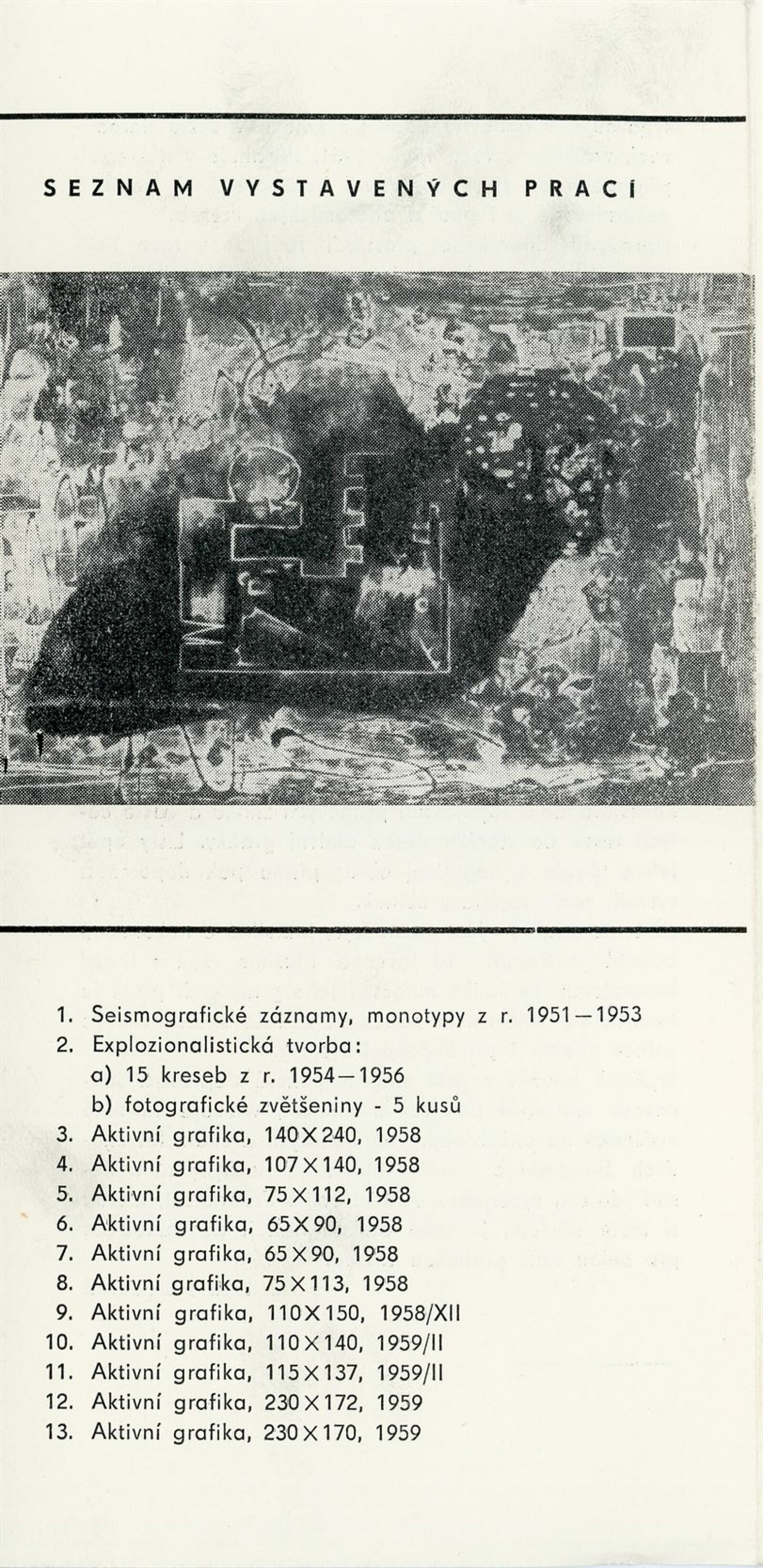 pozvánka, seznam vystavených děl, fotografie (z vernisáže, z výstavy), korespodence (převzetí výstavy z Gottwaldova, rukopis Vladimíra Boudníka, provozní korespondence), reverzy, recenze v tisku, katalogy převzaté výstavy (Zlín, Liberec)