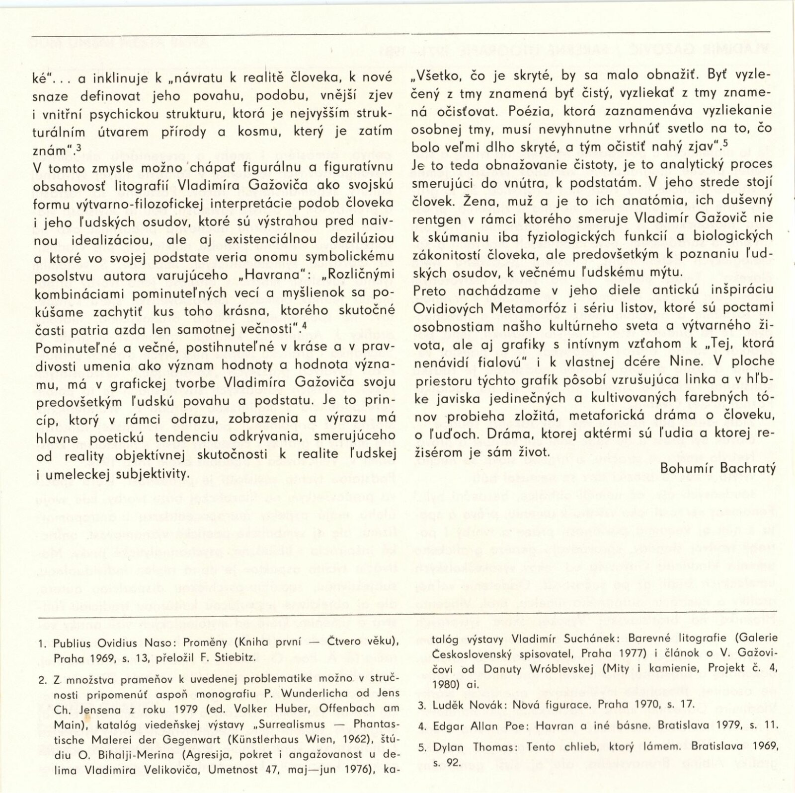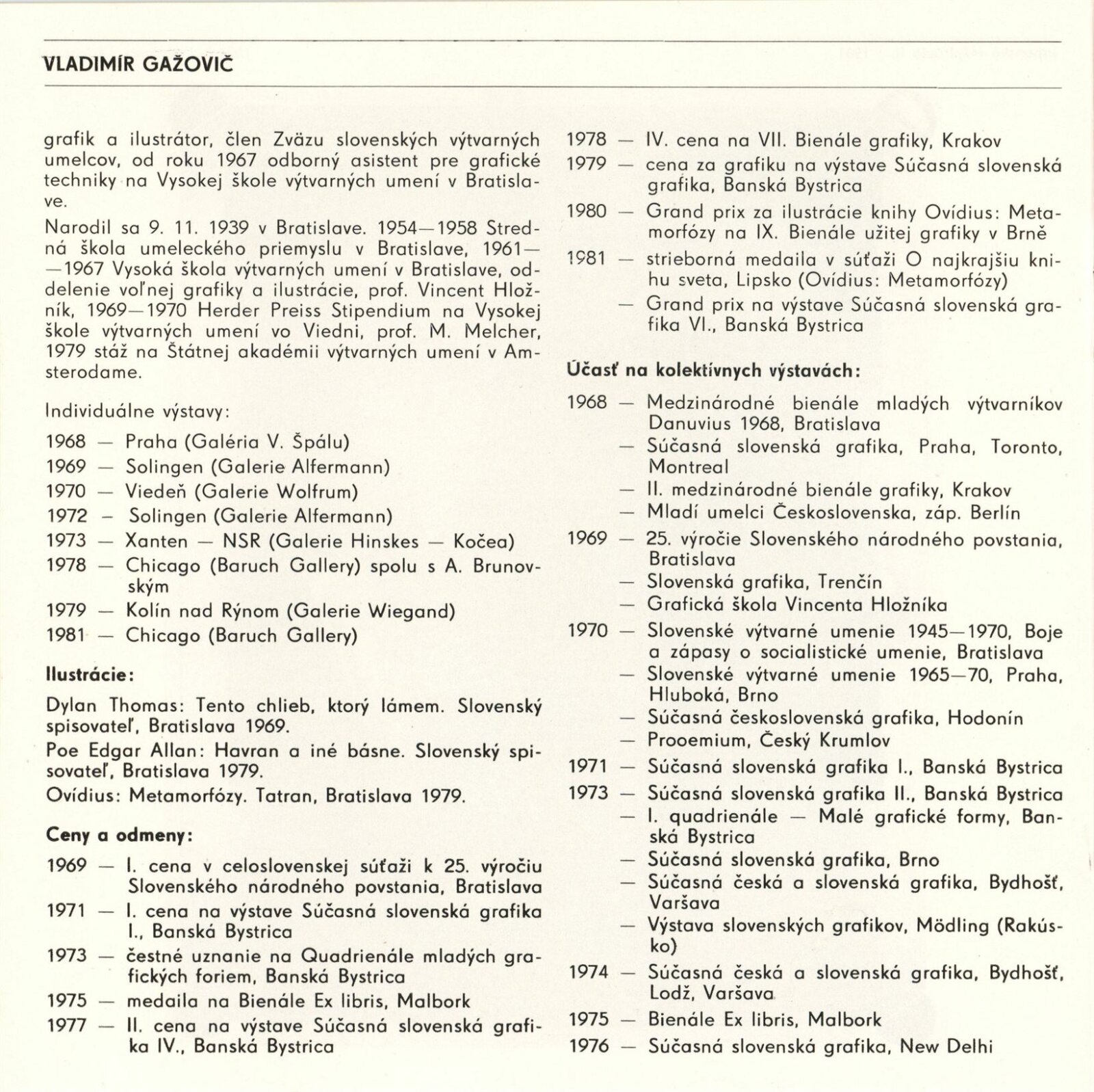 Vladimír Gažovič. Farebné litografie 1971–1981: Dům umění / Dům pánů z Kunštátu, Kabinet grafiky, 8. 1. – 7. 2. 1982 / Text: Bohumír Bachratý. – Brno: DUmB, 1982. – 16 s., obr., životní data, výstavy, ilustrace, DPK 770. – MZK; MG
