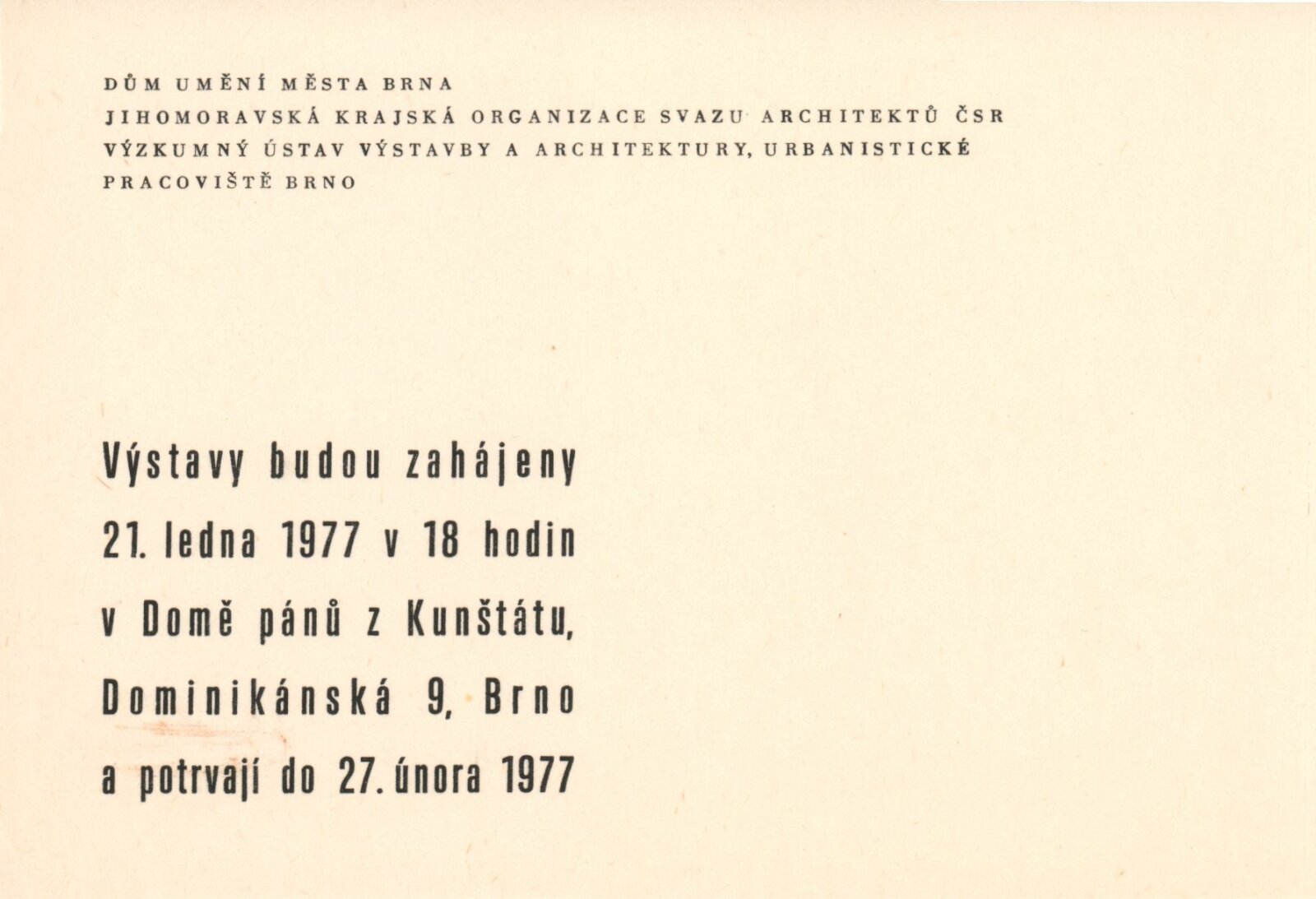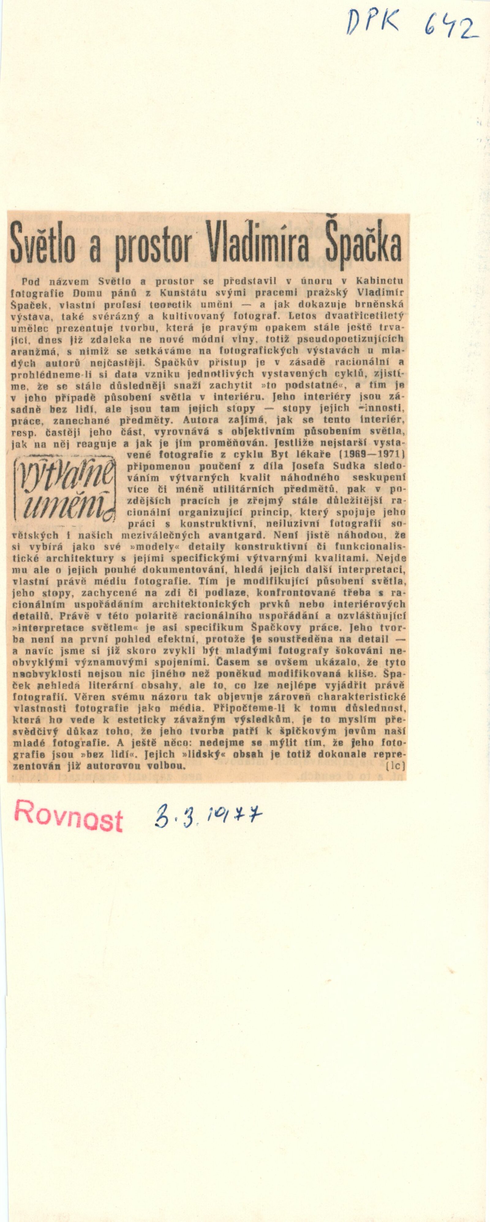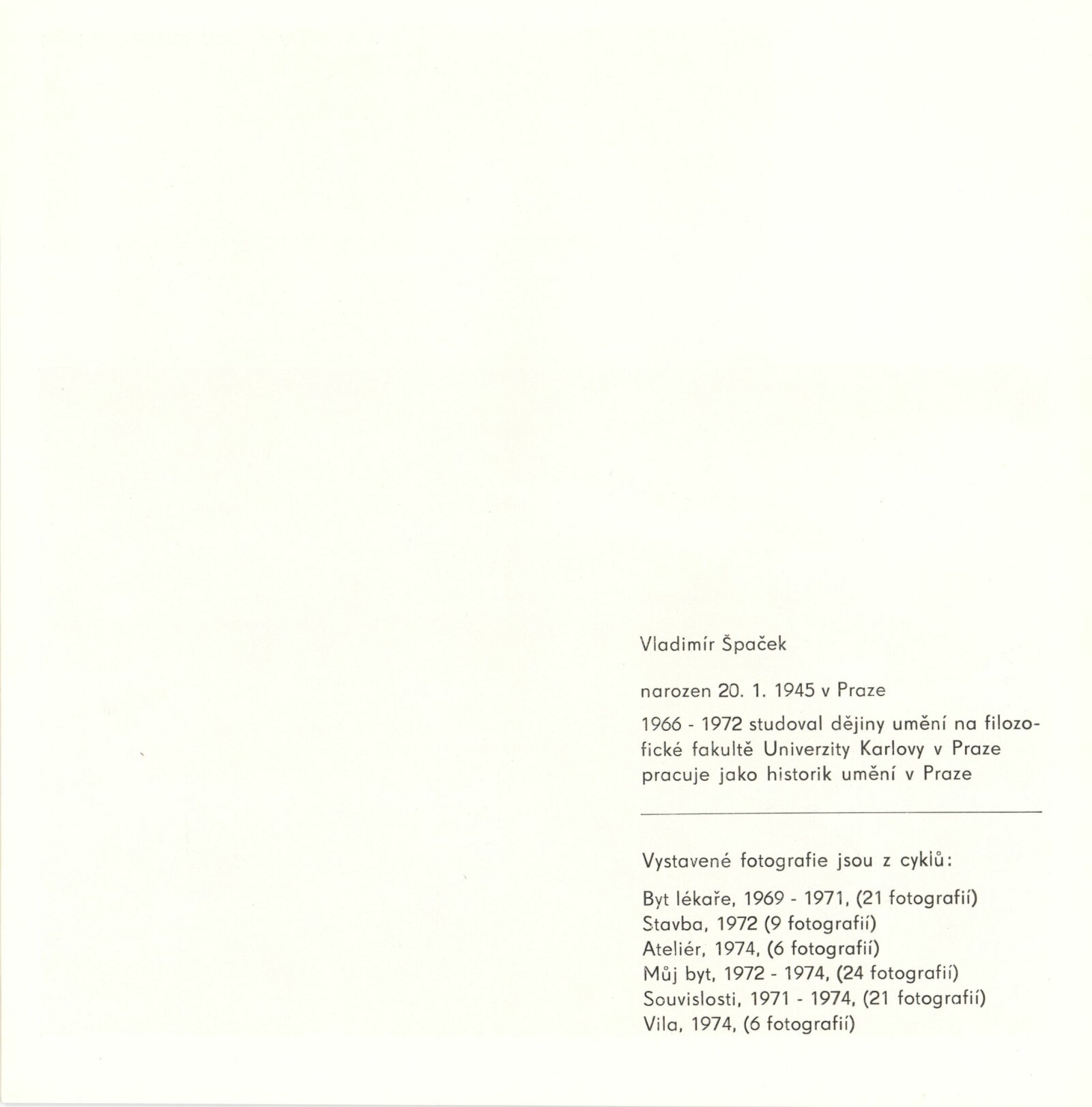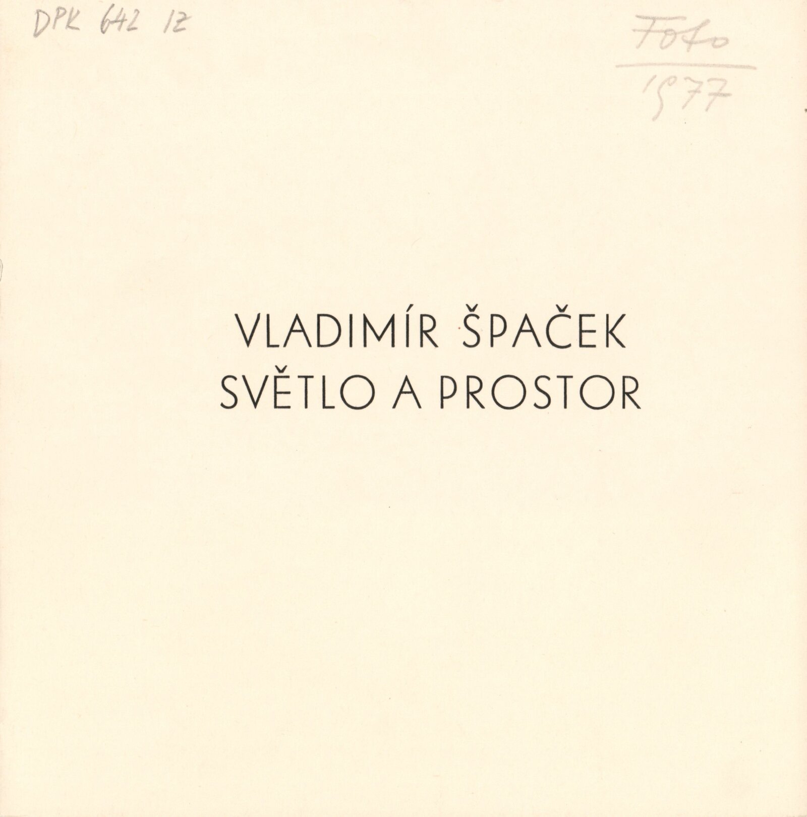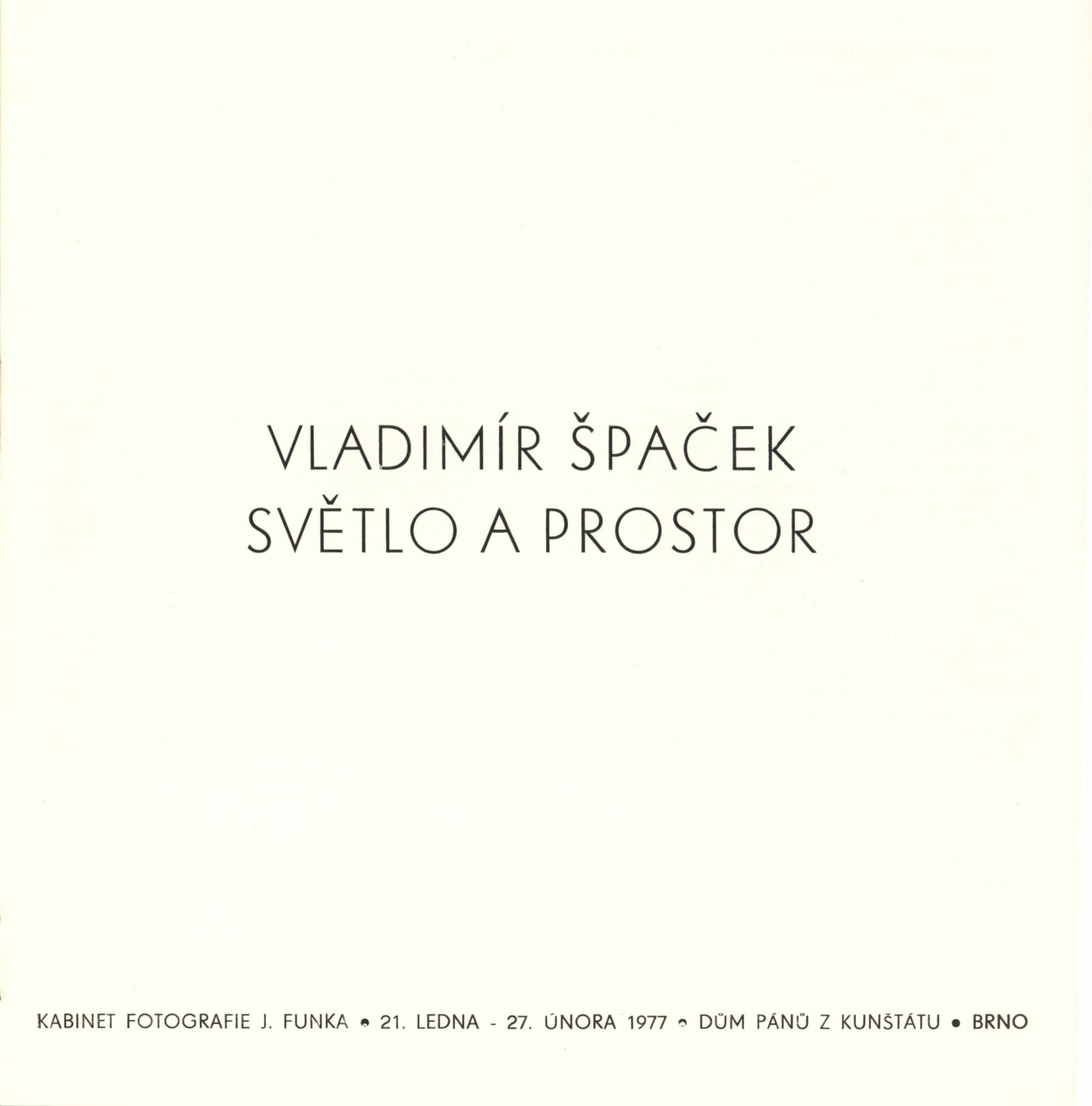 Vladimír Špaček. Světlo a prostor: Dům umění / Dům pánů z Kunštátu, Kabinet fotografie Jaromíra Funka, 21. 1. – 27. 2. 1977 / Text: Petr Wittlich. – Brno: DUmB, 1977. – 12 s., obr., DPK 642. – MZK; MG