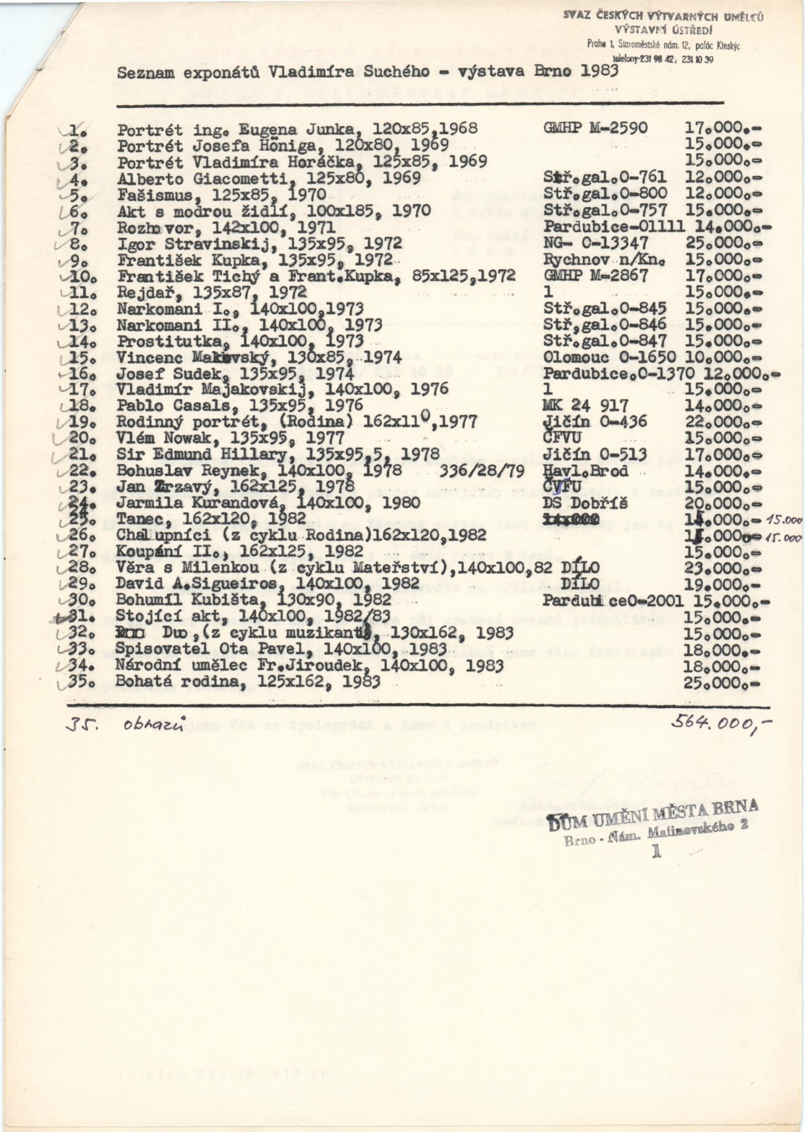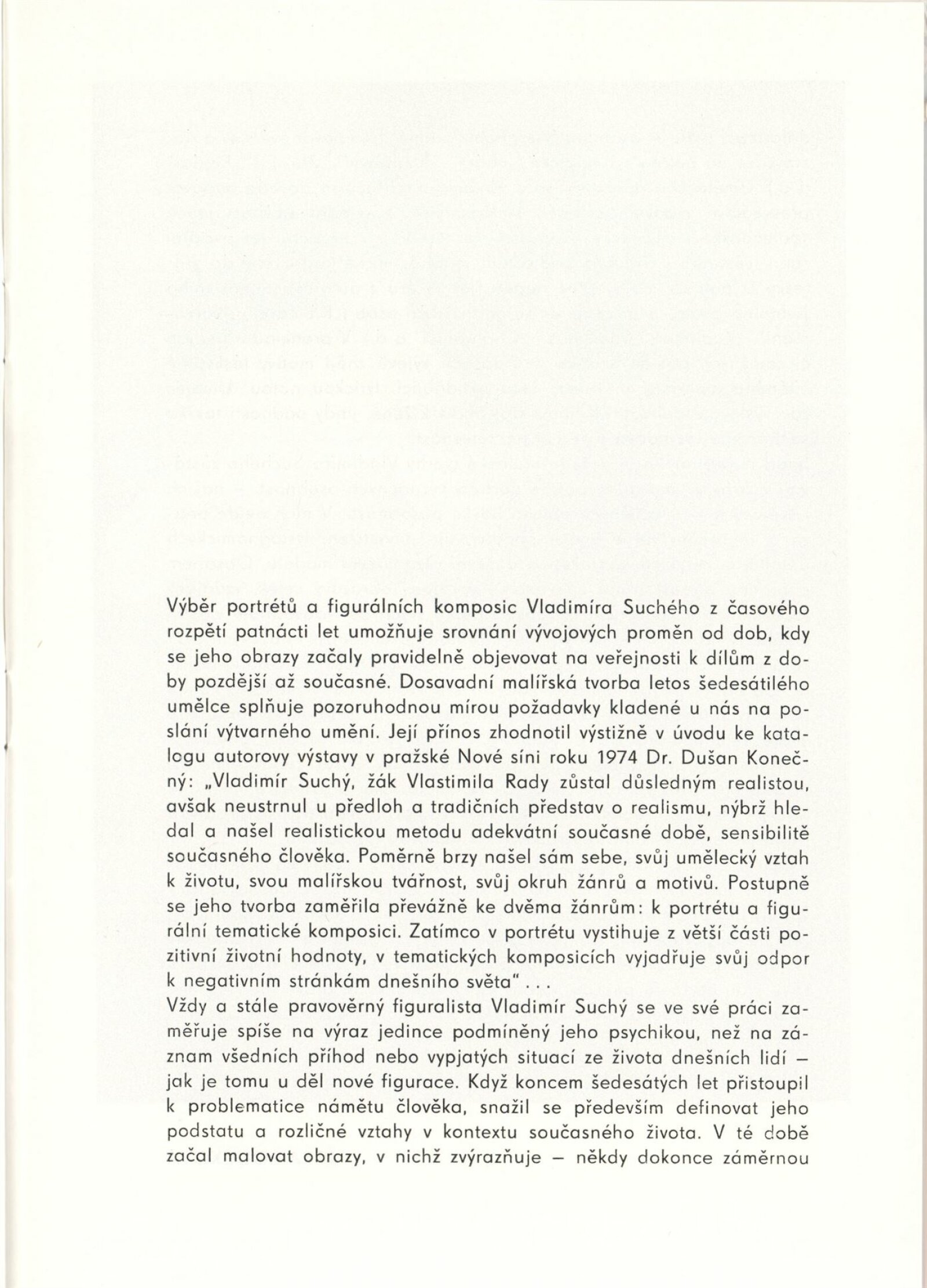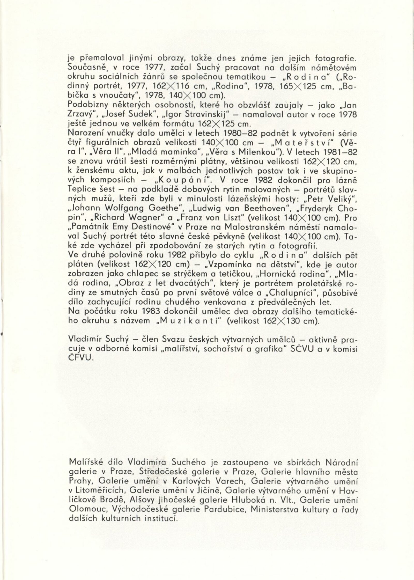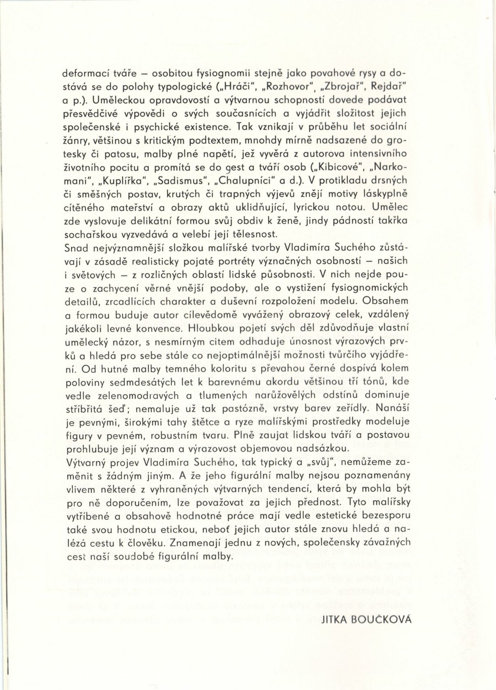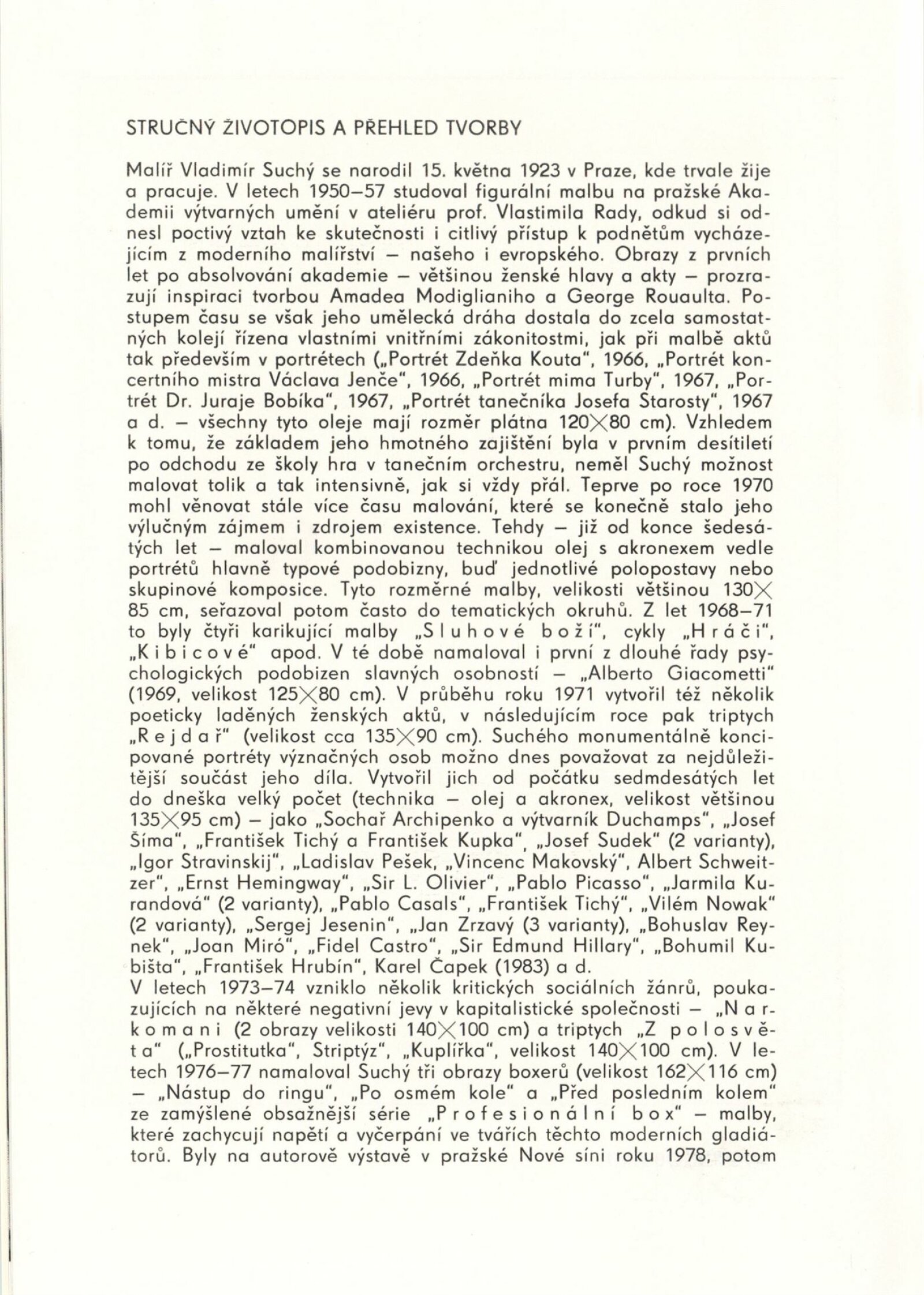 Vladimír Suchý. Obrazy z let 1968–1983: Dům umění, Galerie Jaroslava Krále, 11. 10. – 13. 11. 1983 / Text: Jitka Boučková. – Praha: SČVU, 1983. – 26 s., obr., portrét, životopis, DU 769. – MZK