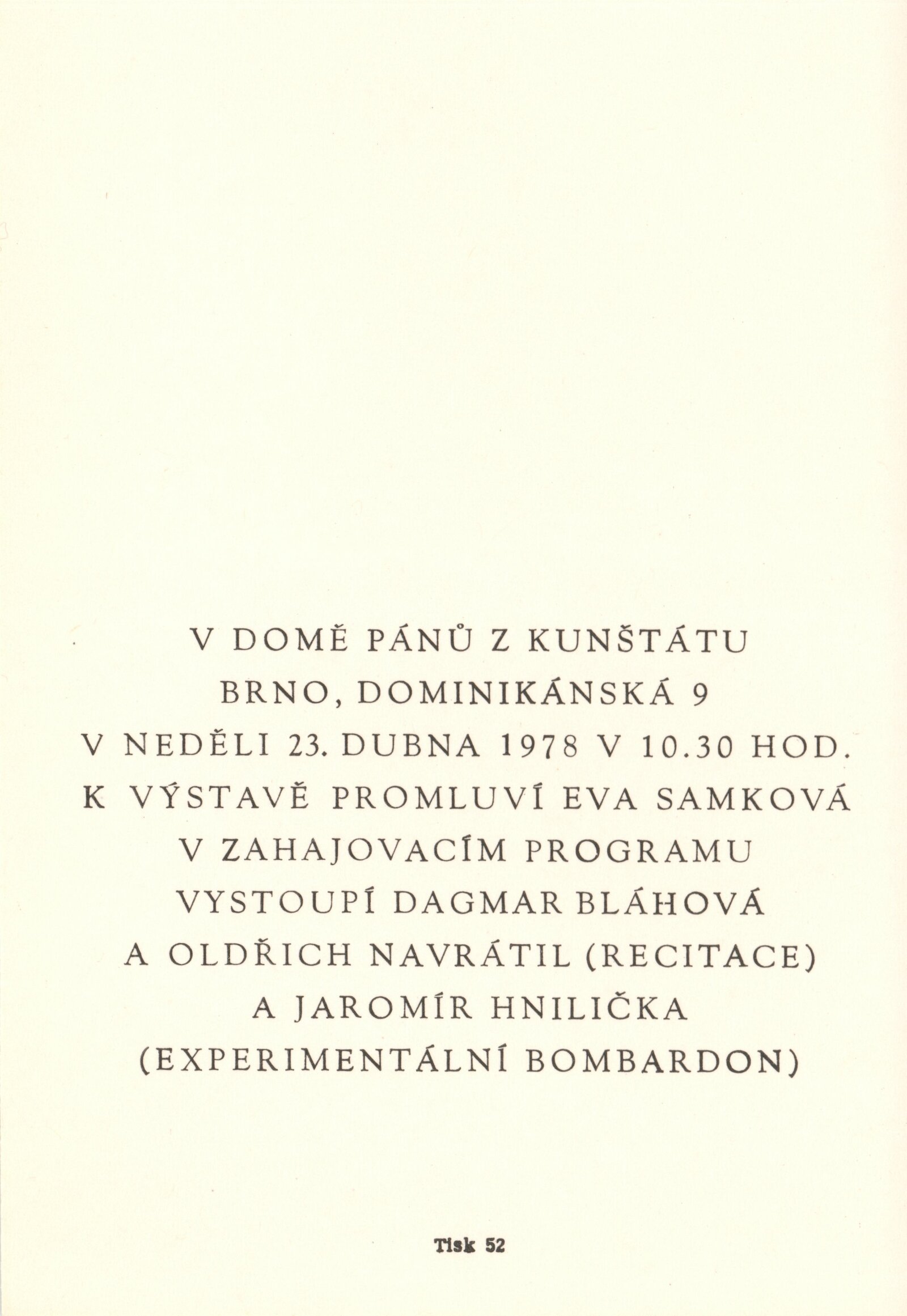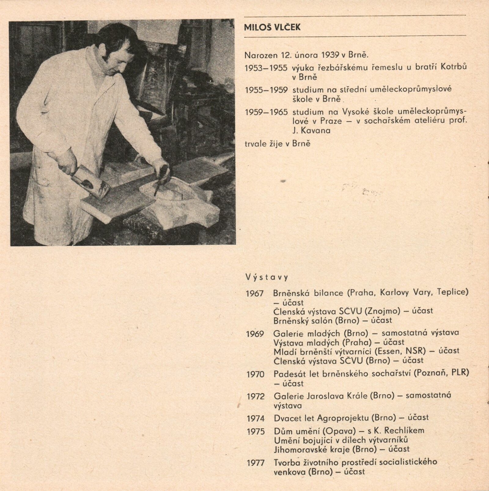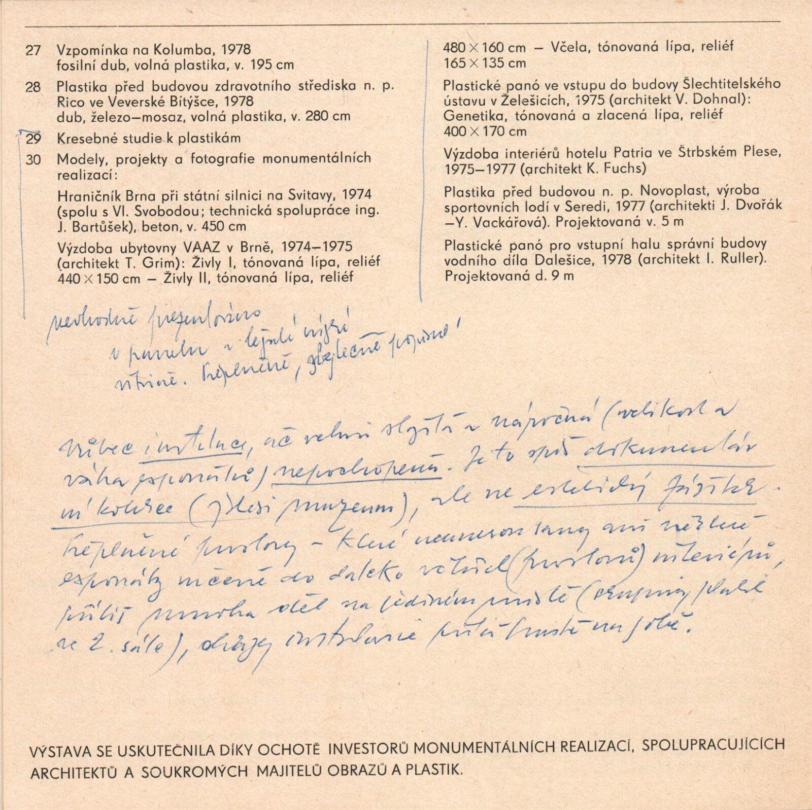 pozvánky, katalog, fotodokumentace děl, strojopis úvodního slova, podklady pro katalog, korespondence – žádost o vyjádření SČVU, provozní korespondence, žádost o povolení výstavy, žádost o výstavu, recenze v tisku