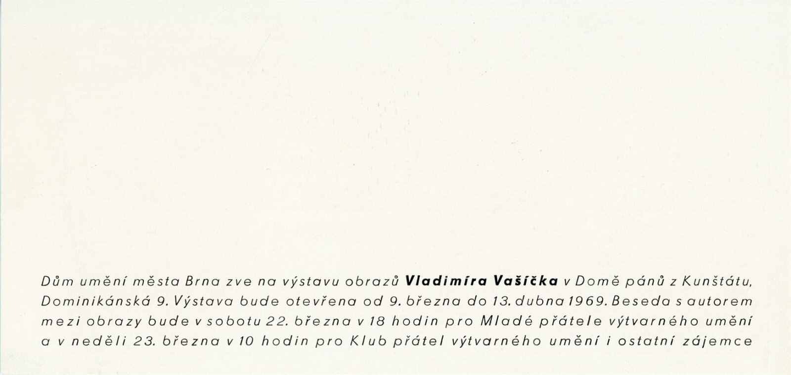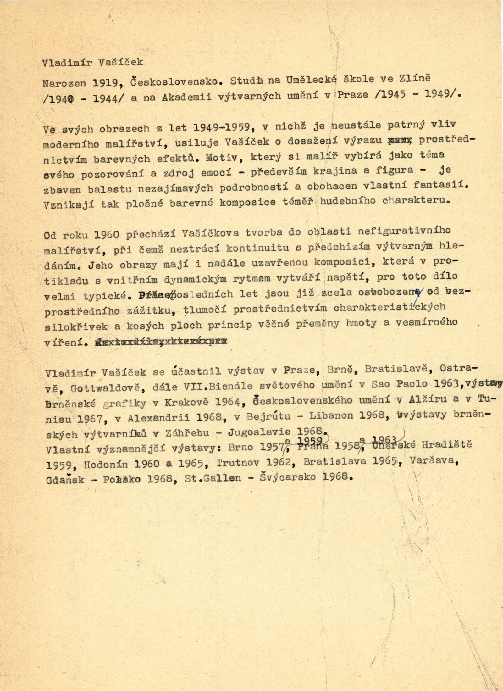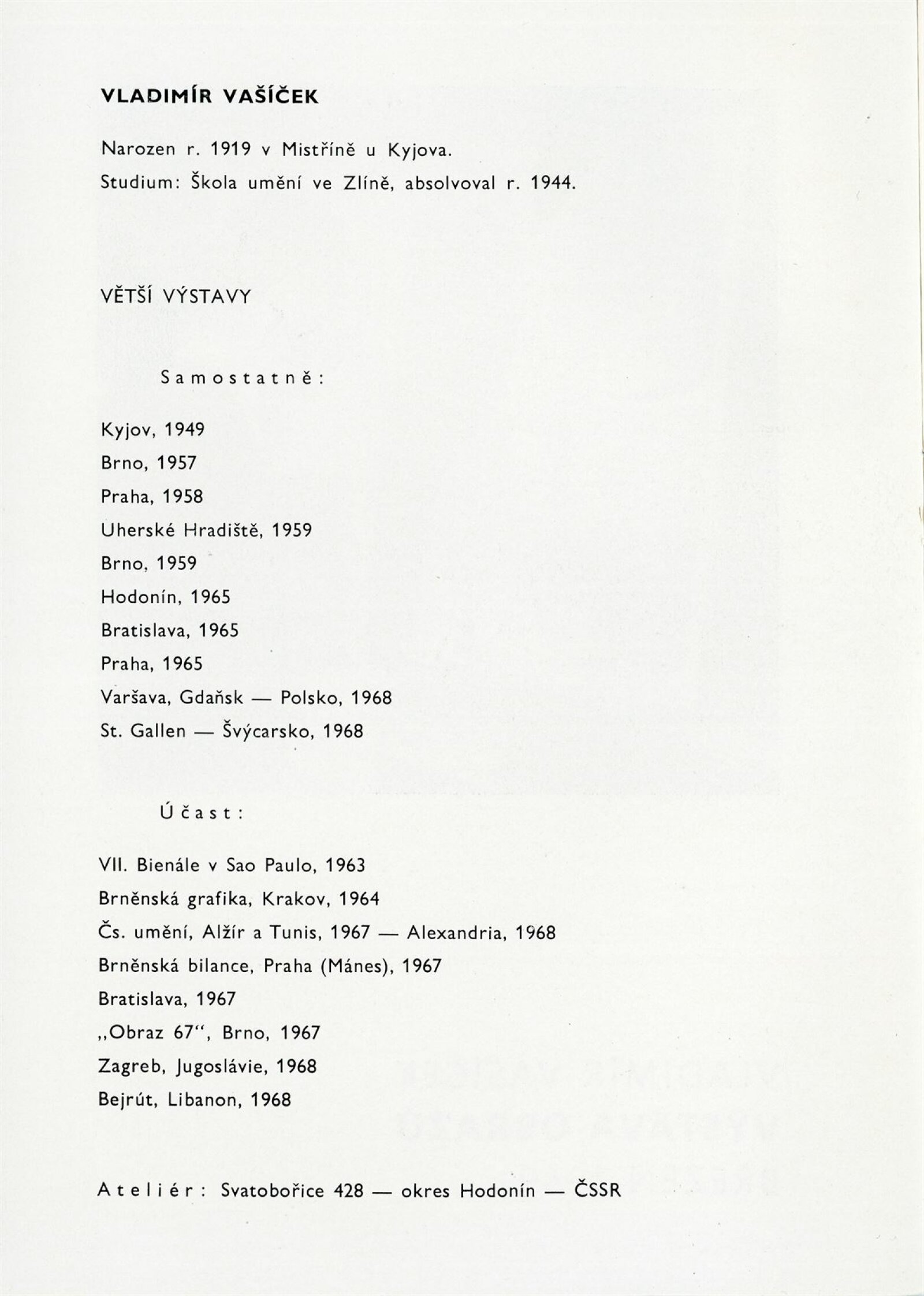 Vladimír Vašíček. Výstava obrazů: Dům umění města Brna / Dům pánů z Kunštátu, 9. 3. – 13. 4. 1969 / Úryvky z recenzí a úvah. – Brno: DUmB, 1969. – 16 s., obr., portrét, životní data, seznam výstav, DPK 407. – MZK; MG; MMB