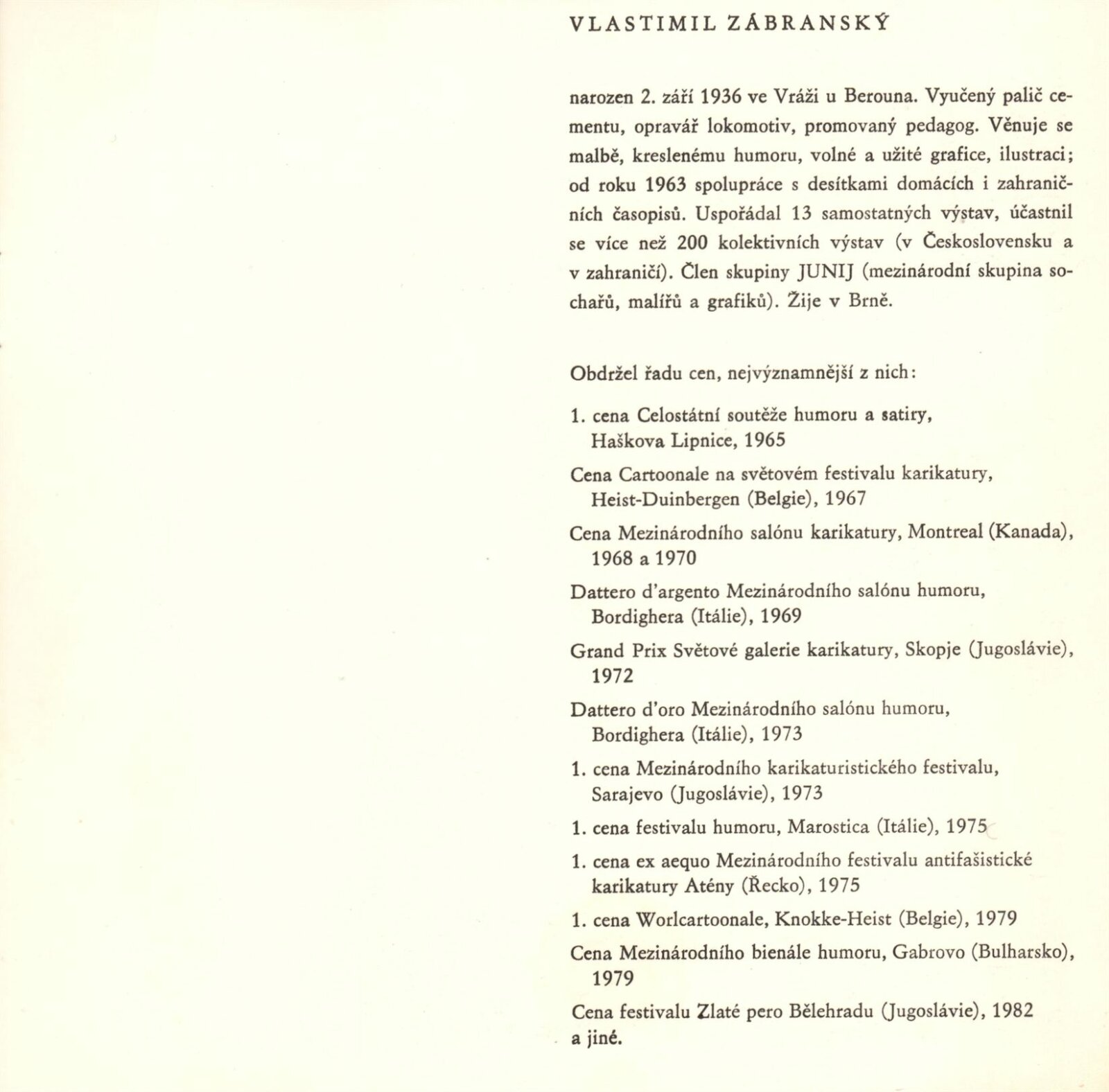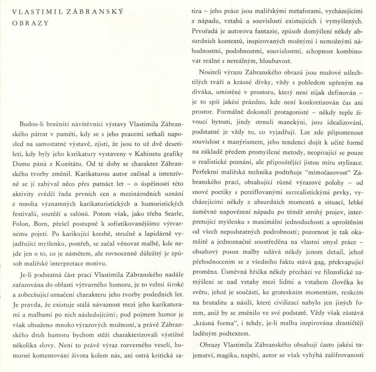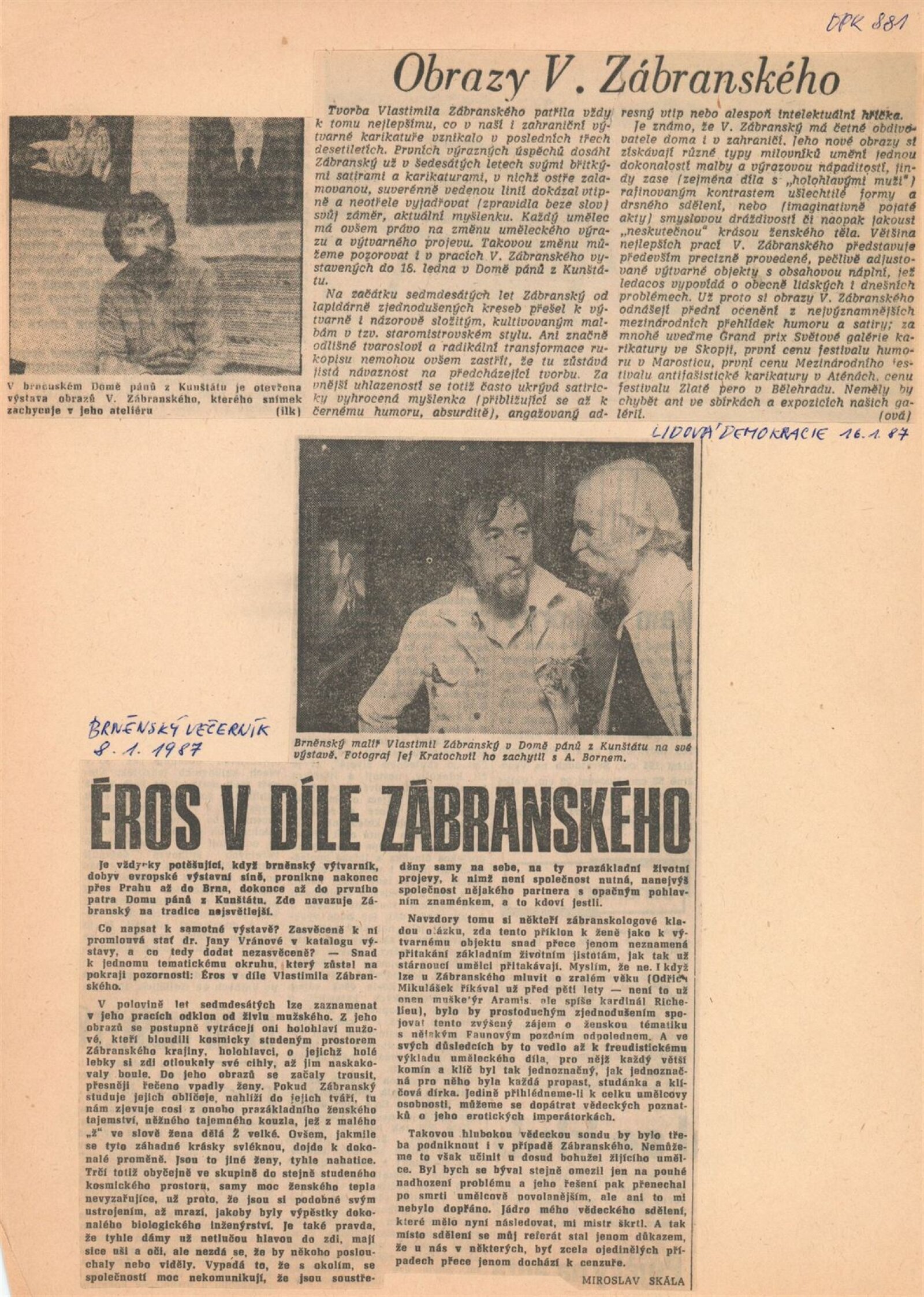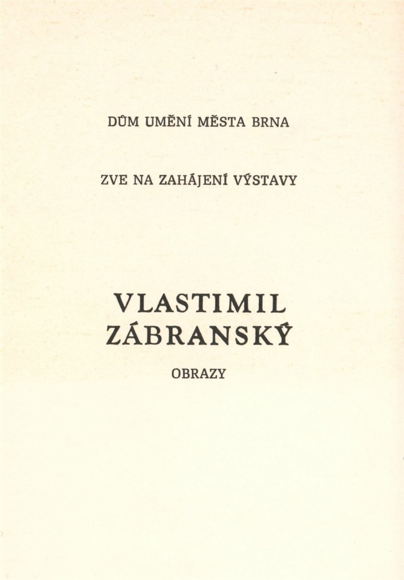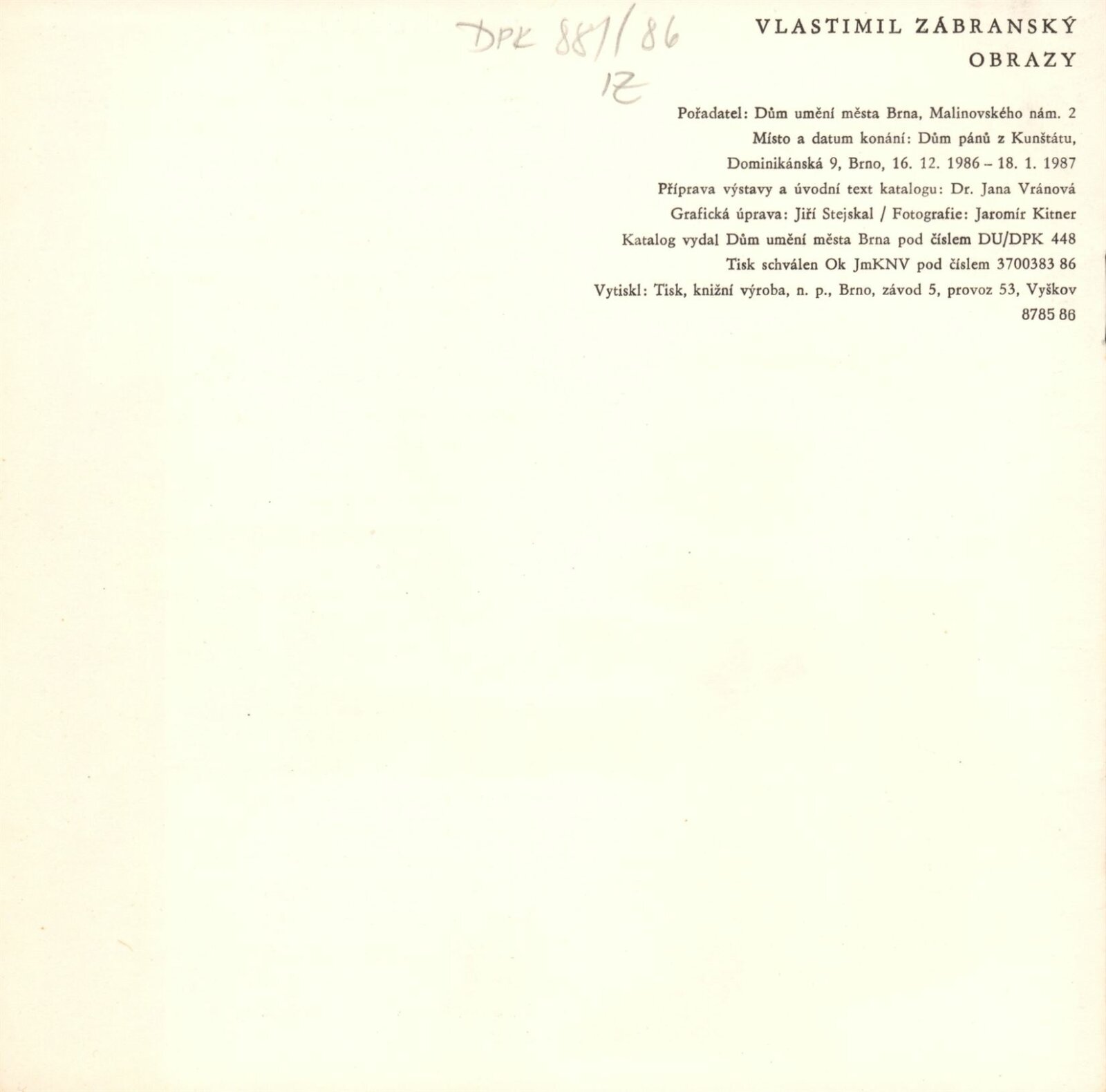 Vlastimil Zábranský. Obrazy: Dům umění / Dům pánů z Kunštátu, 16. 12. 1986 – 18. 1. 1987 / Text: Jana Vránová. – Brno: DUmB, 1986. – [16] s., obr., životopis, seznam cen, DPK 881;. – MZK; MG; MMB