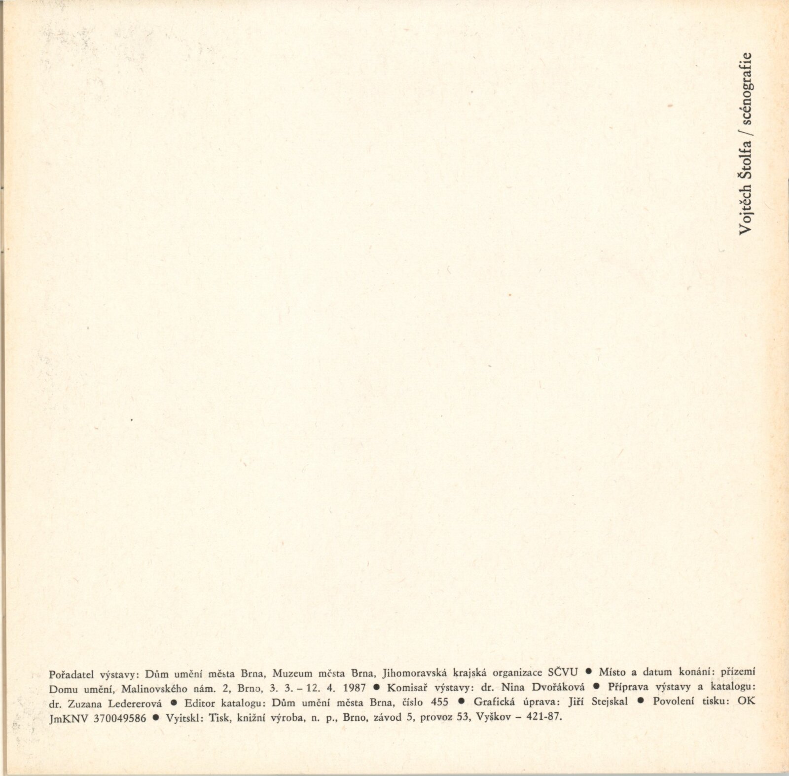 Vojtěch Štolfa. Scénografie: Dům umění města Brna, 3. 3. – 12. 4. 1987 / Text: Zuzana Ledererová. – Brno: DUmB, 1987. – [16] s., obr., životní data, DU 833. – MZK; MG; MMB