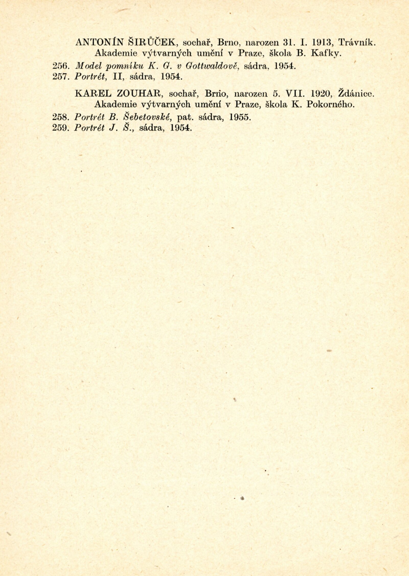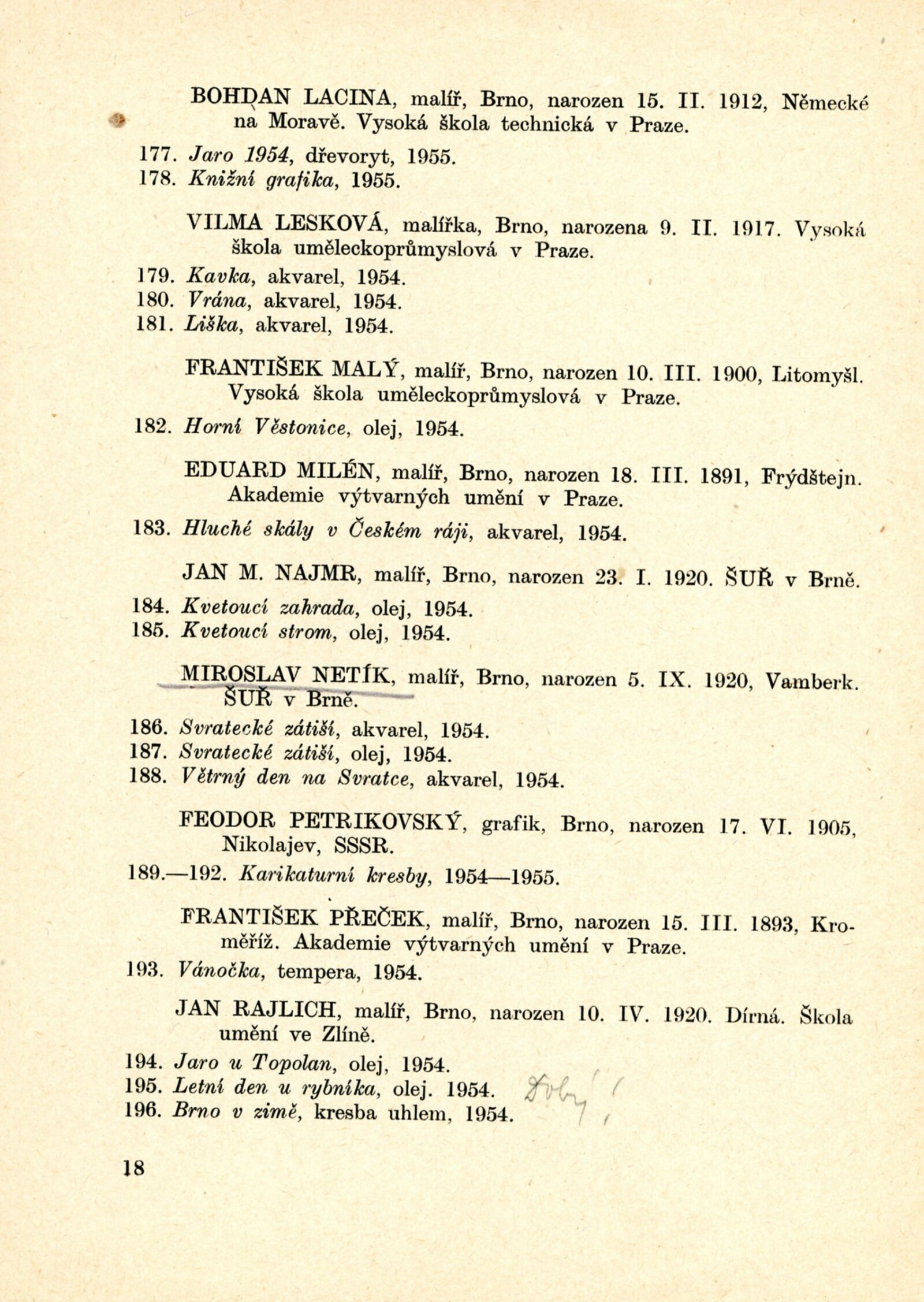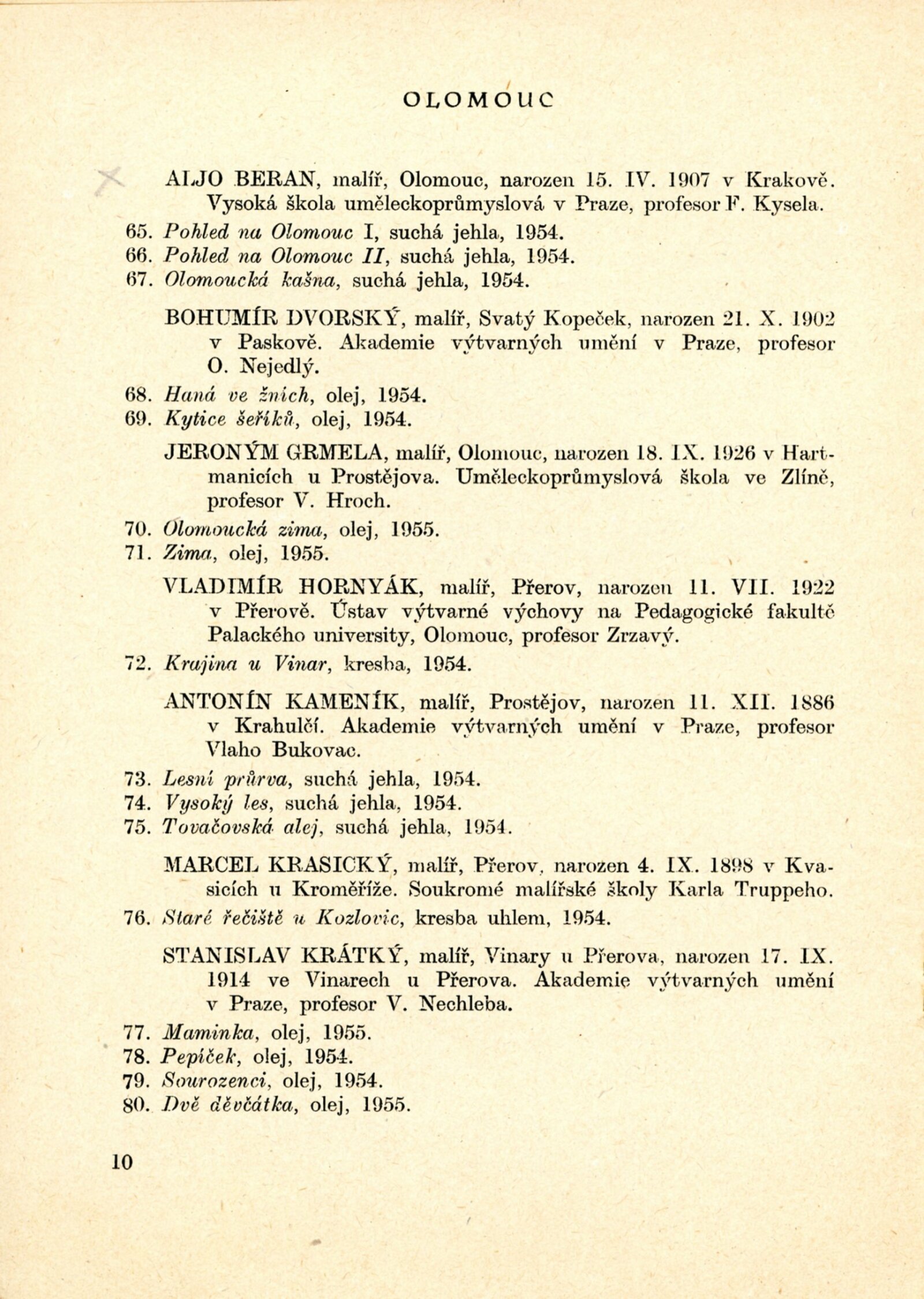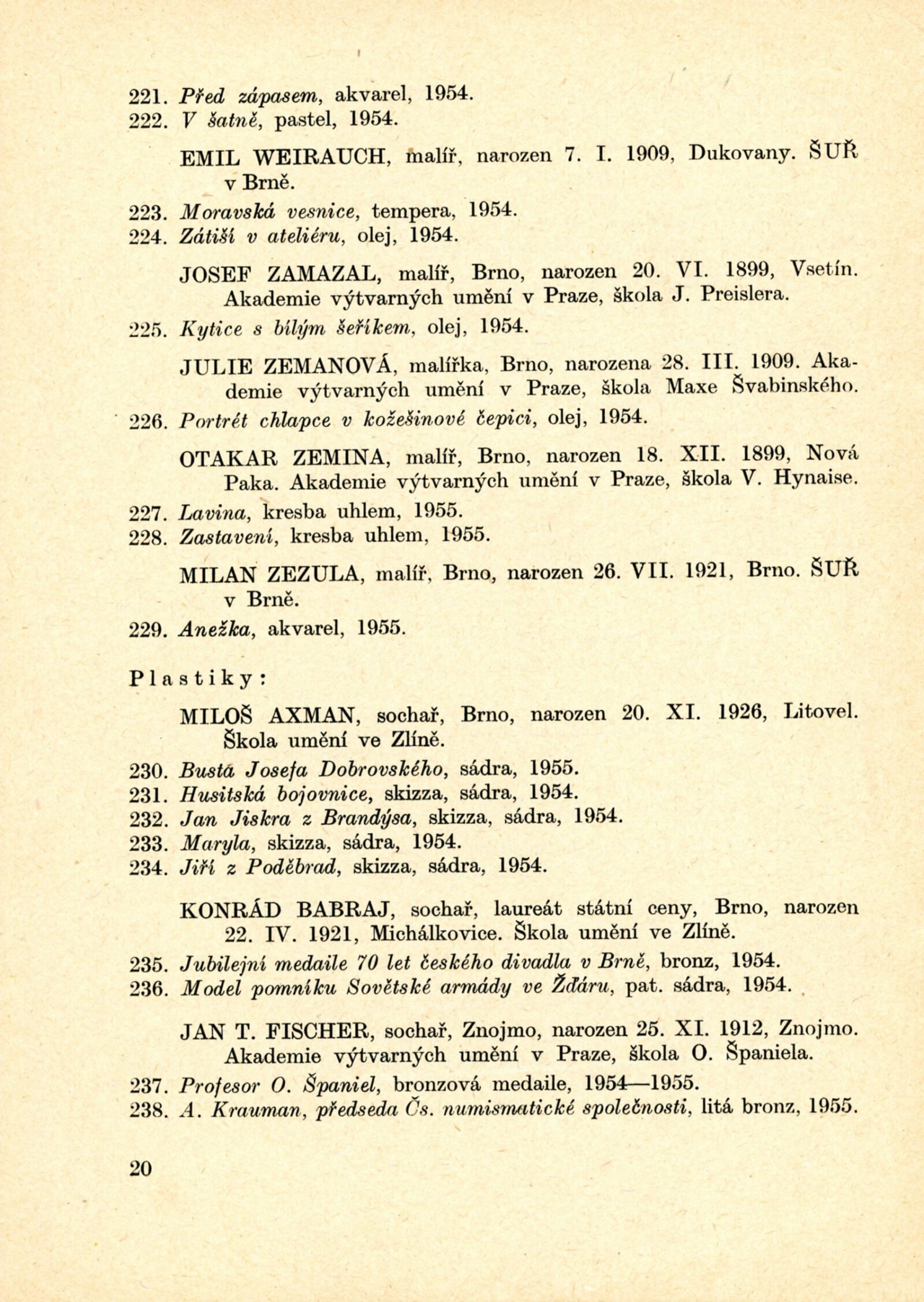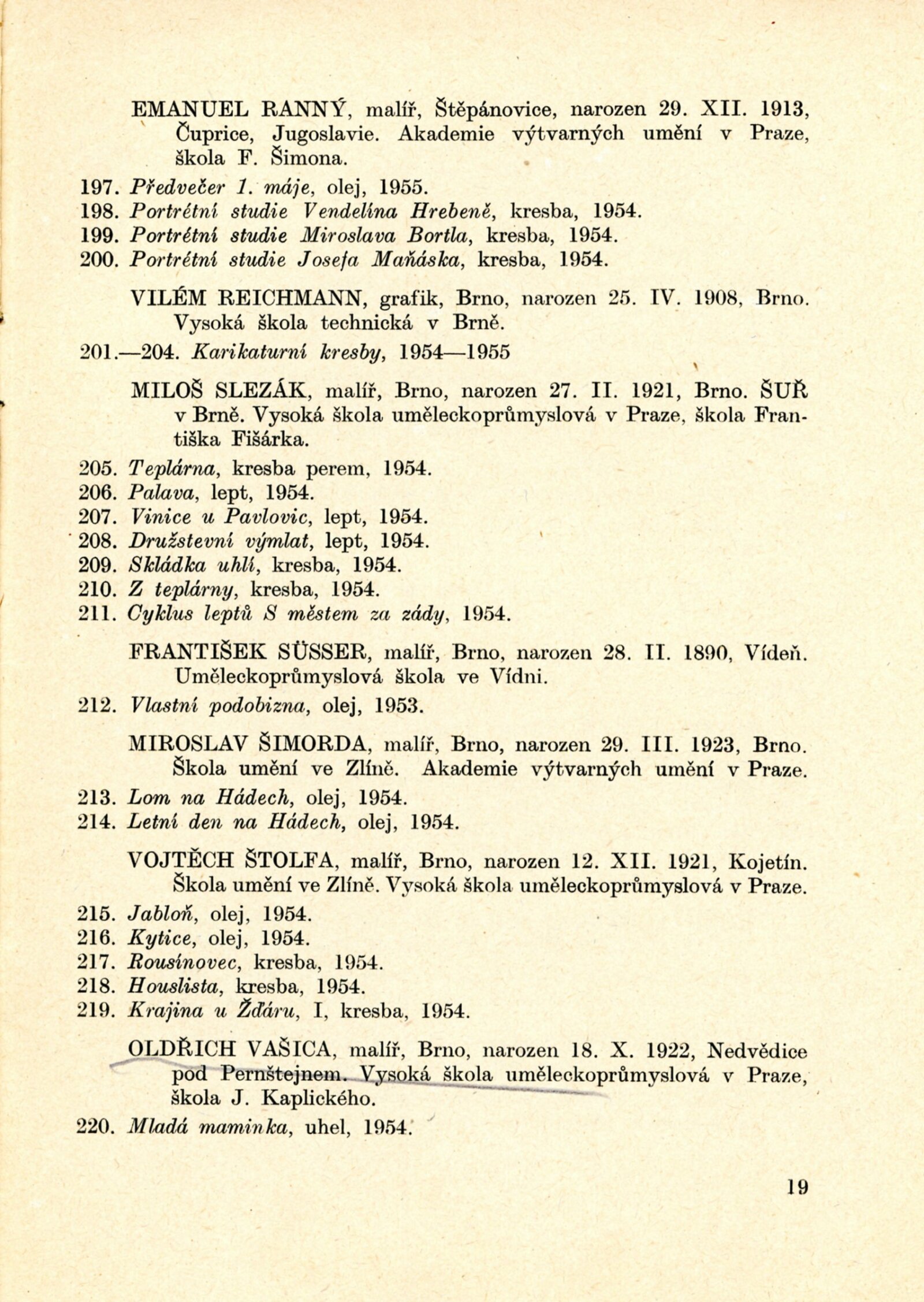Výstava obrazů, plastik a grafiky krajských středisek Brno, Gottwaldov, Olomouc, Ostrava: Dům umění města Brna, 4. 6. – 5. 7. 1955 / Text: J. B. Svrček. – Brno: ÚSČSVU, 1955. – 21 s., životní data vystavujících umělců, DU 219. – MZK