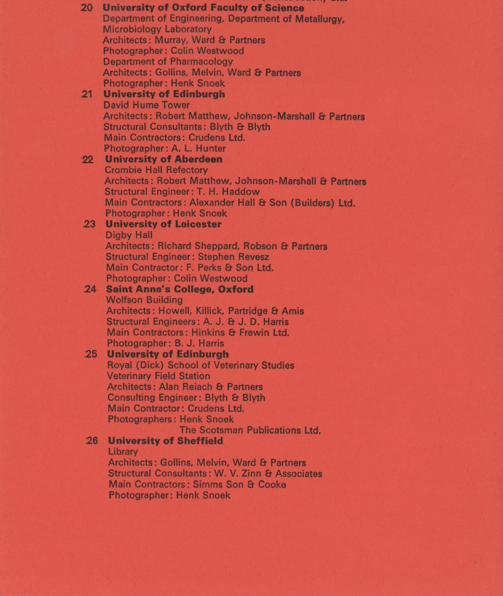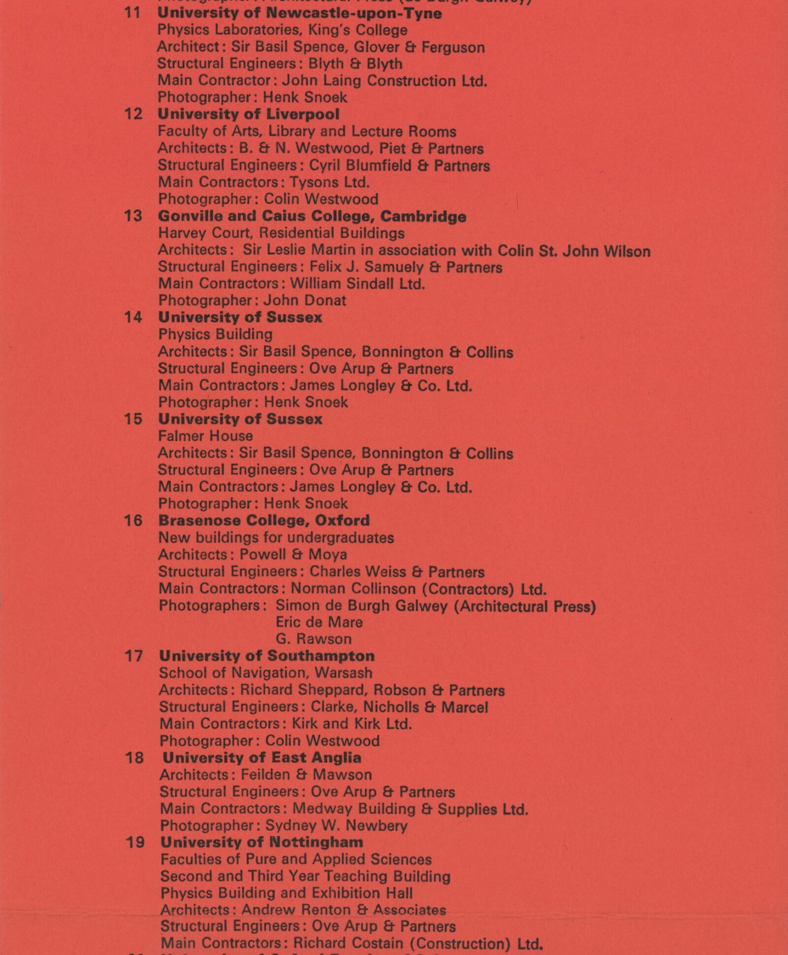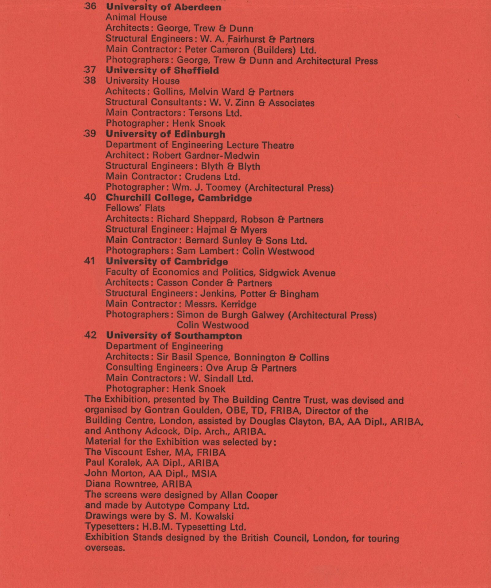 Výstavba britských univerzit (1953–1963): Dům umění města Brna/ Dům pánů z Kunštátu, Kabinet architektury Svazu architektů ČSSR, 10. 3. – 9. 4. 1967/ Převzatý katalog. University Building in Britain 1953–1963: The Building Centre Trust, Londýn, 1964?/ Londýn. – skládačka, 8 s., DPK 336