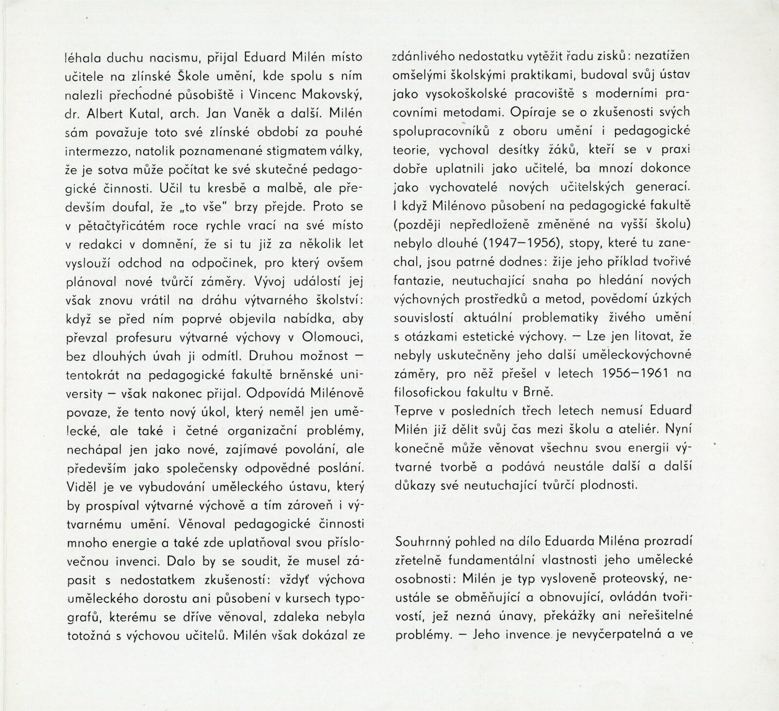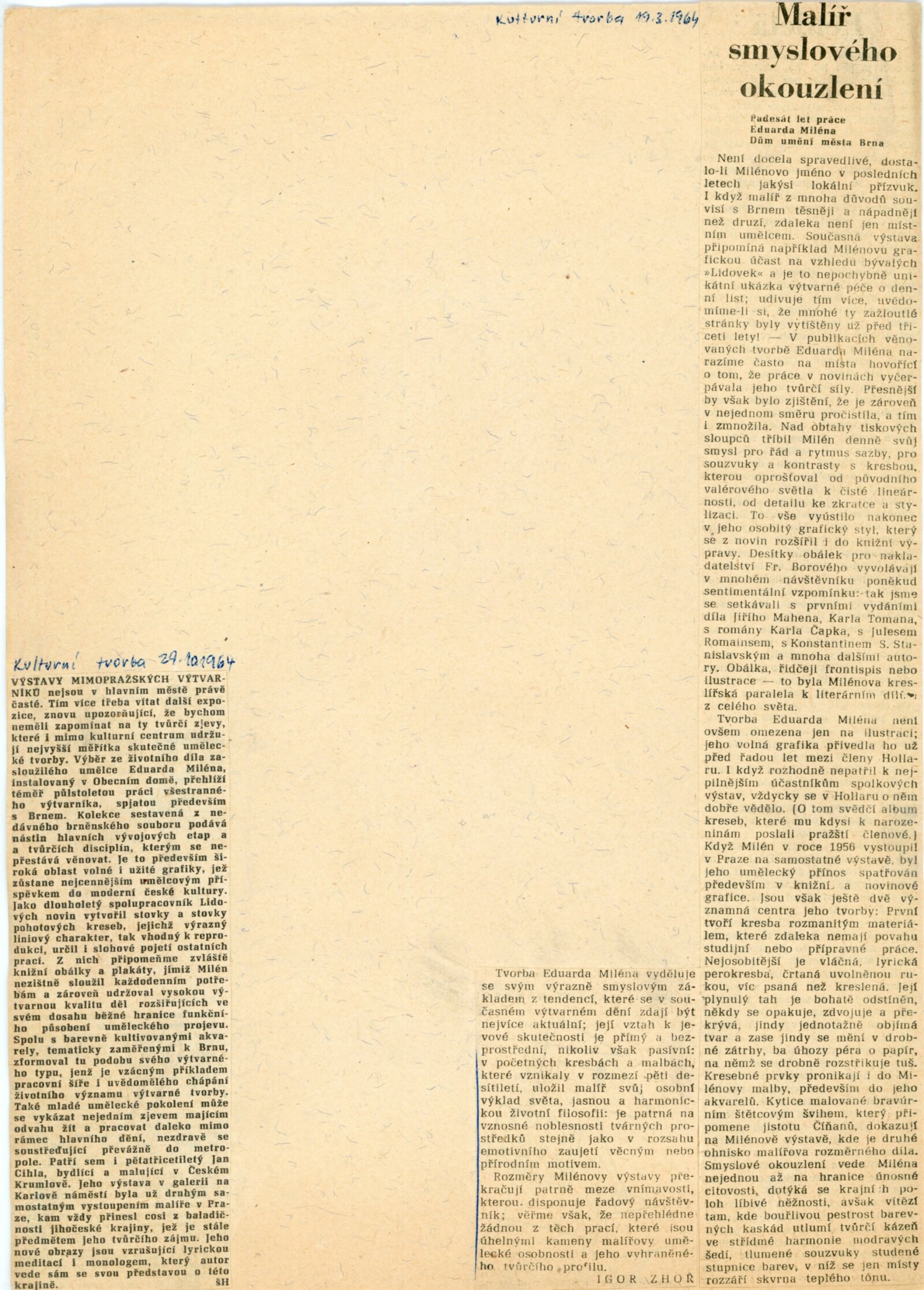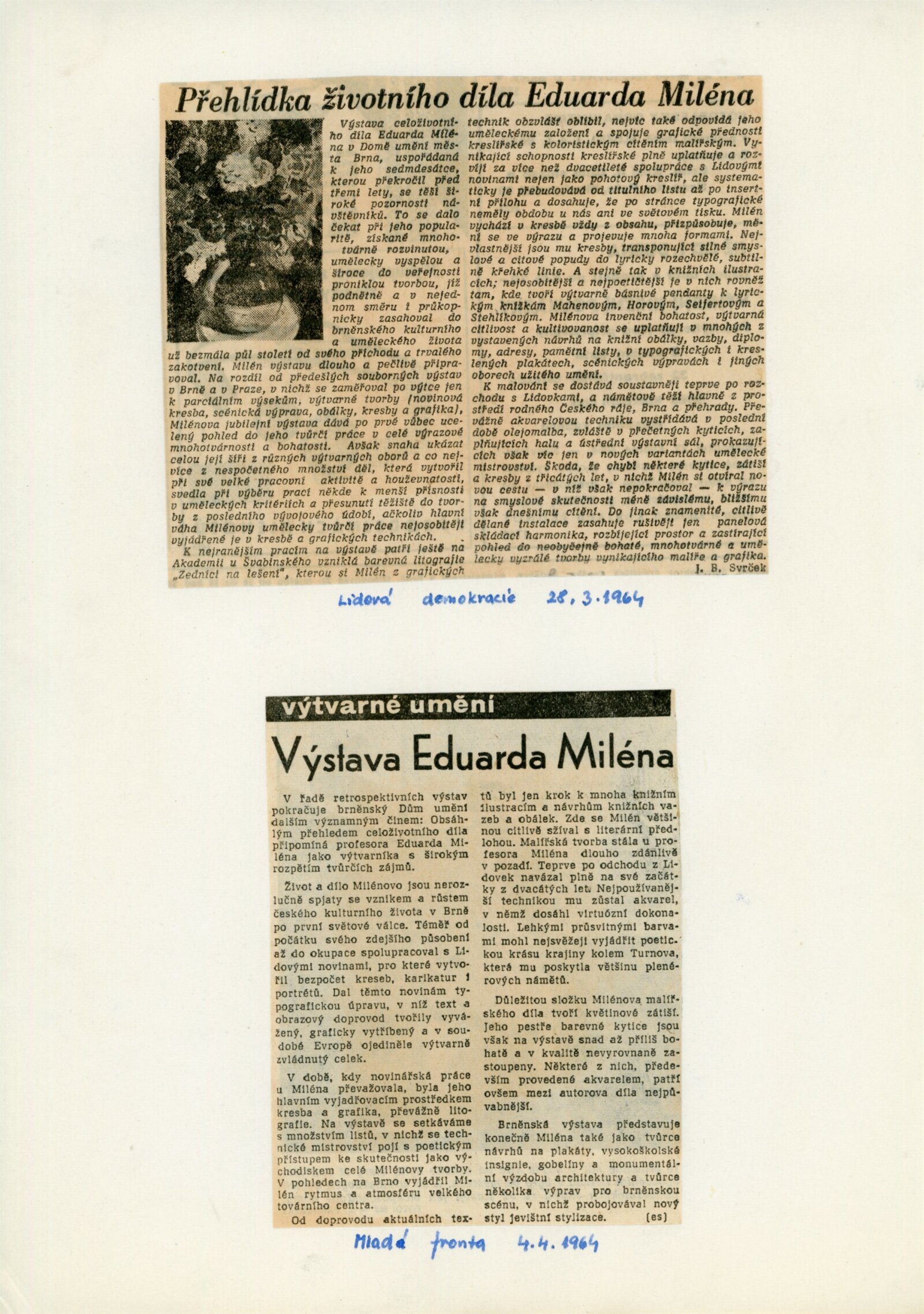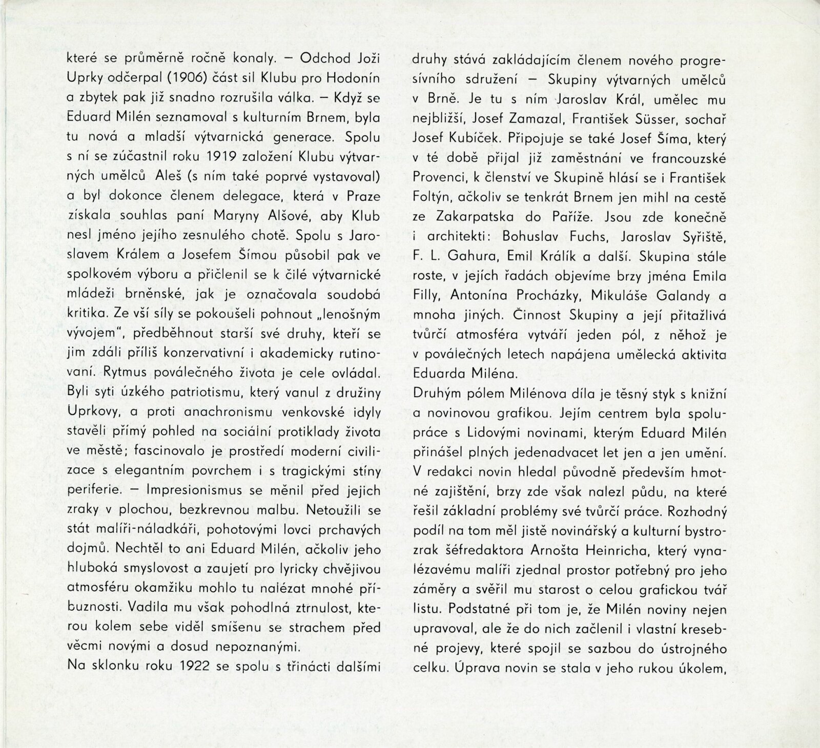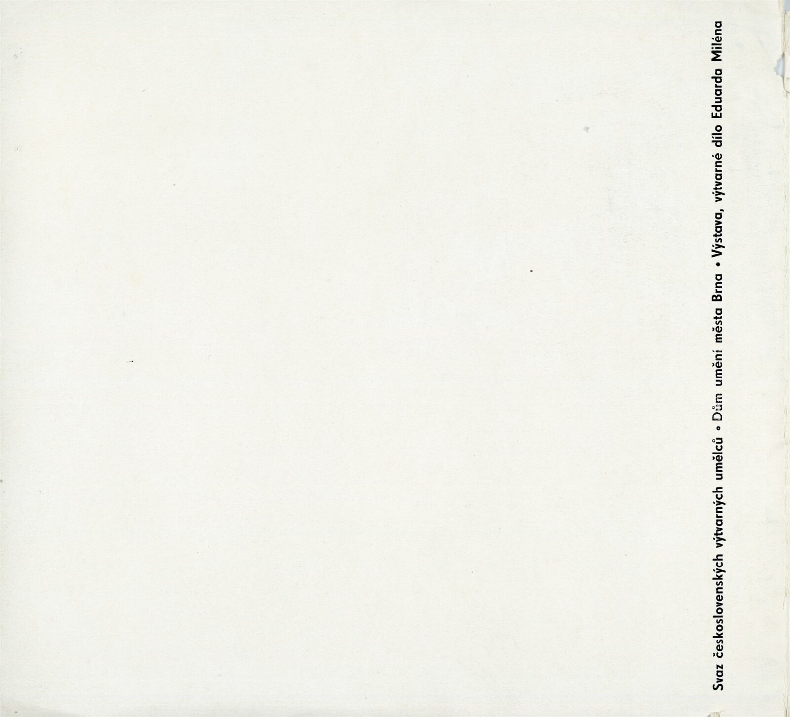Výstava, výtvarné dílo Eduarda Miléna: Dům umění města Brna, 1. 3. – 20. 4. 1964 / Text: Igor Zhoř. – Brno: DUmB, 1964. – 28 s., obr., báseň Oldřich Mikulášek, DU 429. – MZK; MG; MMB