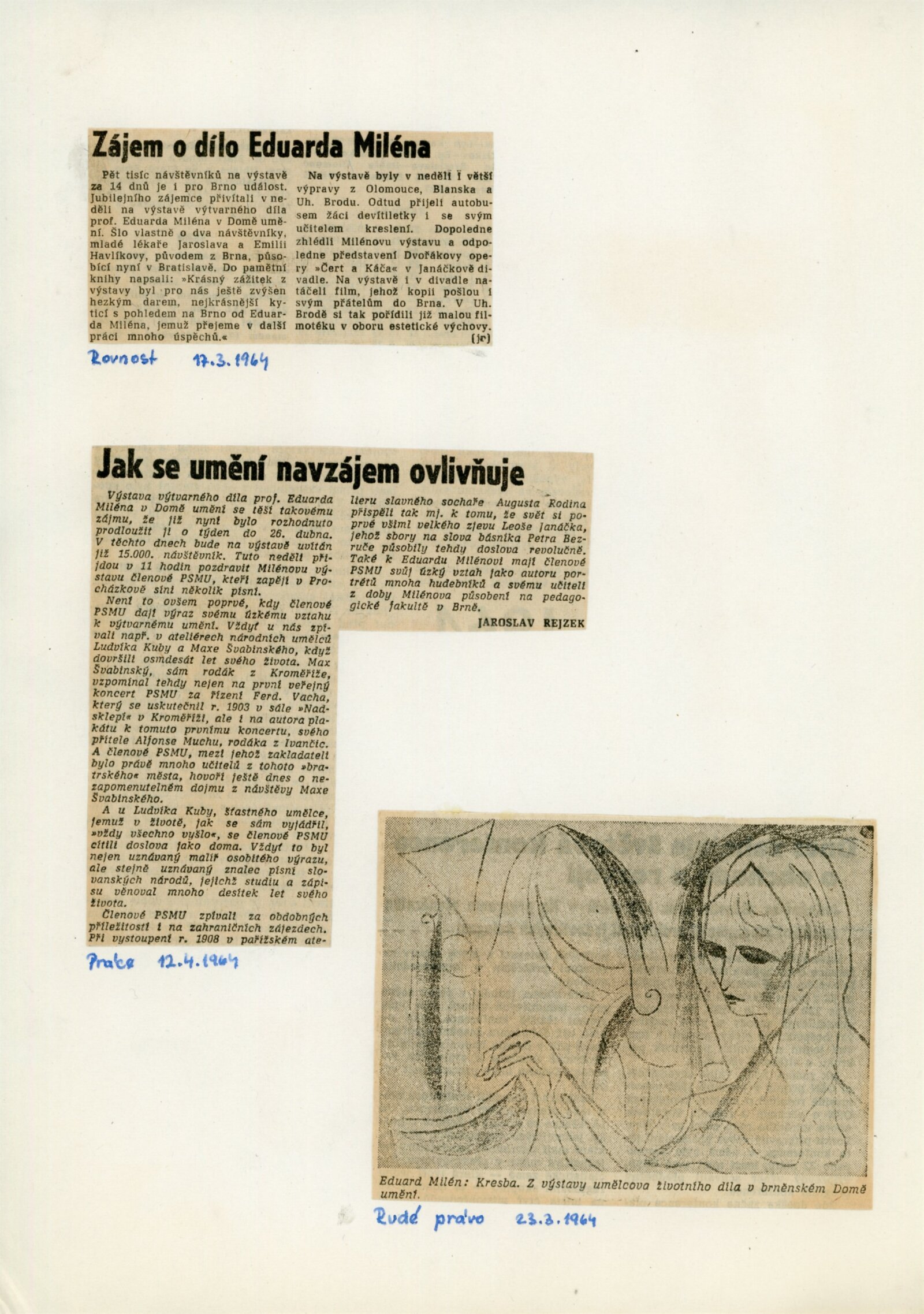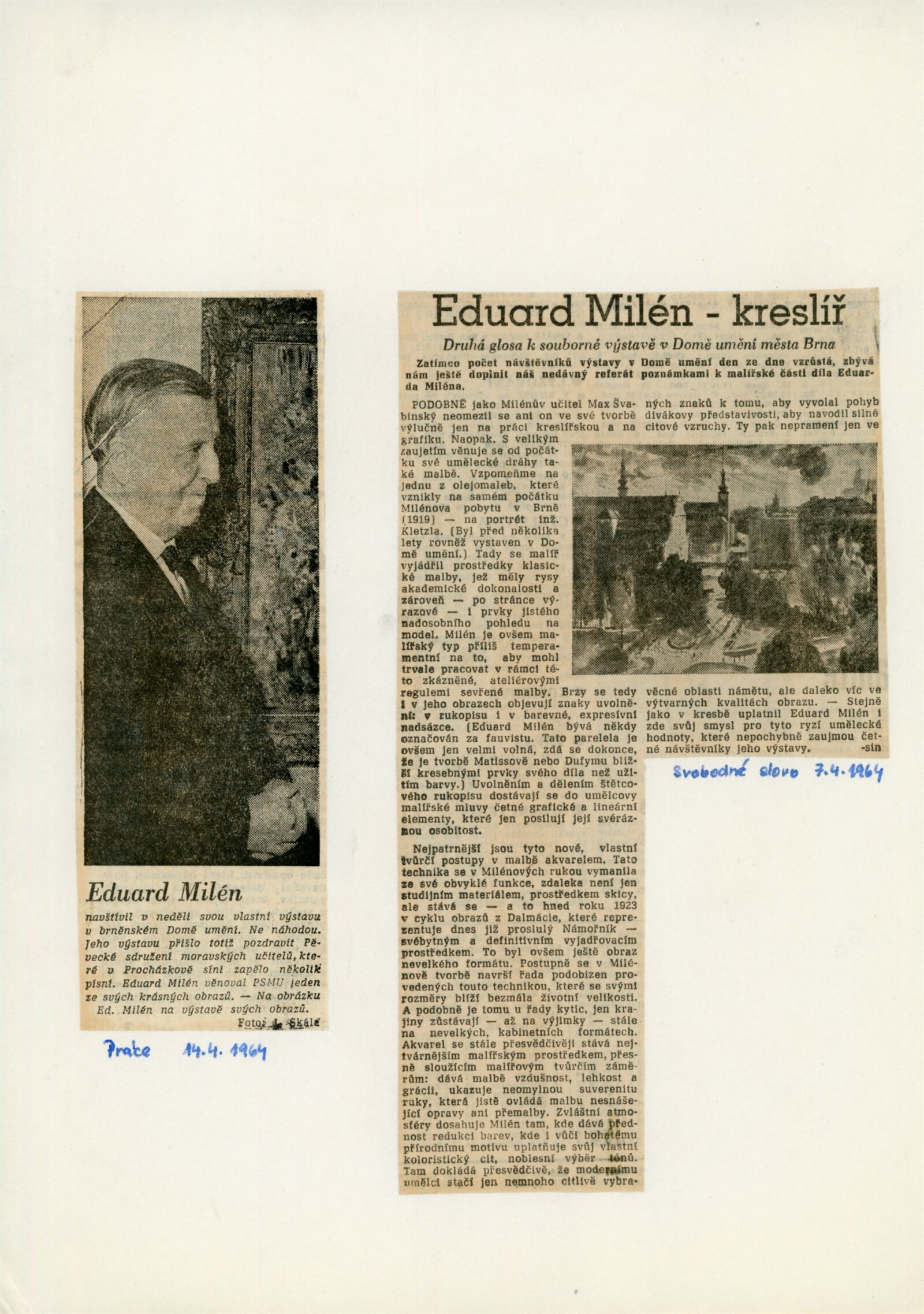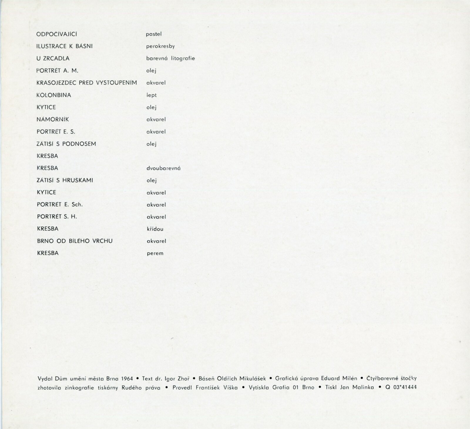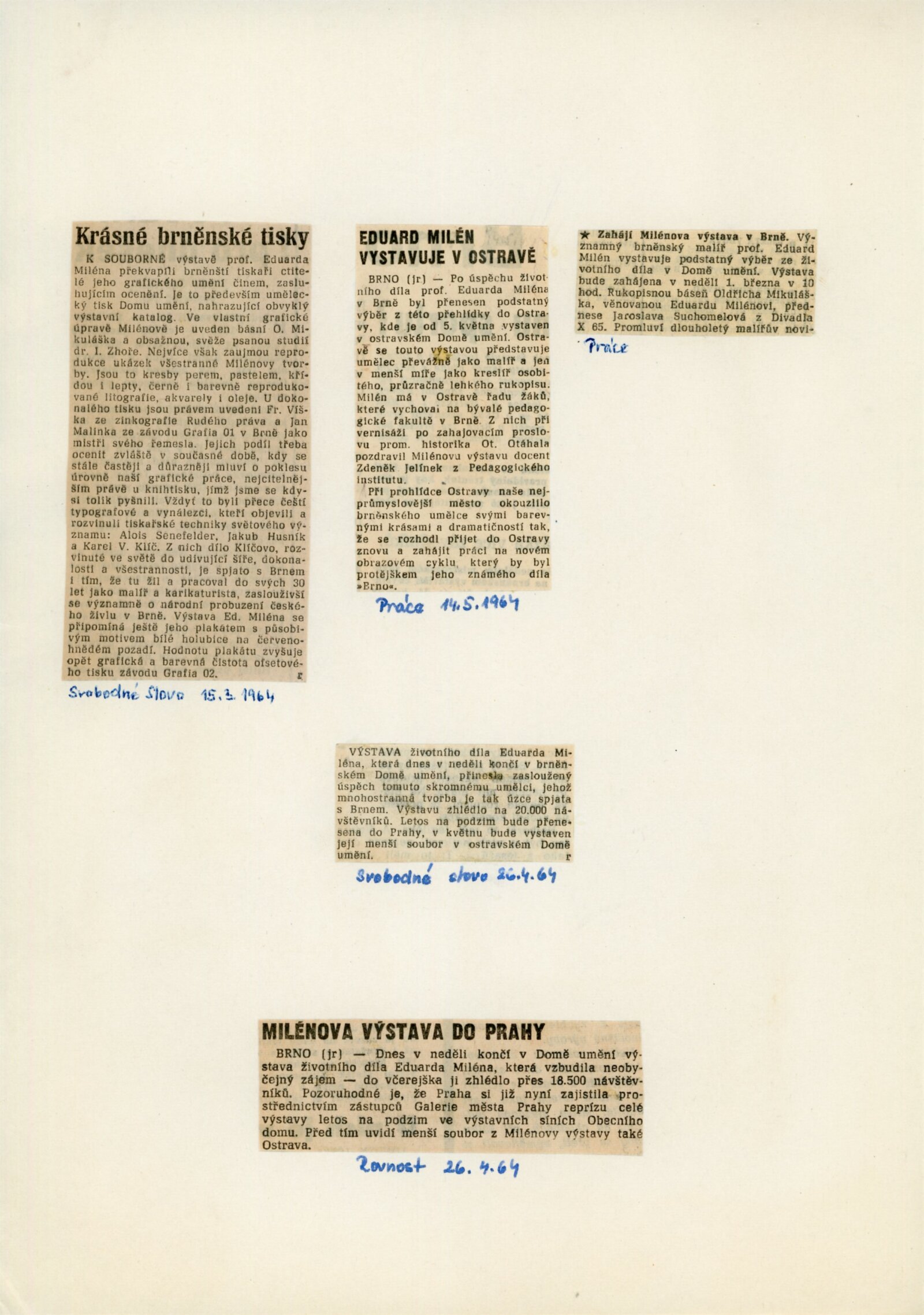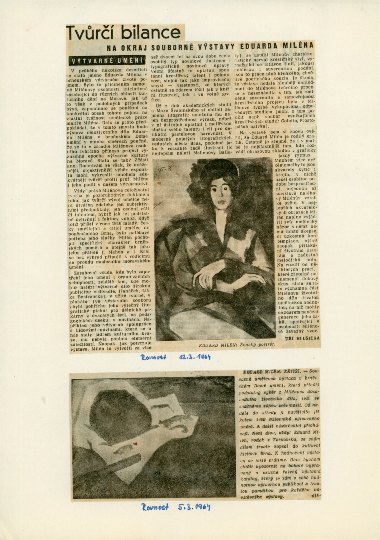 Výstava, výtvarné dílo Eduarda Miléna: Dům umění města Brna, 1. 3. – 20. 4. 1964 / Text: Igor Zhoř. – Brno: DUmB, 1964. – 28 s., obr., báseň Oldřich Mikulášek, DU 429. – MZK; MG; MMB