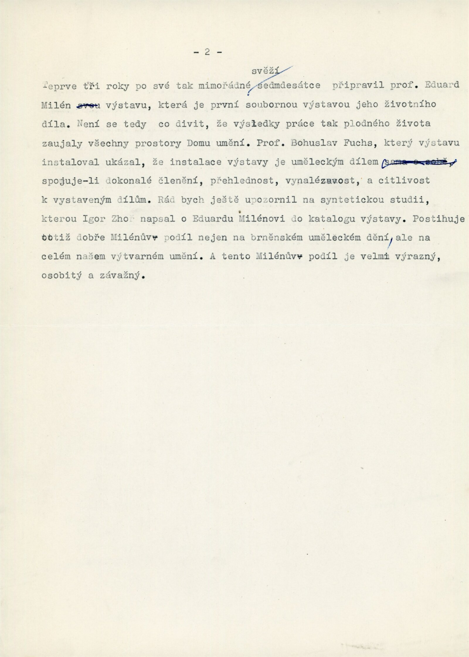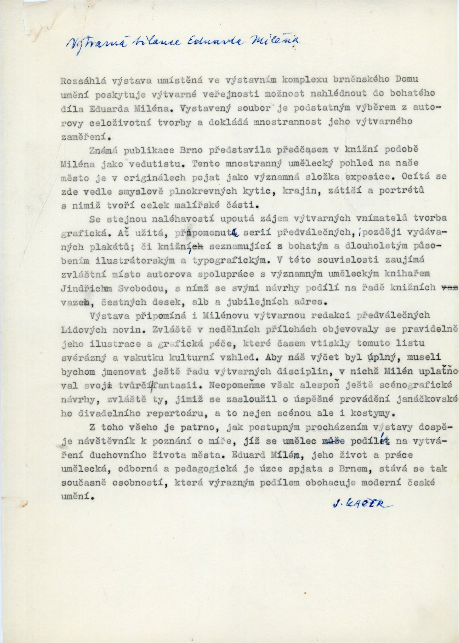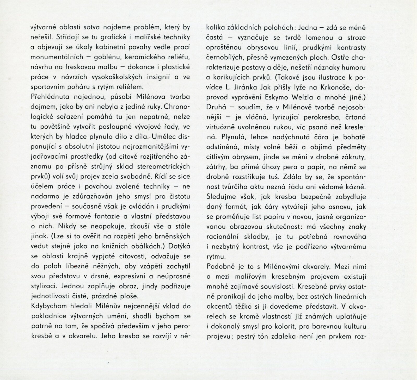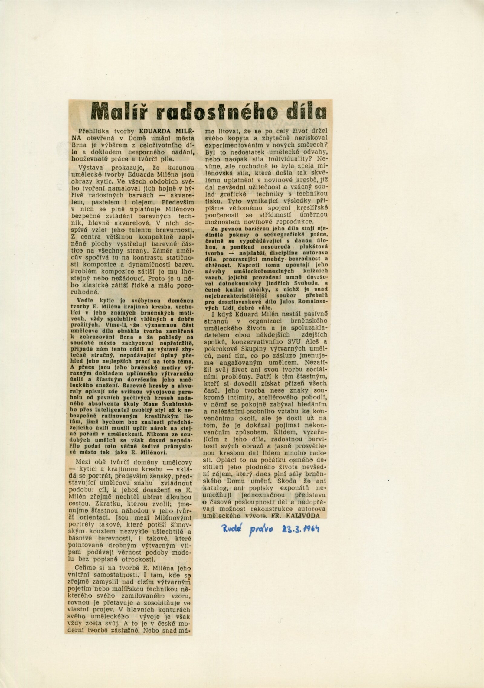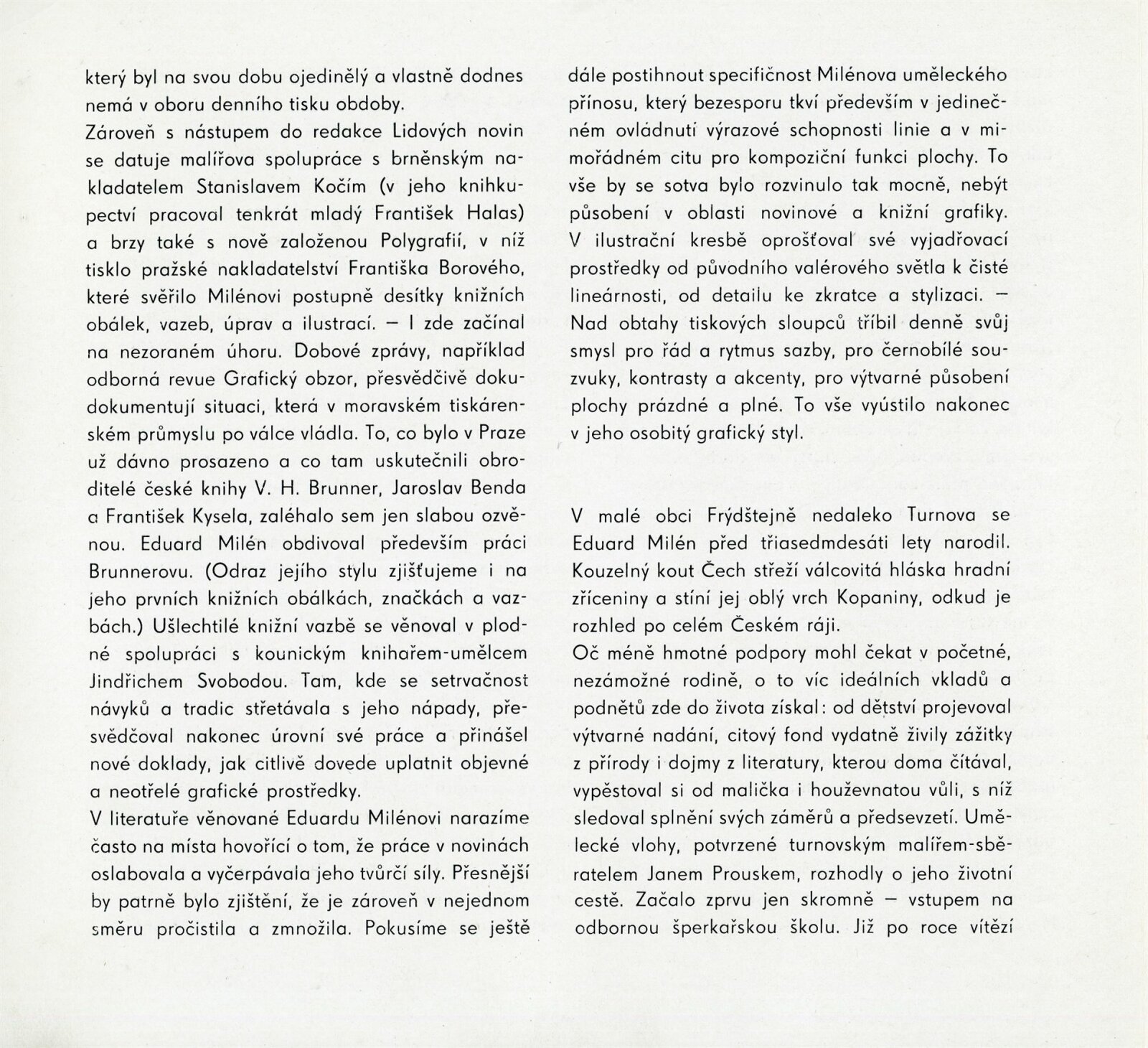 Výstava, výtvarné dílo Eduarda Miléna: Dům umění města Brna, 1. 3. – 20. 4. 1964 / Text: Igor Zhoř. – Brno: DUmB, 1964. – 28 s., obr., báseň Oldřich Mikulášek, DU 429. – MZK; MG; MMB