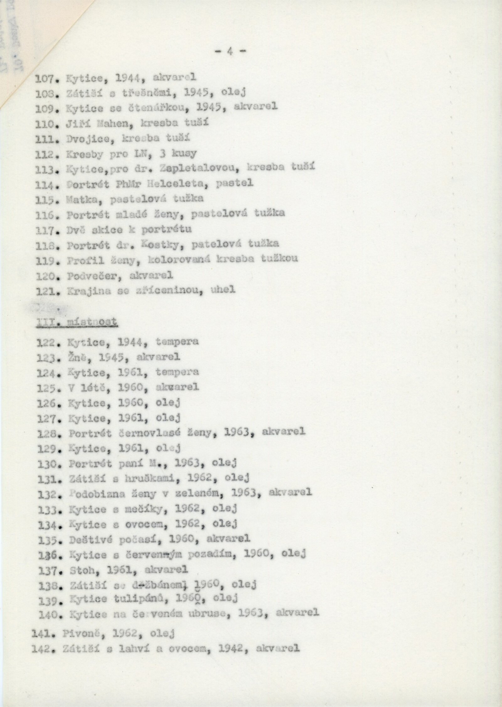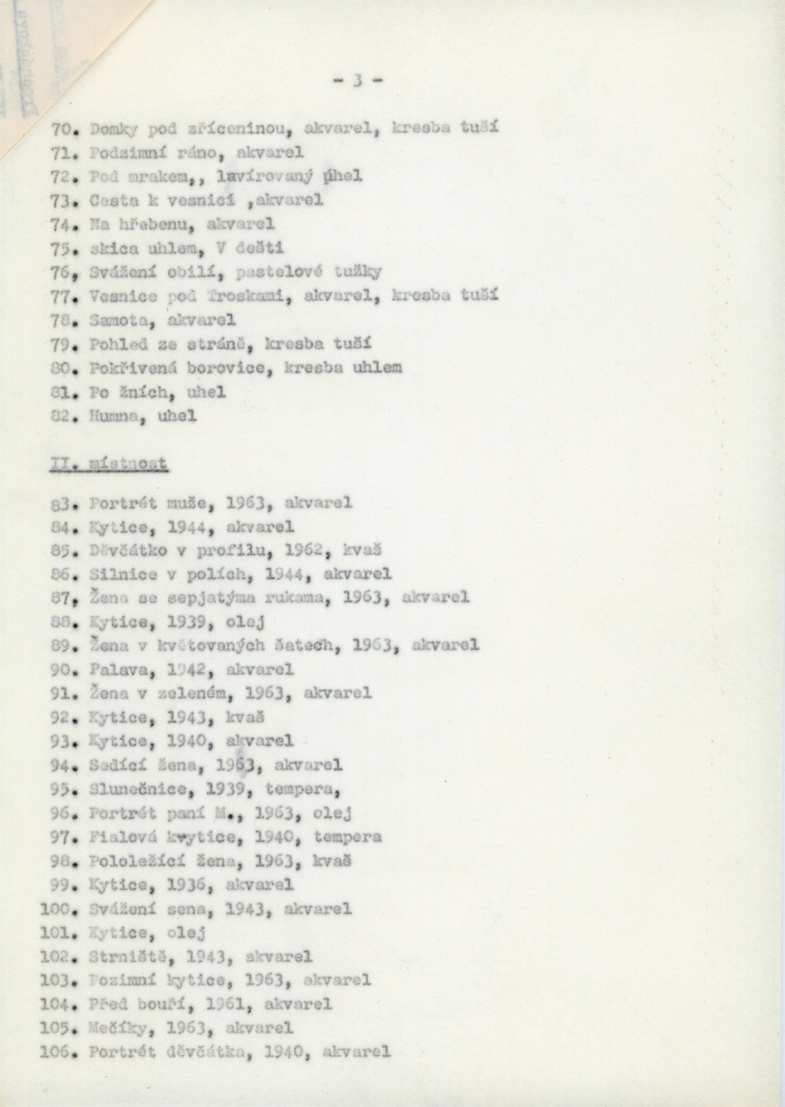 pozvánky (Brno, Ostrava, Praha), katalog, leták, úvodní slovo (Adolf Kroupa), text (J. Kačera), seznam exponátů, fotografie obrazu, korespondence (dopis Jiřího Kotalíka Adolfu Kroupovi, korespondence A. Kroupy a Jiřího Šetlíka, dopis Eduarda Miléna o pořádání výstavy), recenze v tisku, digitalizovaný videozáznam ČT - záběry z výstav 1963-1969