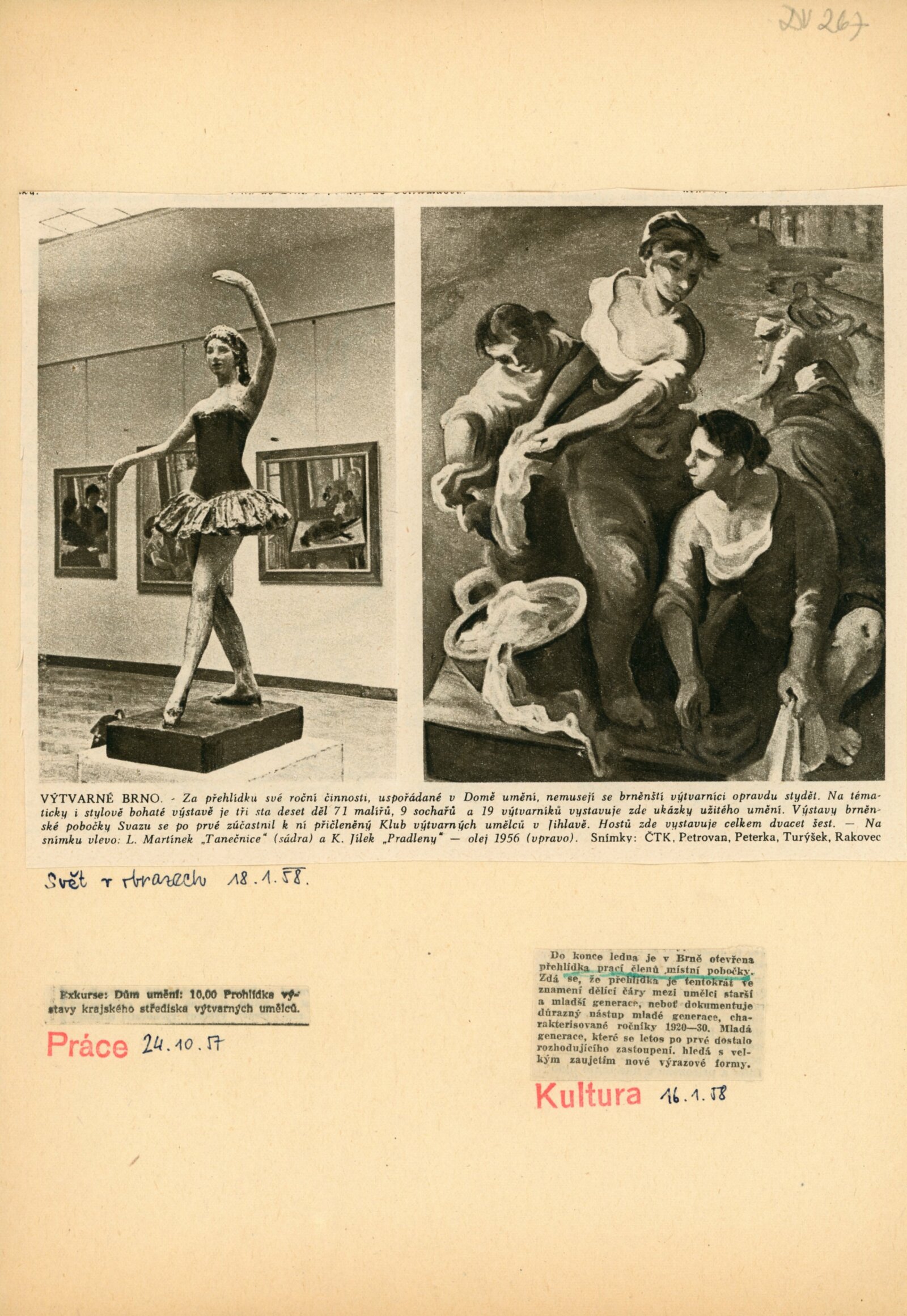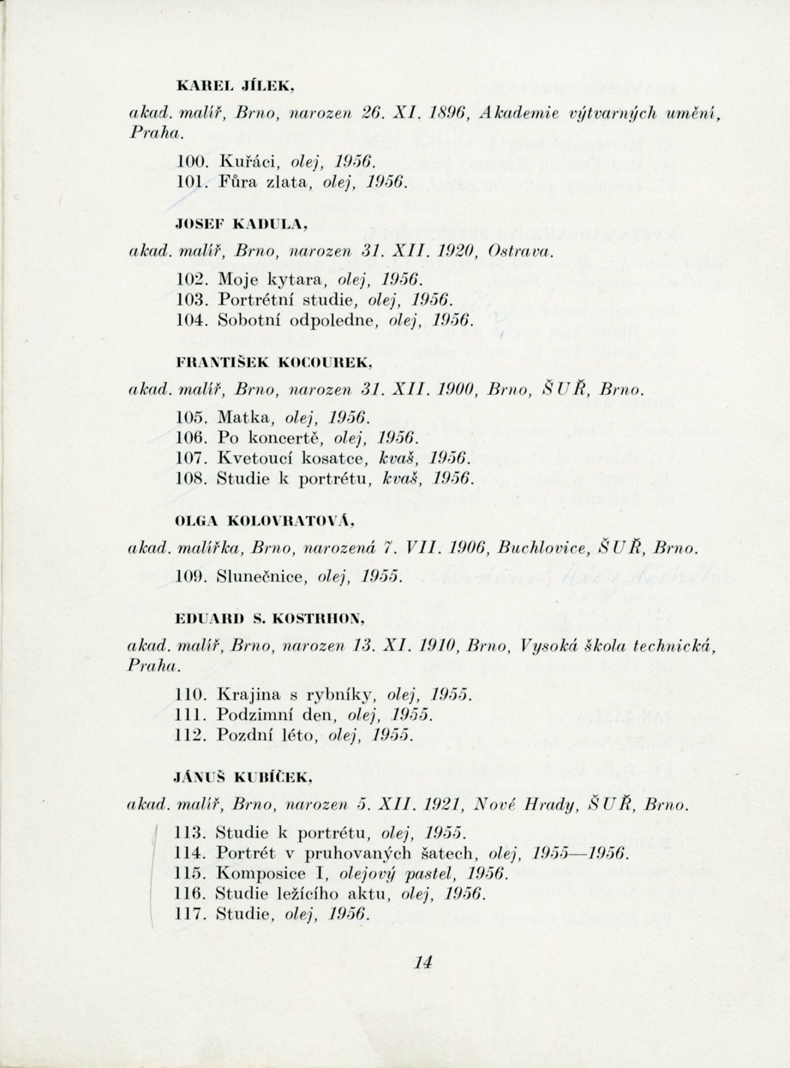 Výstava výtvarných umělců Brněnského kraje. Šestá členská výstava: Dům umění města Brna, 4. 11. – 2. 12. 1956 / Text: J. B. Svrček. – Brno: SČSVU, 1956. – 22 s., životní data vystavujících umělců, DU 267. – MZK; MG