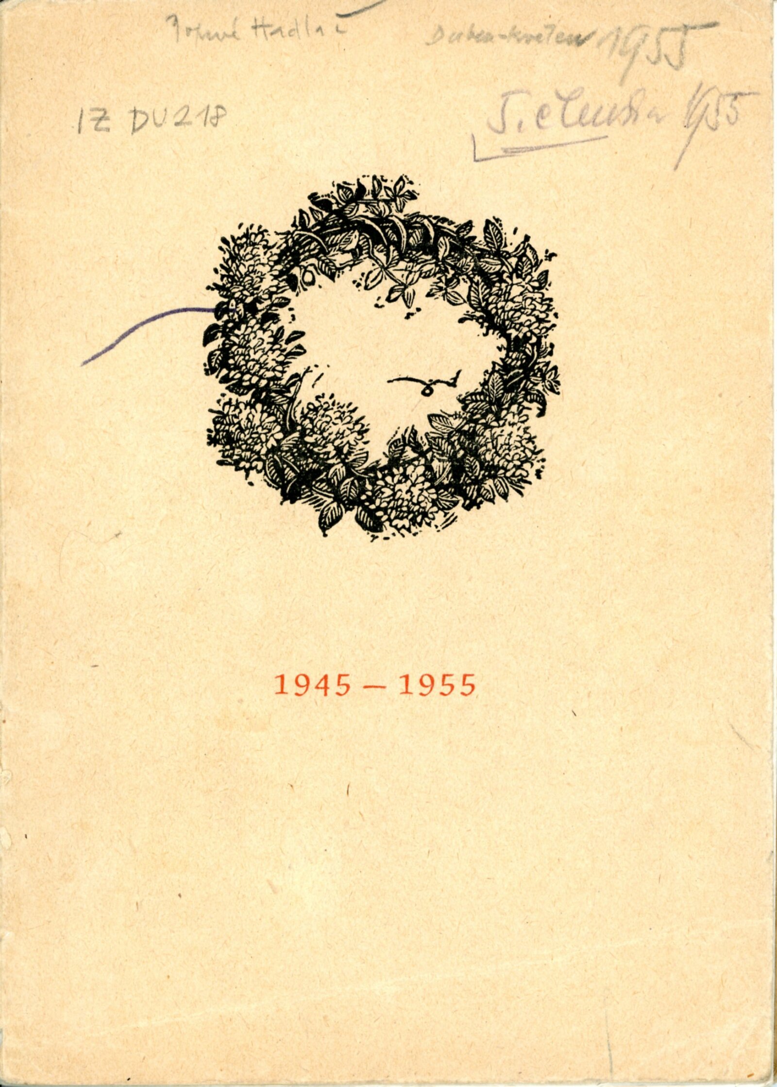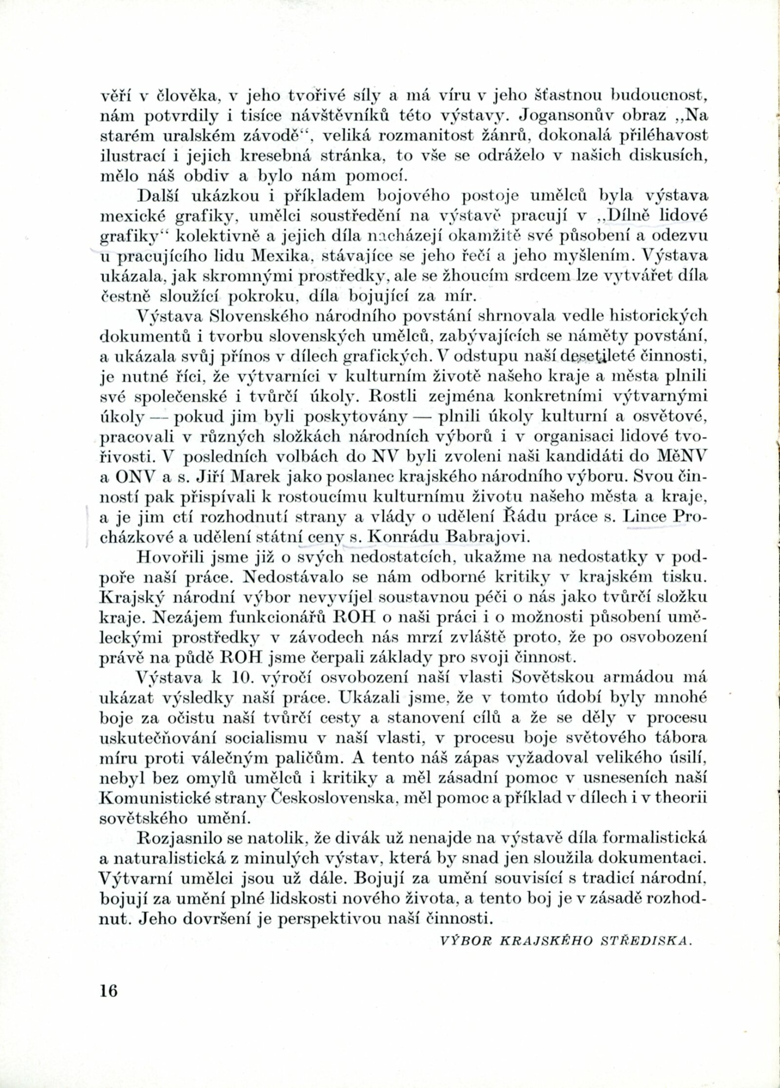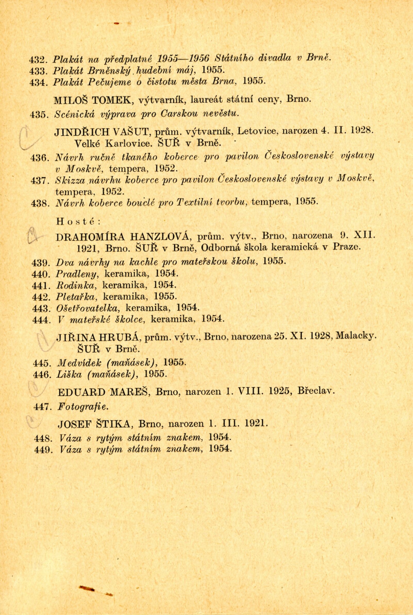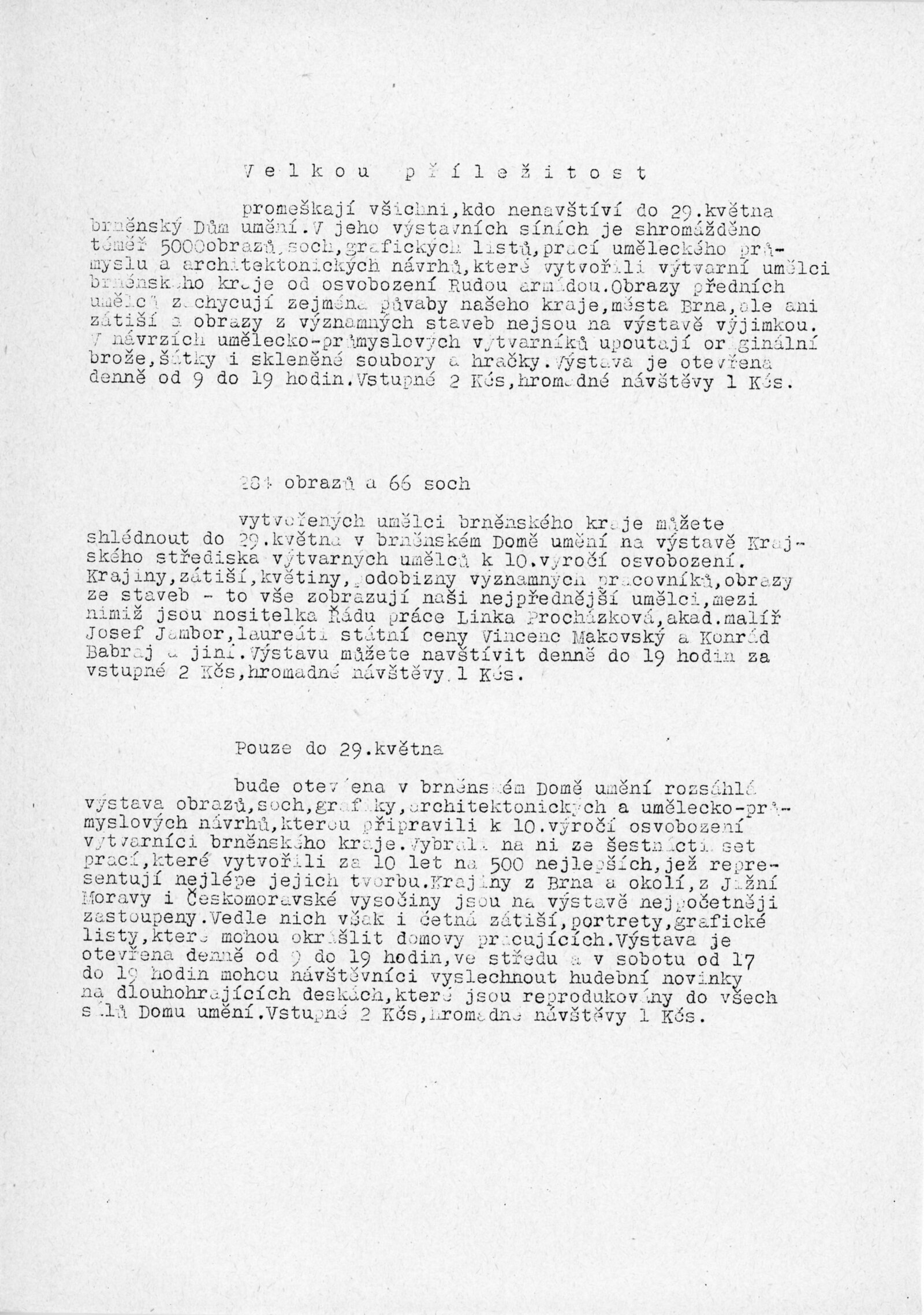 pozvánka, katalog, soupis děl, propagační text, udělení Cen osvobození Brna 1946–1955, jména umělců, provozní korespondence