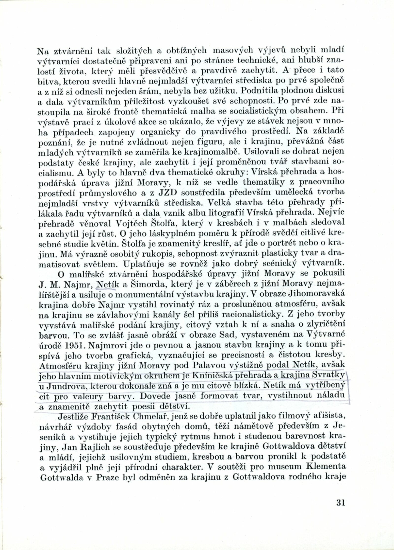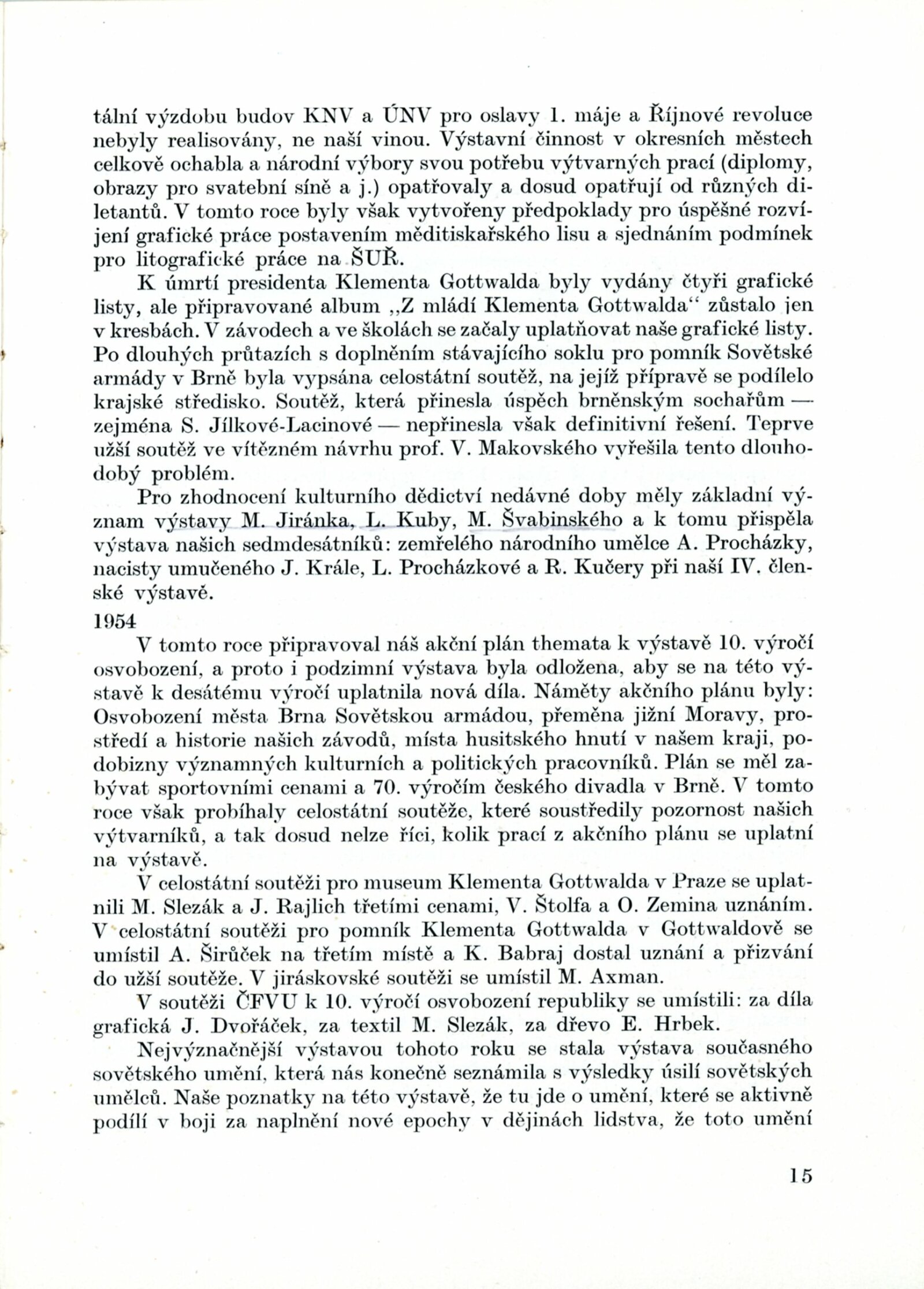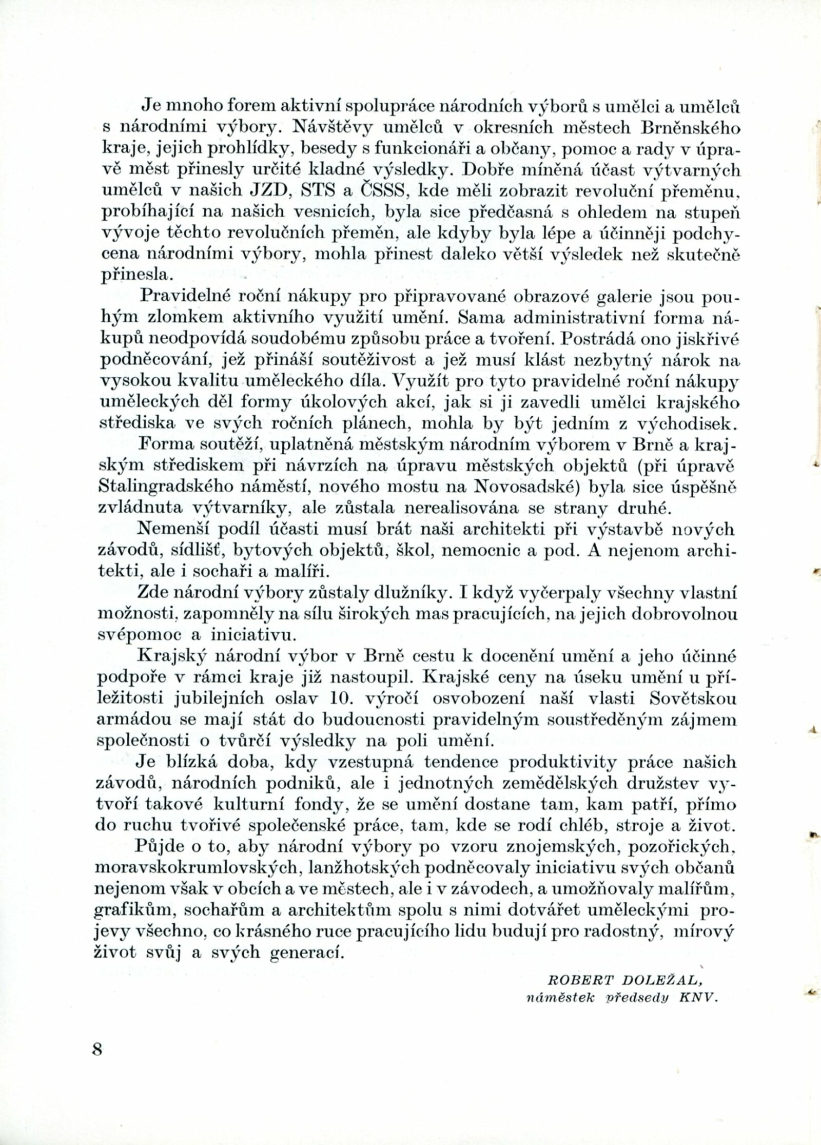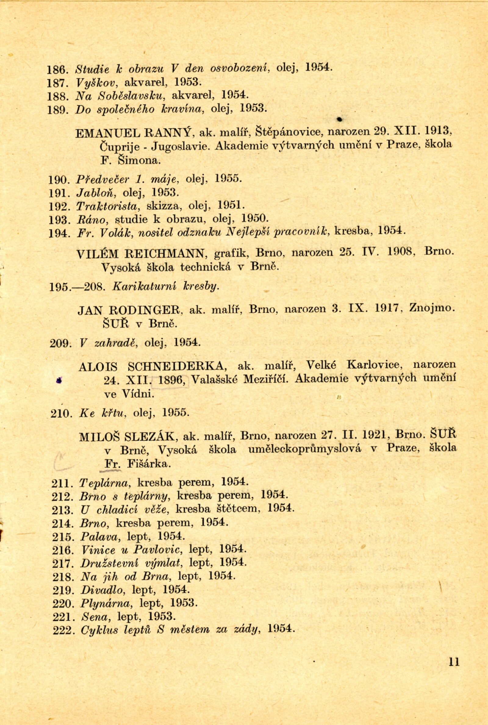 Výtvarní umělci k desátému výročí osvobození. Pátá členská výstava ÚSČSVU: Dům umění města Brna, 30. 4. – 29. 5. 1955 / Texty: Robert Doležal (Výbor krajského střediska), Zdeněk Kudělka, J. B. Svrček, Stanislav Rys, J. Medková-Lossmannová. – Brno: ÚSČSVU, 1955. – 46 s., obr., 32 s. obr. příl., seznam vystavených prací, životní data vystavujících, DU 218. – MZK; MG