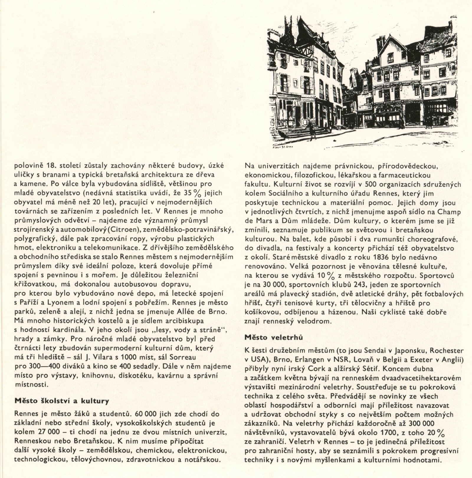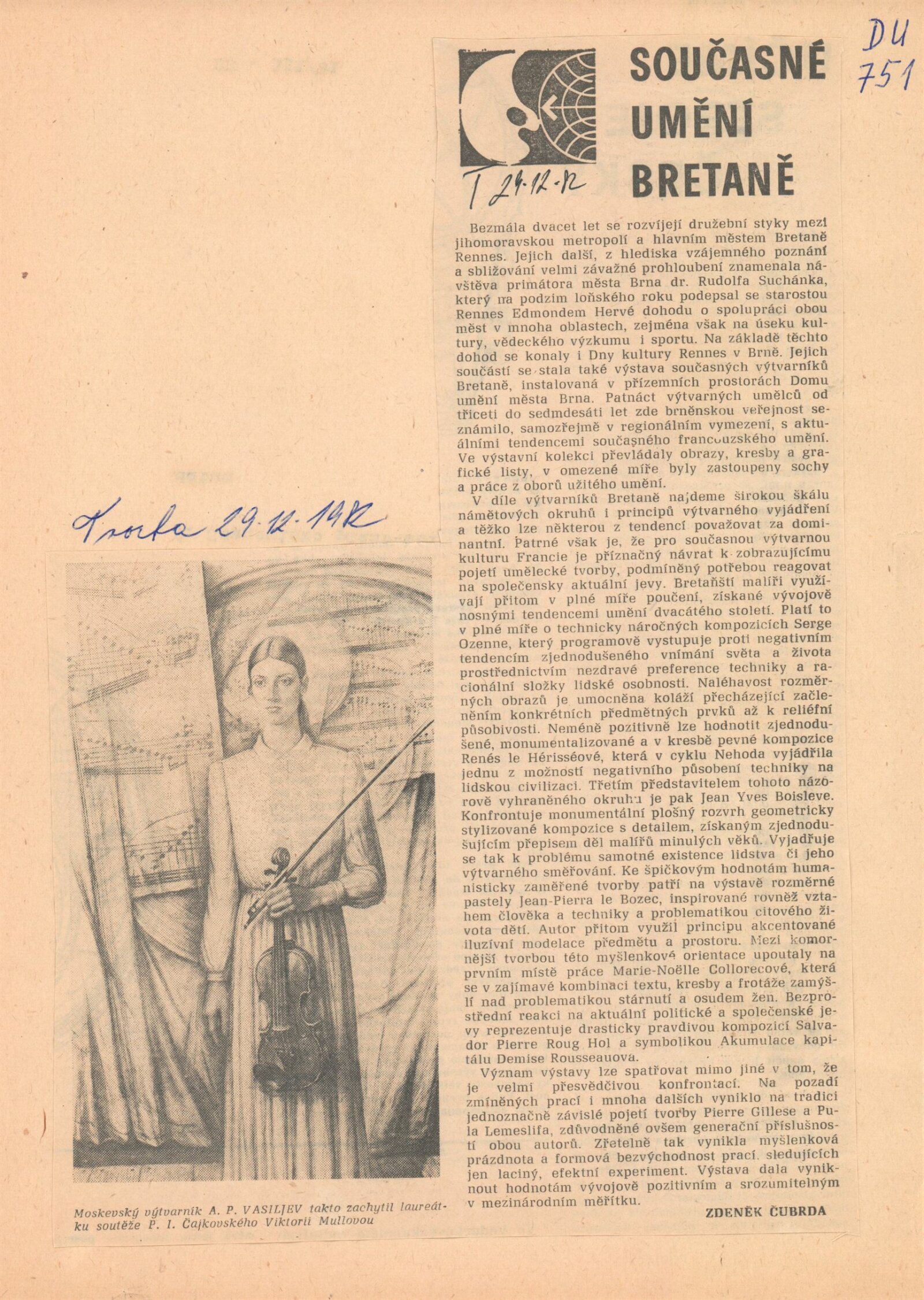 pozvánka na dny kultury Rennes v Brně, pozvánka na setkání Hudba mezi obrazy, katalog ke dnům kultury obsahující katalog k výstavě, seznamy děl, podklady pro text katalogu - informace o cestě do Rennes, hodnocení výstavy, zápisy ze schůzí, žádost o registraci dovozu výstavy do ČSSR, žádost o povolení výstavy, podklady k jednotlivým autorům (životopisná data, fotografie děl, adresy, tisk), provozní korespondence, recenze v tisku, katalog ke Dnům kultury Brna v Rennes, turistické brožury a publikace o městě Rennes