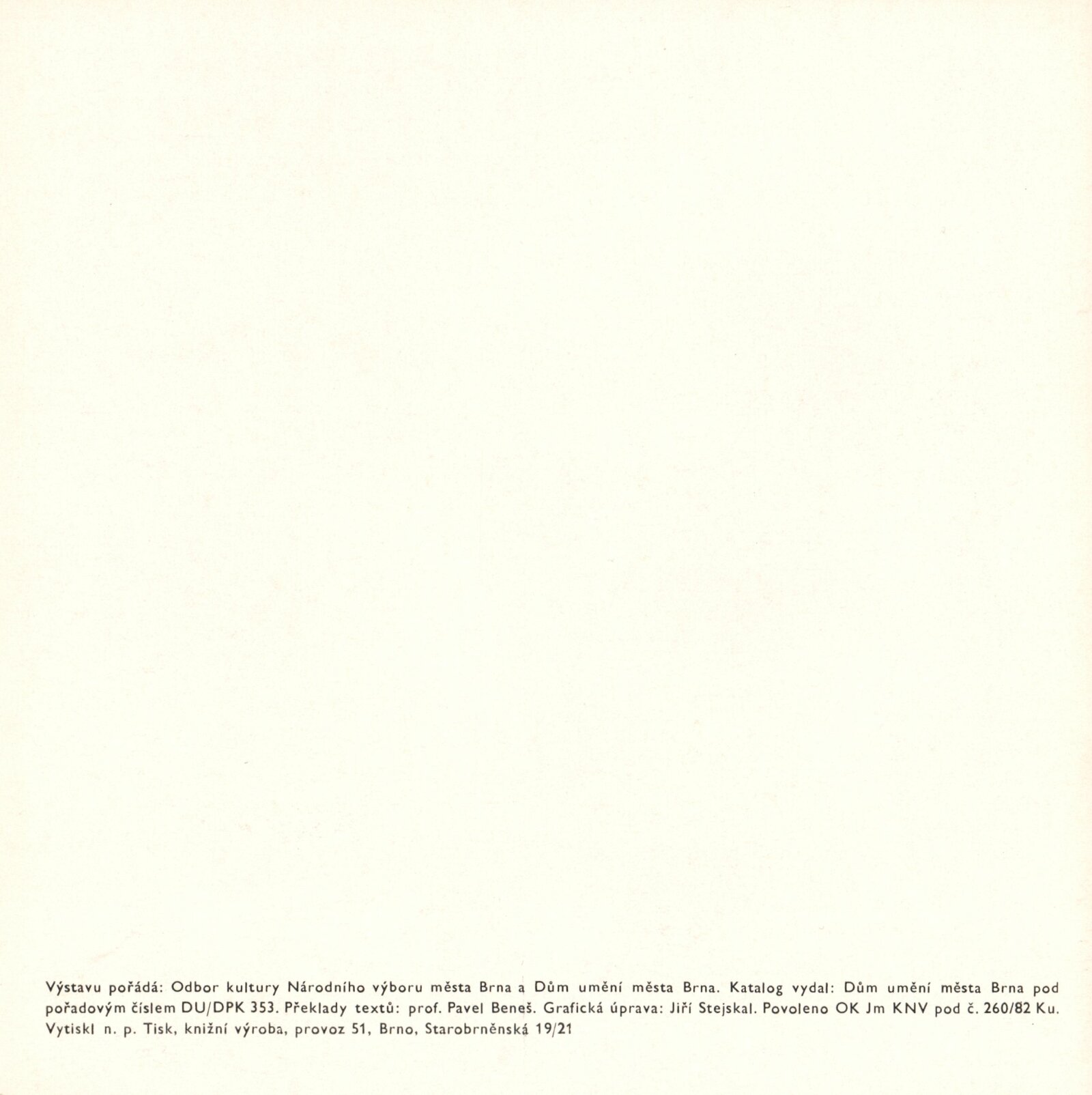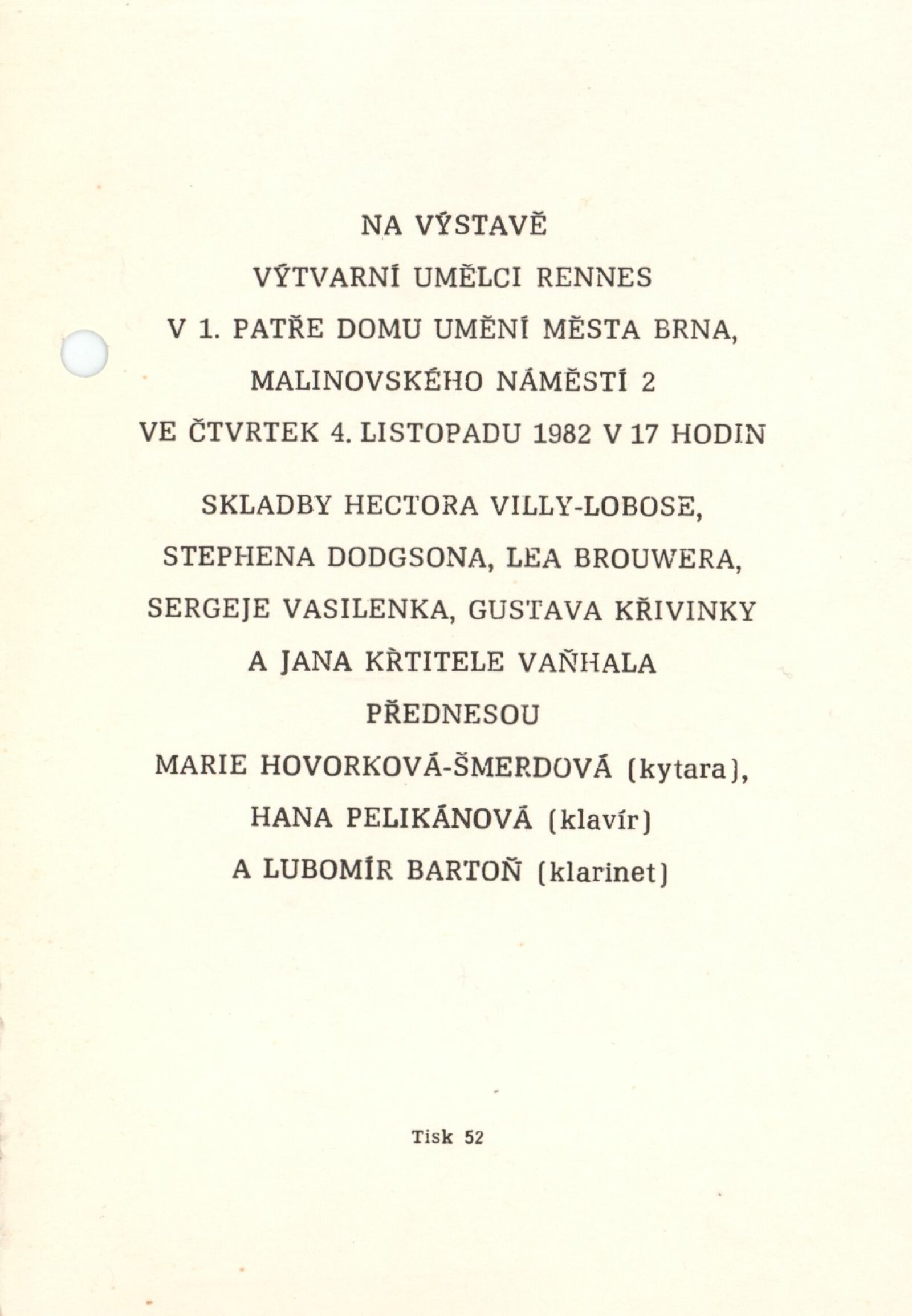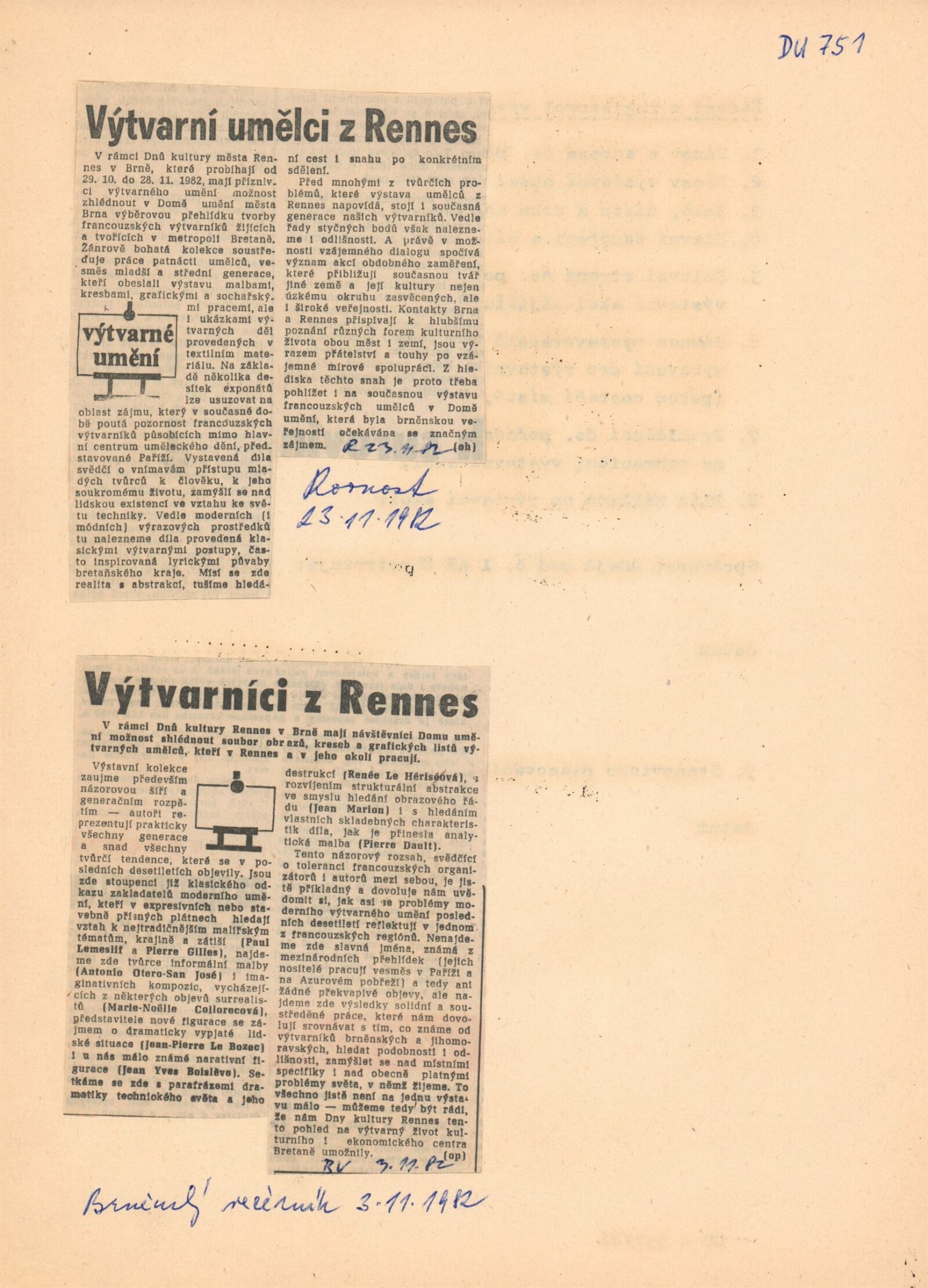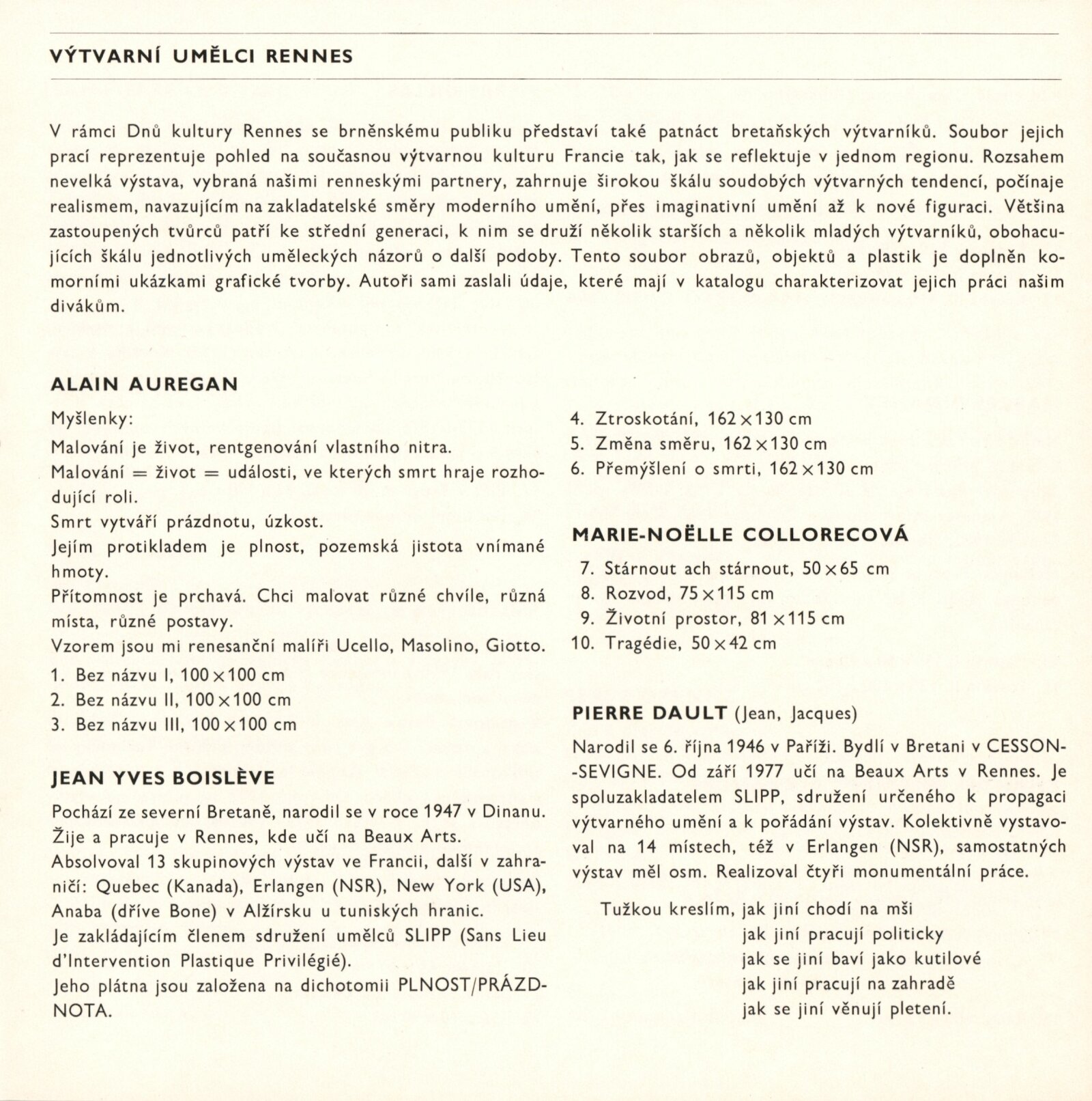 Výtvarní umělci Rennes: Dům umění města Brna, 1. patro, hala, 30. 10. – 28. 11. 1982 / Výstava uspořádána v rámci Dny kultury Rennes v Brně ve dnech 29. 10. – 28. 11. Brno: DUmB, 1982. – 4 s., životní data vystavujících, 1982 DU 751. – MG