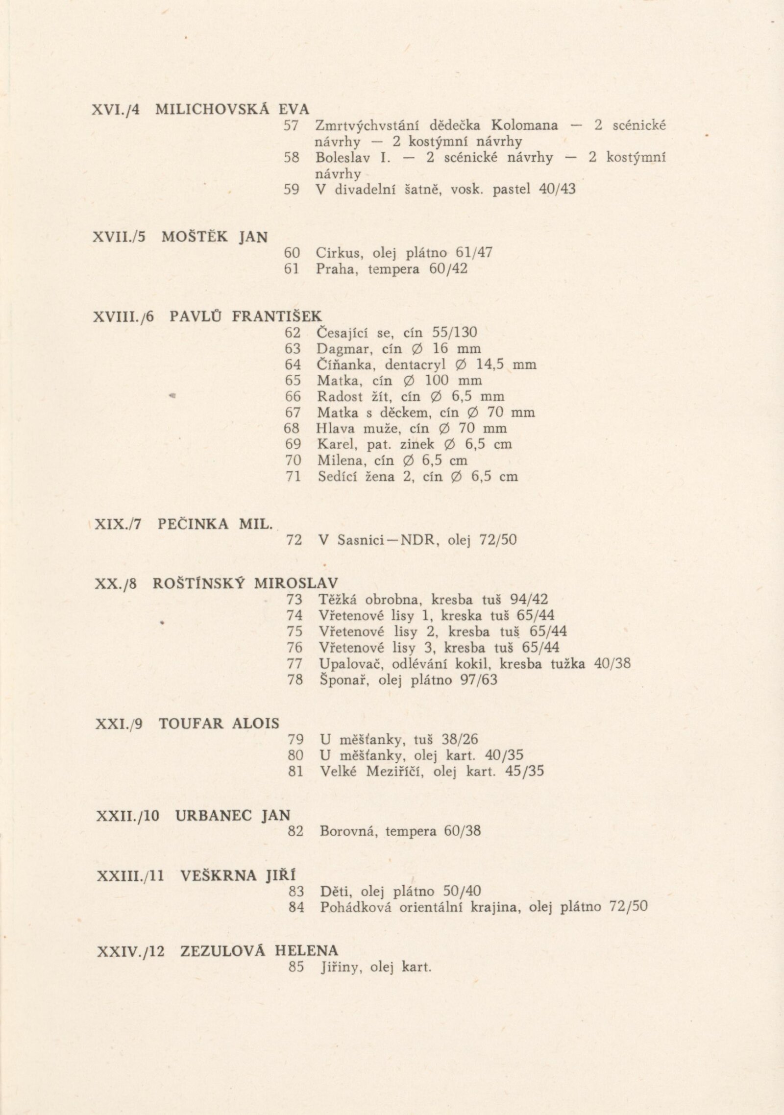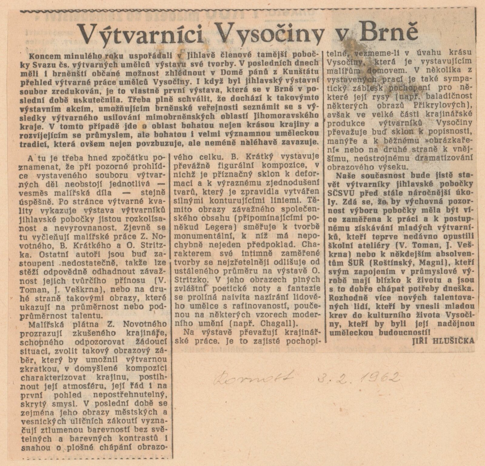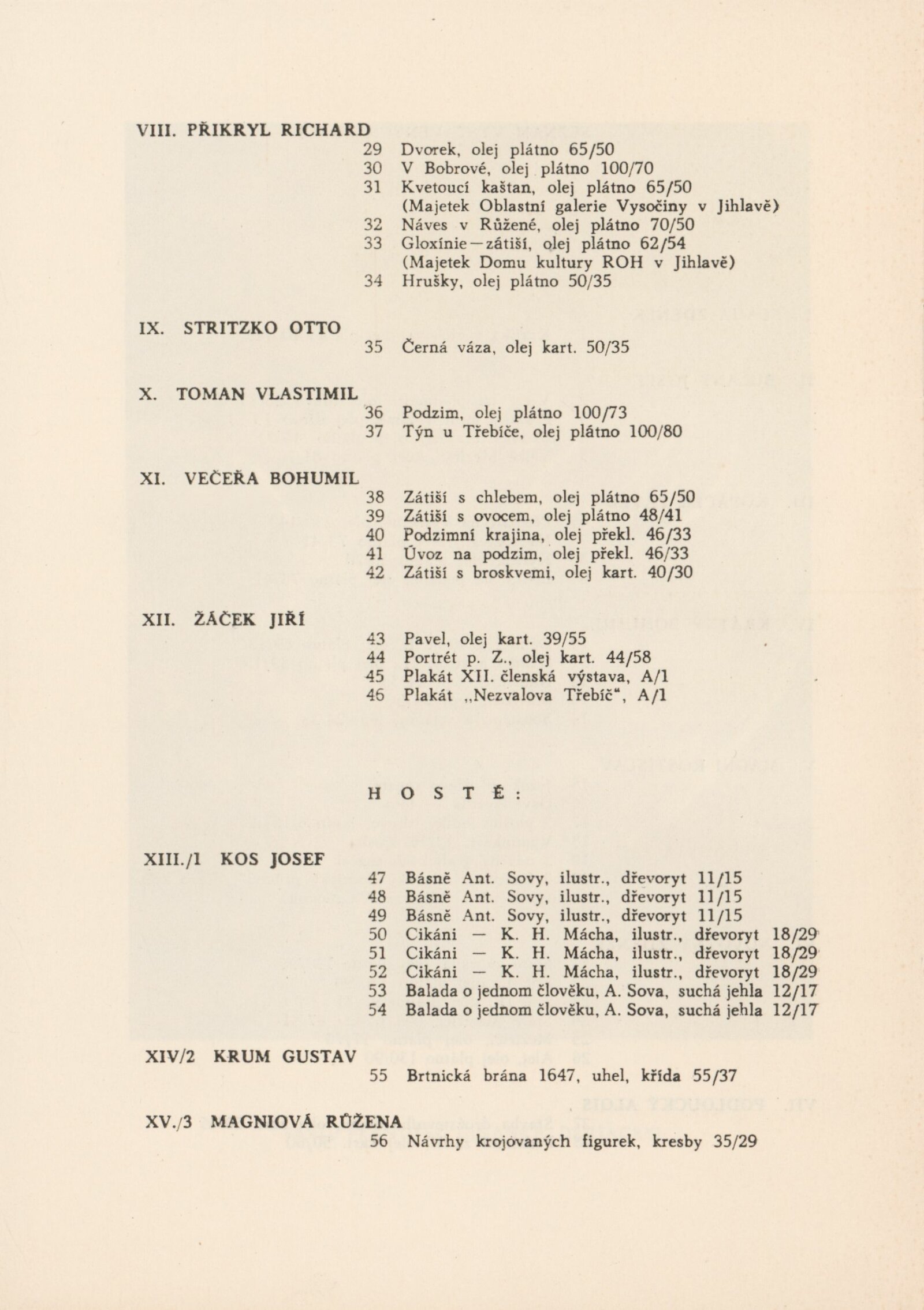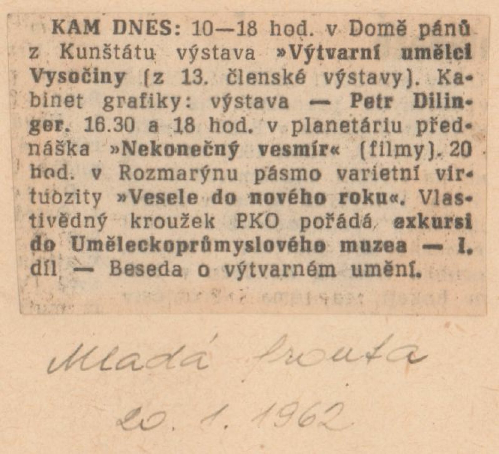 Výtvarní umělci Vysočiny: Dům umění města Brna / Dům pánů z Kunštátu, 1. patro, 16. 1. – 4. 2. 1962 / Převzatý katalog. XIII. členská výstava. Svaz československých výtvarných umělců. Oblastní pobočka Vysočiny: Oblastní galerie Vysočiny, Jihlava, 10. 12. 1961 – 7. 1. 1962 / Text: J. D. – Jihlava: SČSVU, 1961. – 13 s., obr., DPK 140. – MZK