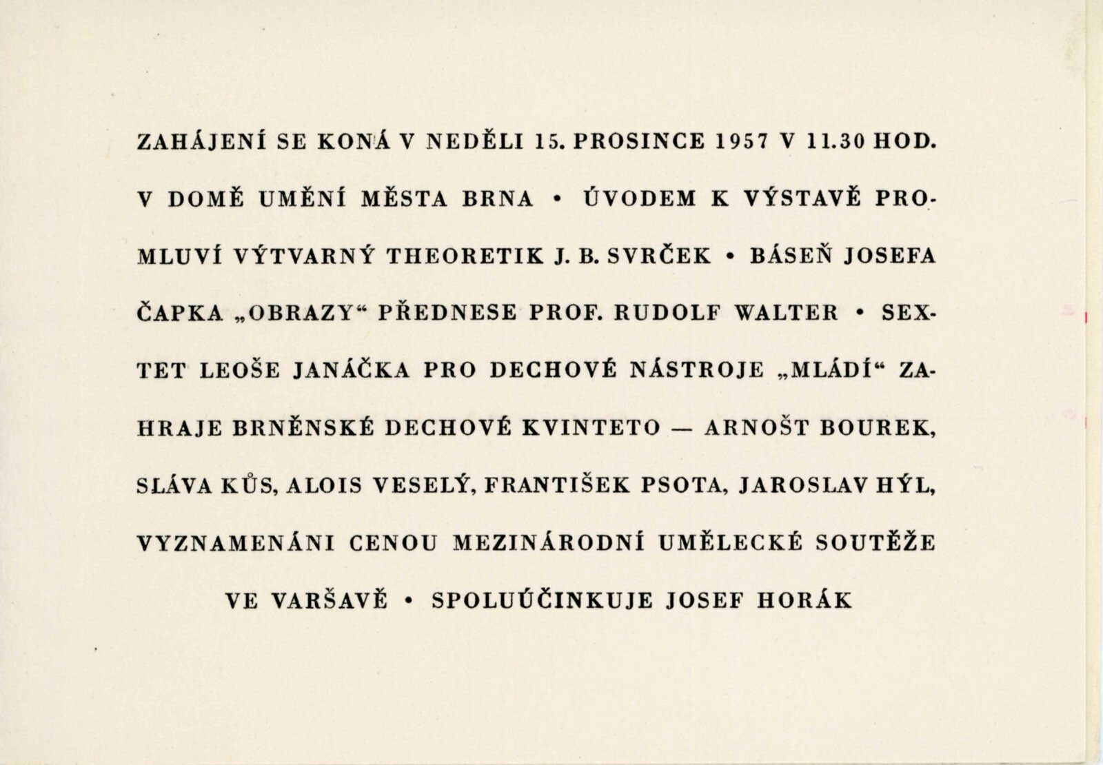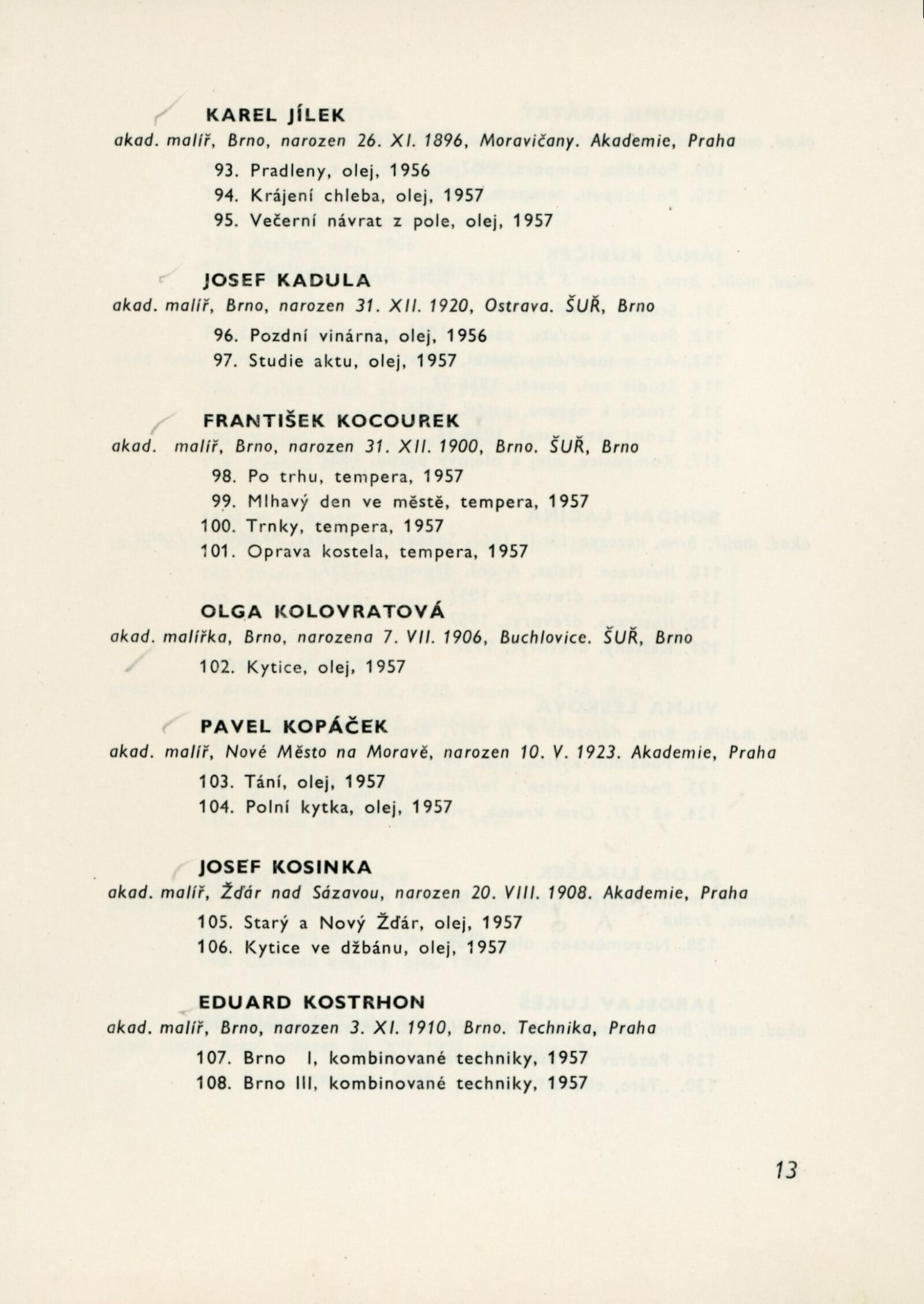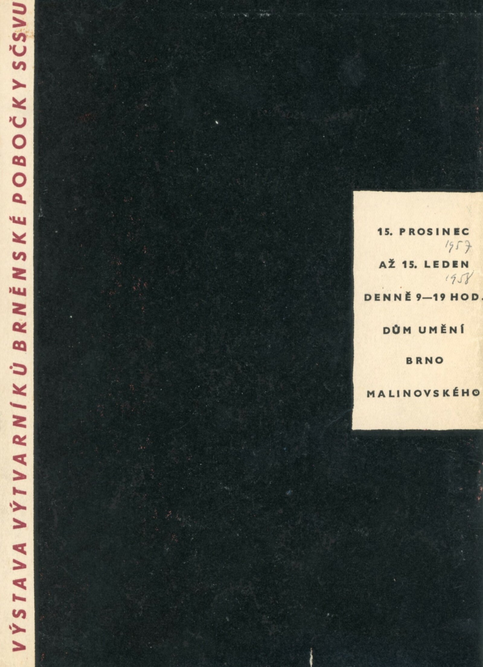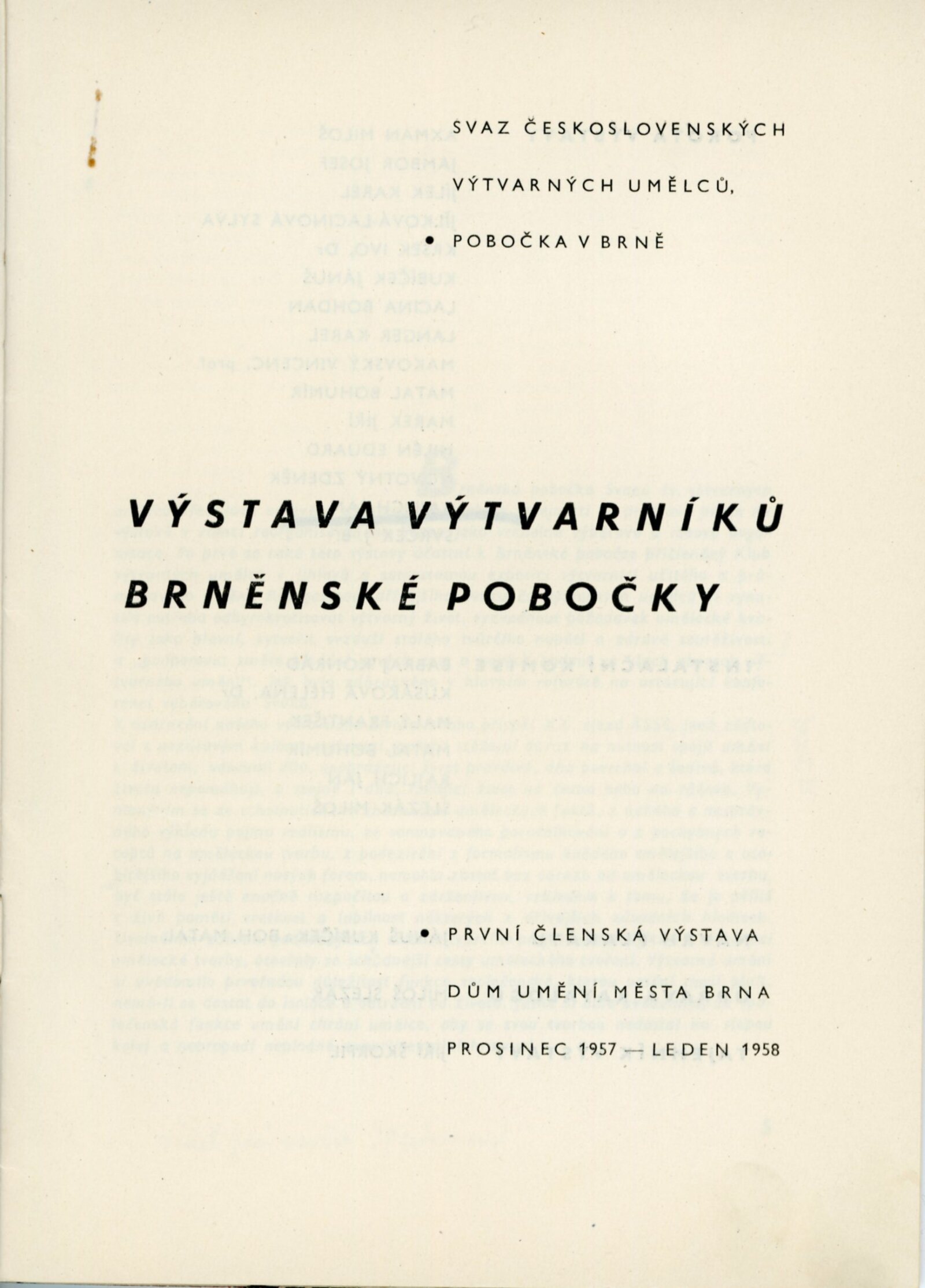 Výstava výtvarníků brněnské pobočky. Svaz československých výtvarných umělců. První členská výstava: Dům umění města Brna, 15. 12. 1957 – 15. 1. 1958 / Text: J. B. Svrček. – Brno: SČSVU, 1957. – 27 s., životní data vystavujících, DU 302. – Kubíček 7635; MZK; MG