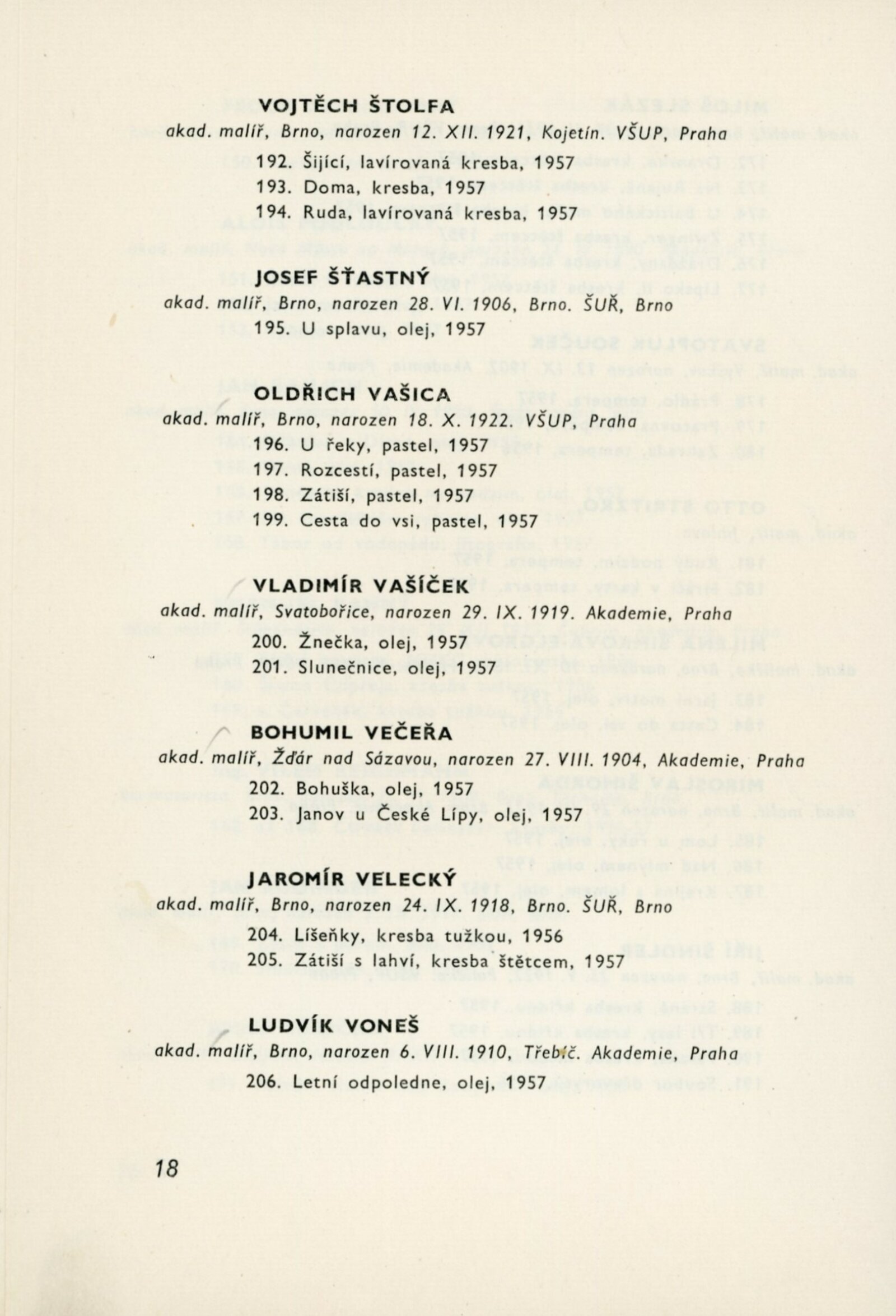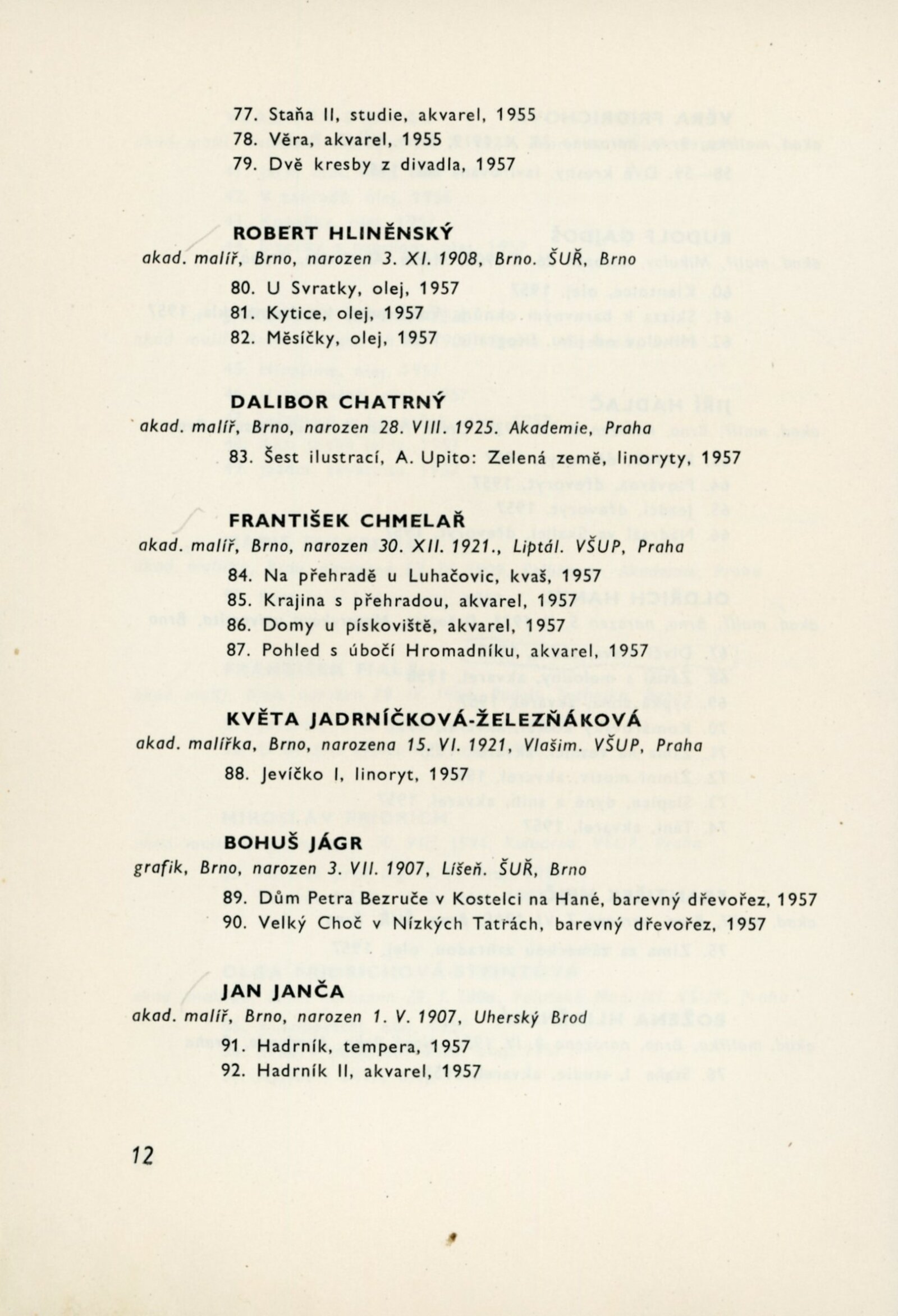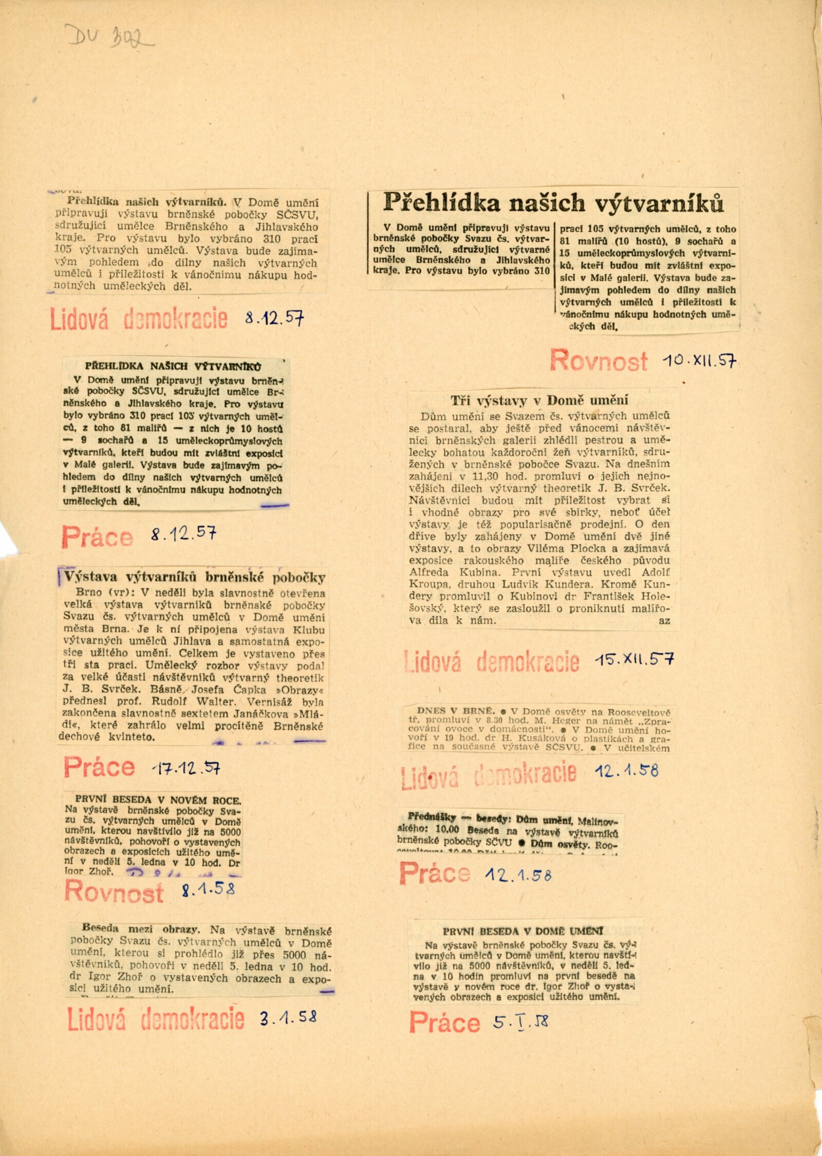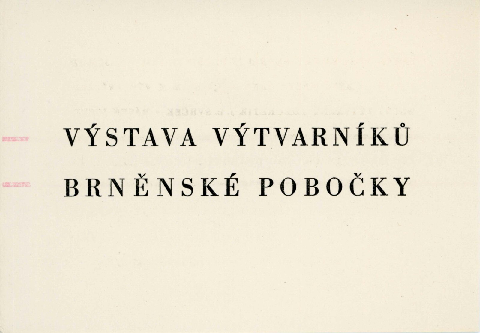 Výstava výtvarníků brněnské pobočky. Svaz československých výtvarných umělců. První členská výstava: Dům umění města Brna, 15. 12. 1957 – 15. 1. 1958 / Text: J. B. Svrček. – Brno: SČSVU, 1957. – 27 s., životní data vystavujících, DU 302. – Kubíček 7635; MZK; MG