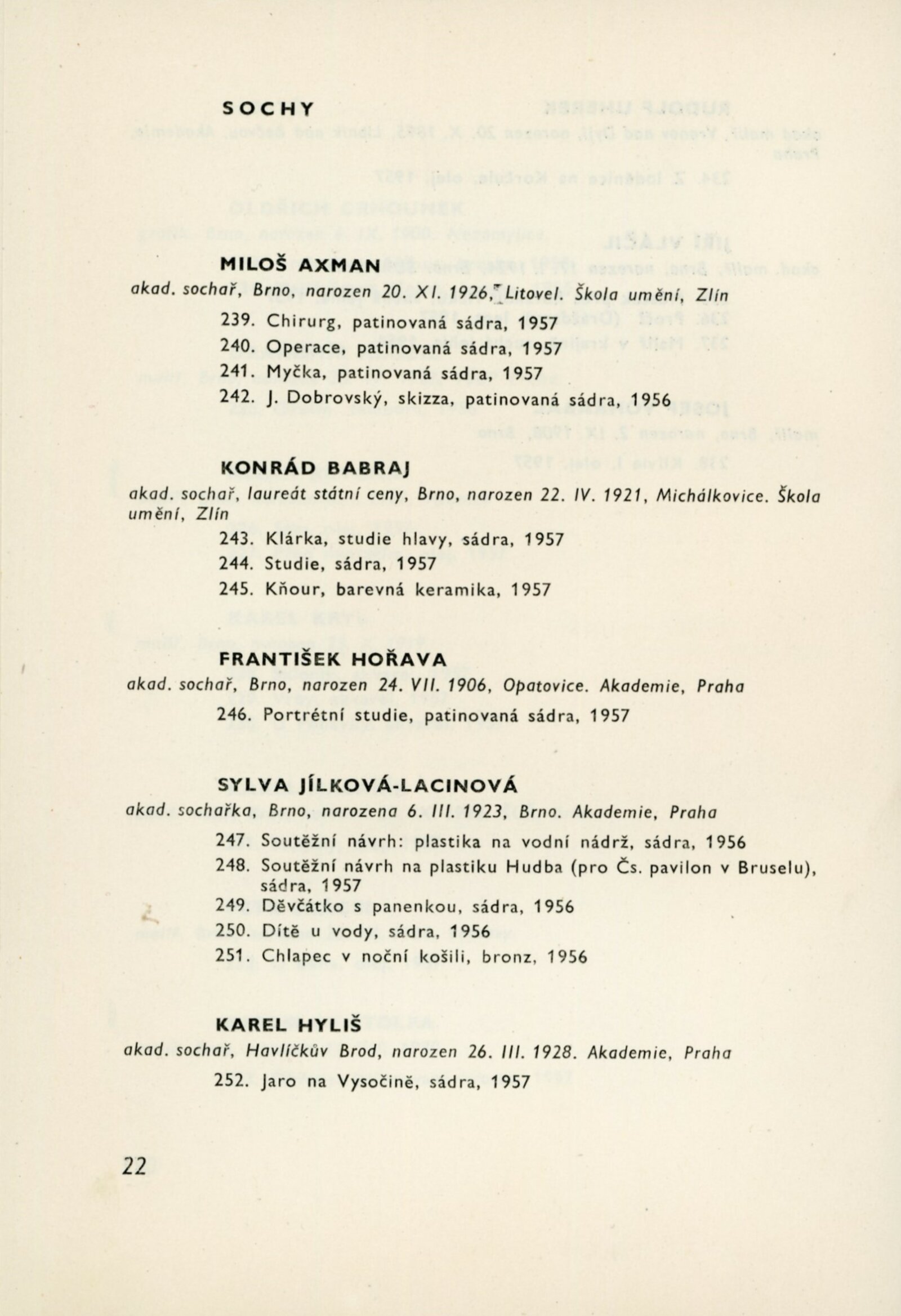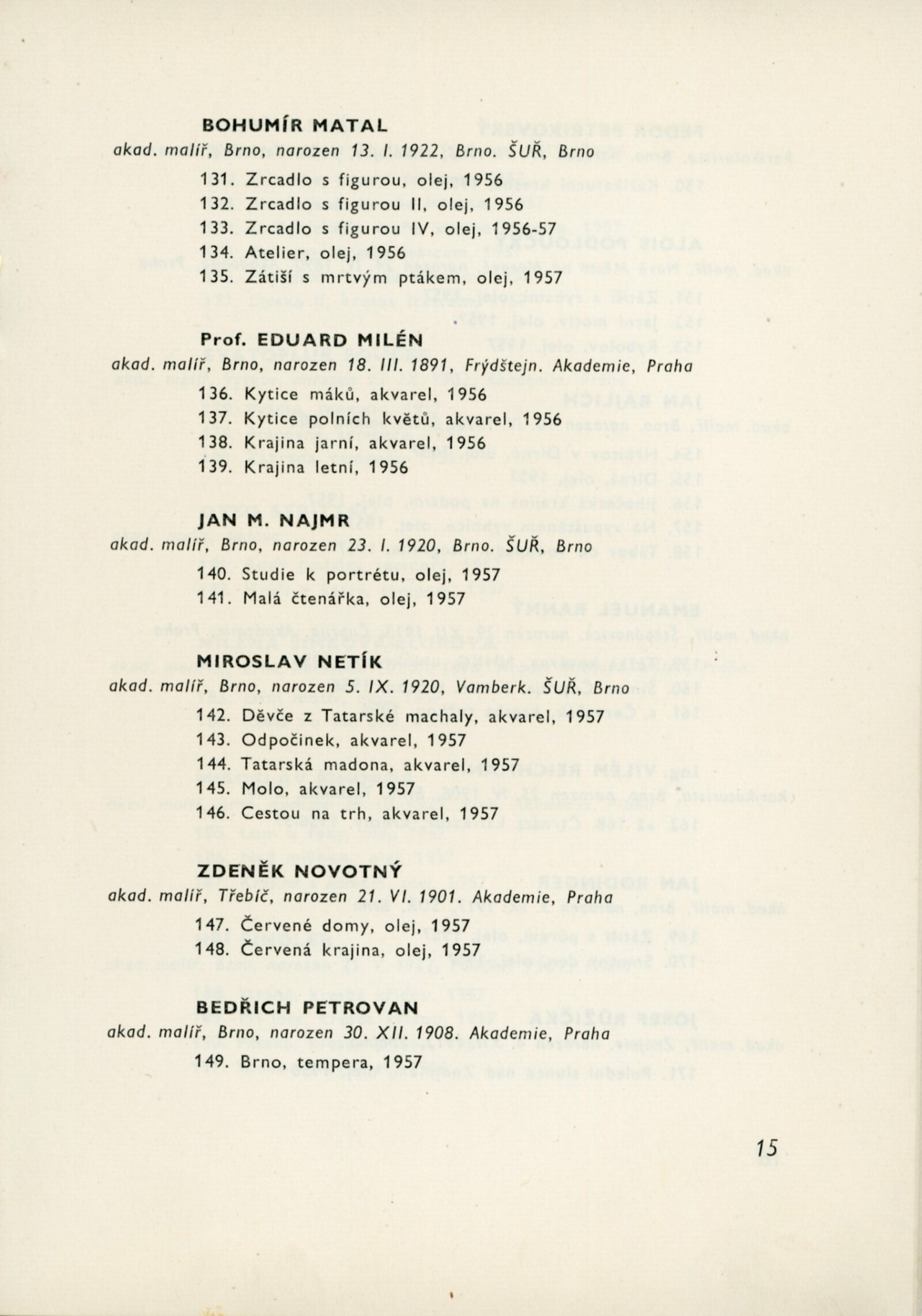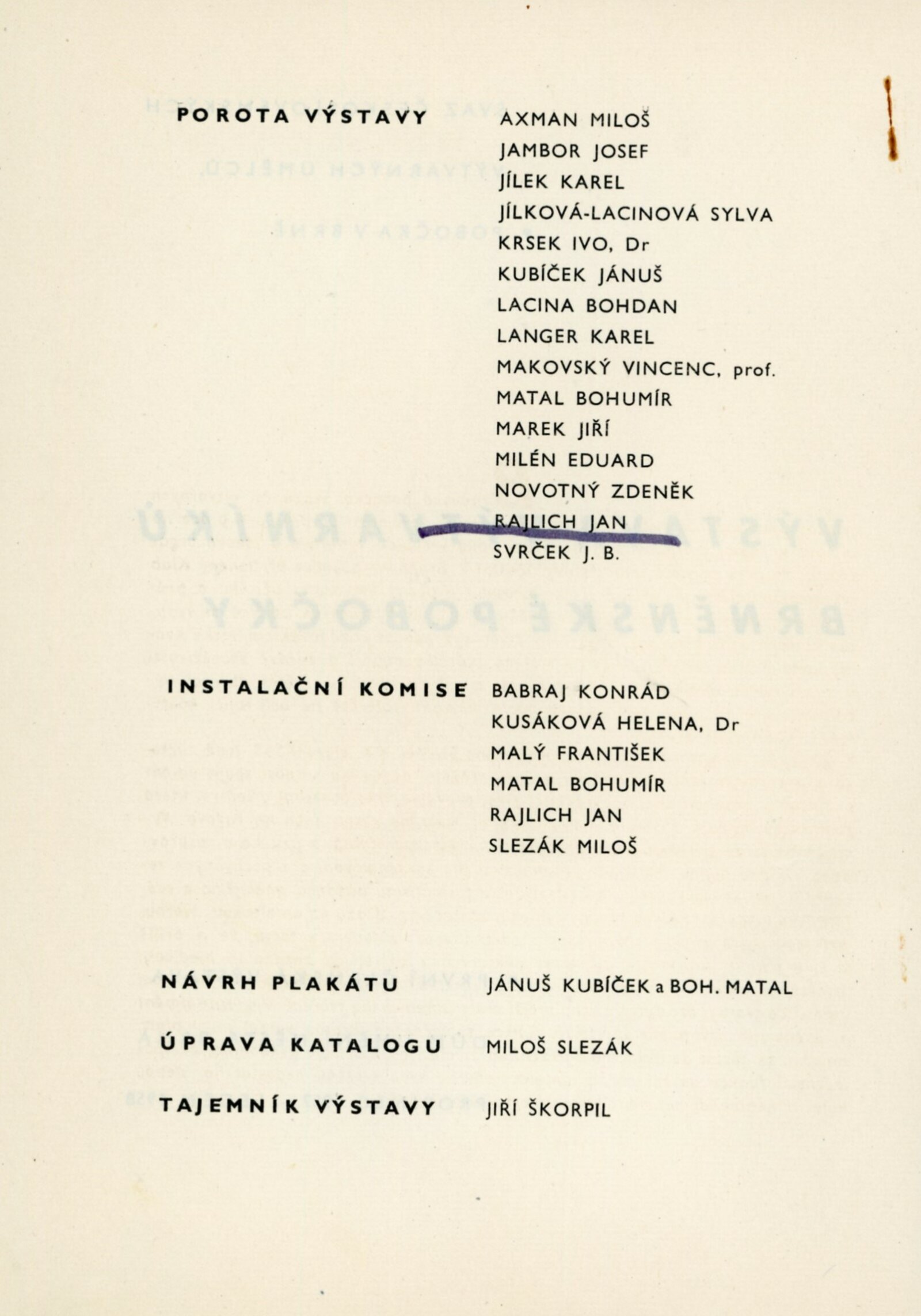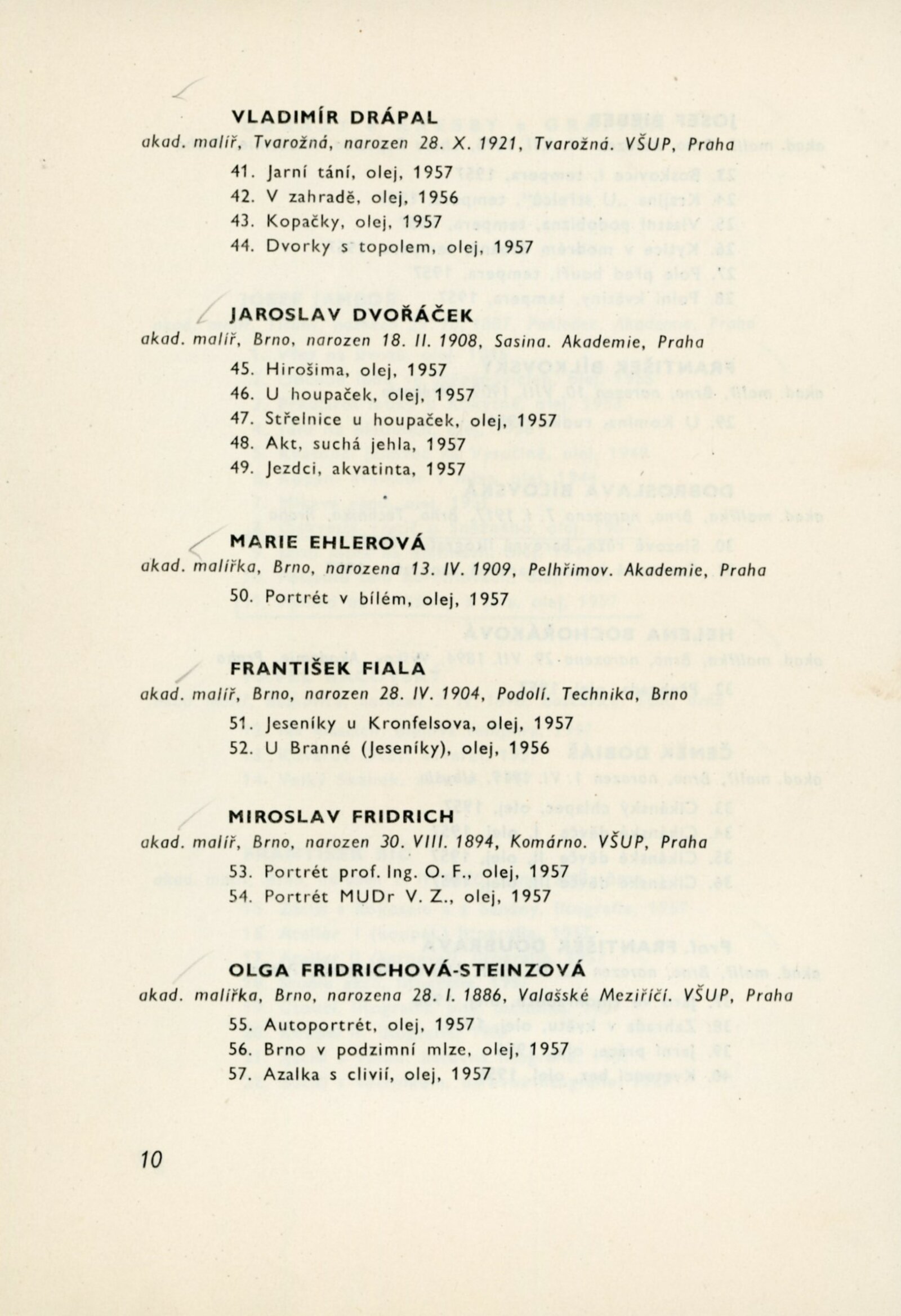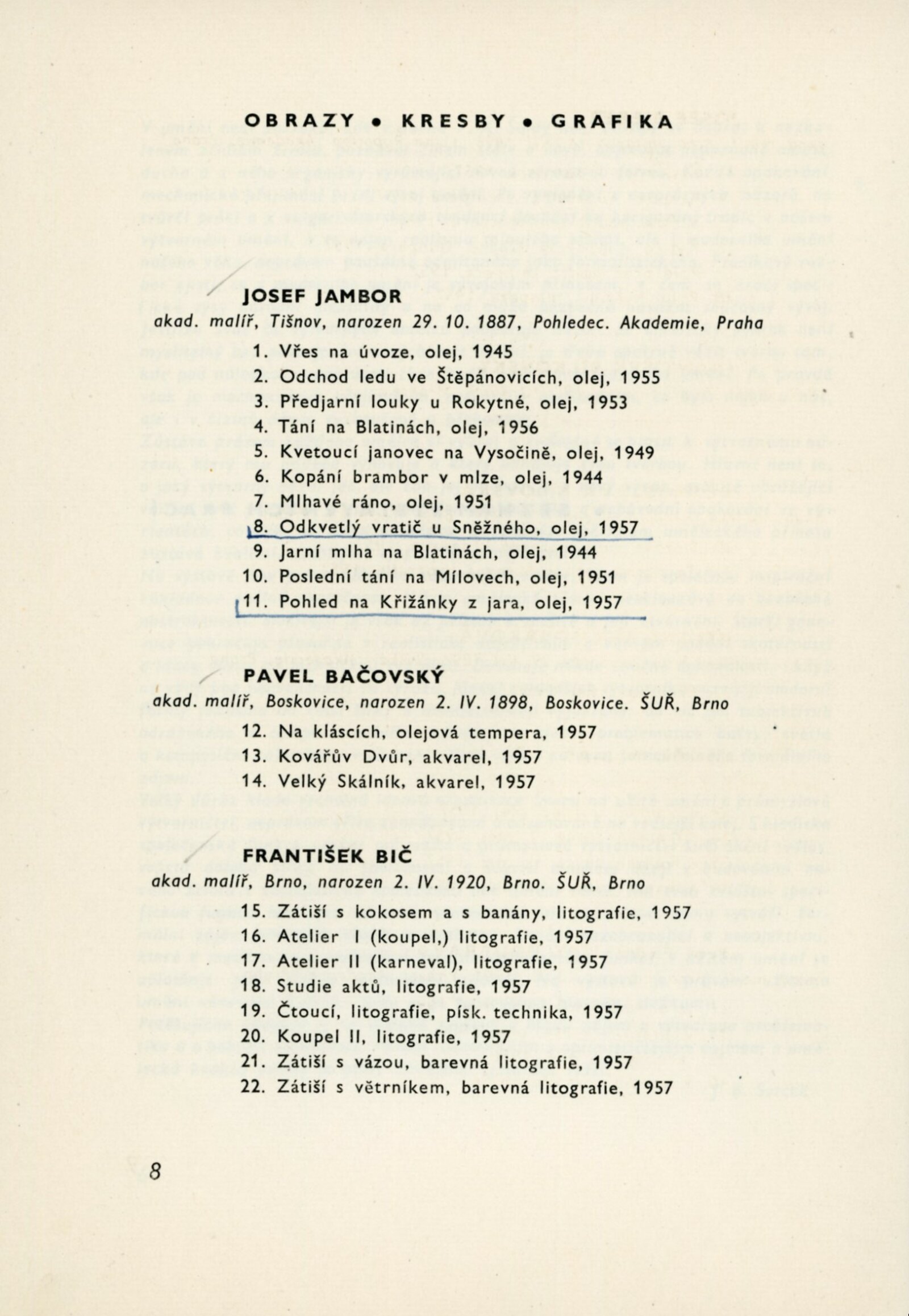 Výstava výtvarníků brněnské pobočky. Svaz československých výtvarných umělců. První členská výstava: Dům umění města Brna, 15. 12. 1957 – 15. 1. 1958 / Text: J. B. Svrček. – Brno: SČSVU, 1957. – 27 s., životní data vystavujících, DU 302. – Kubíček 7635; MZK; MG
