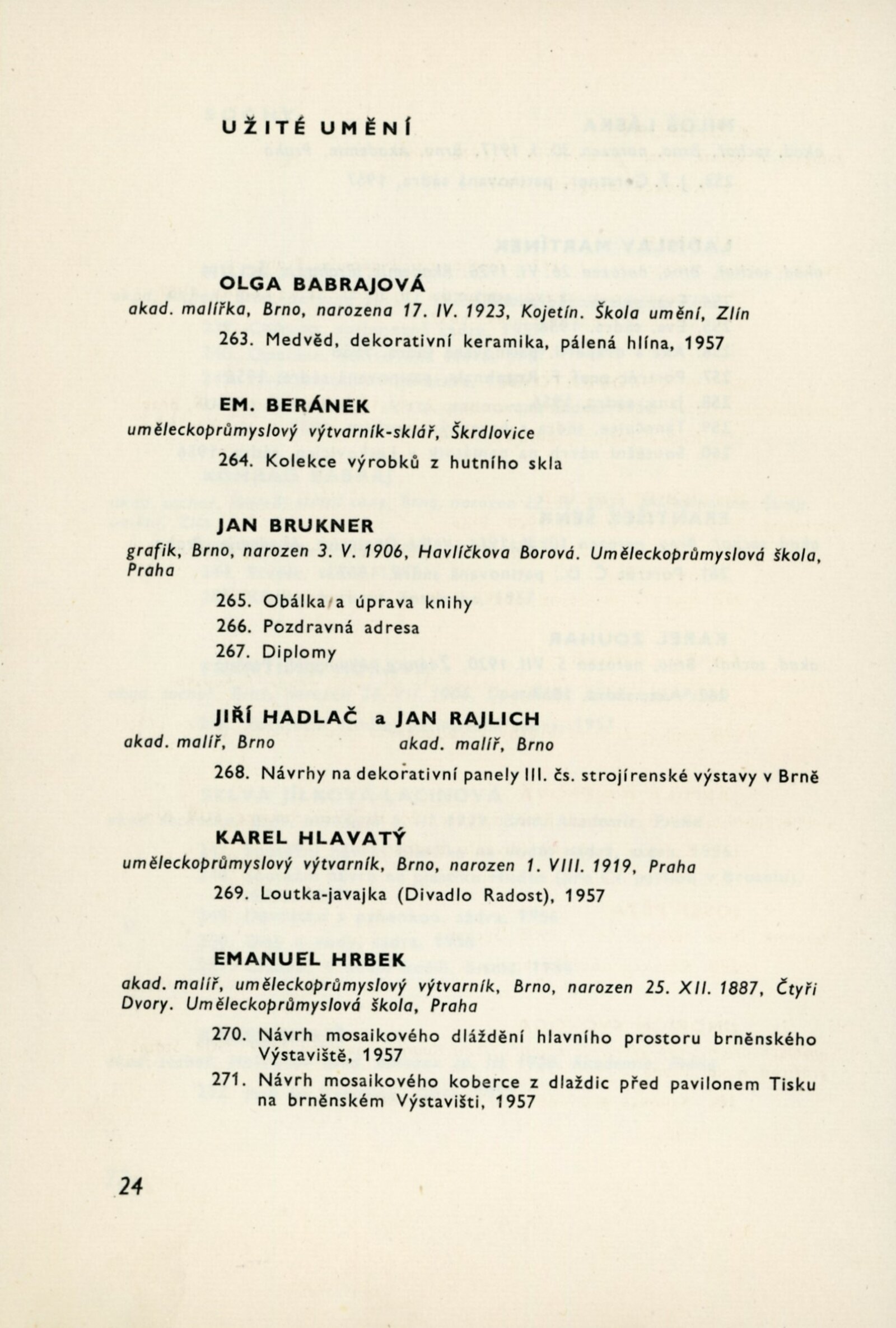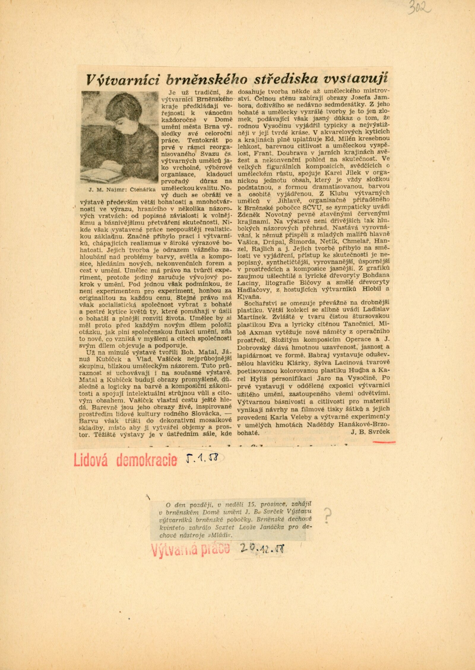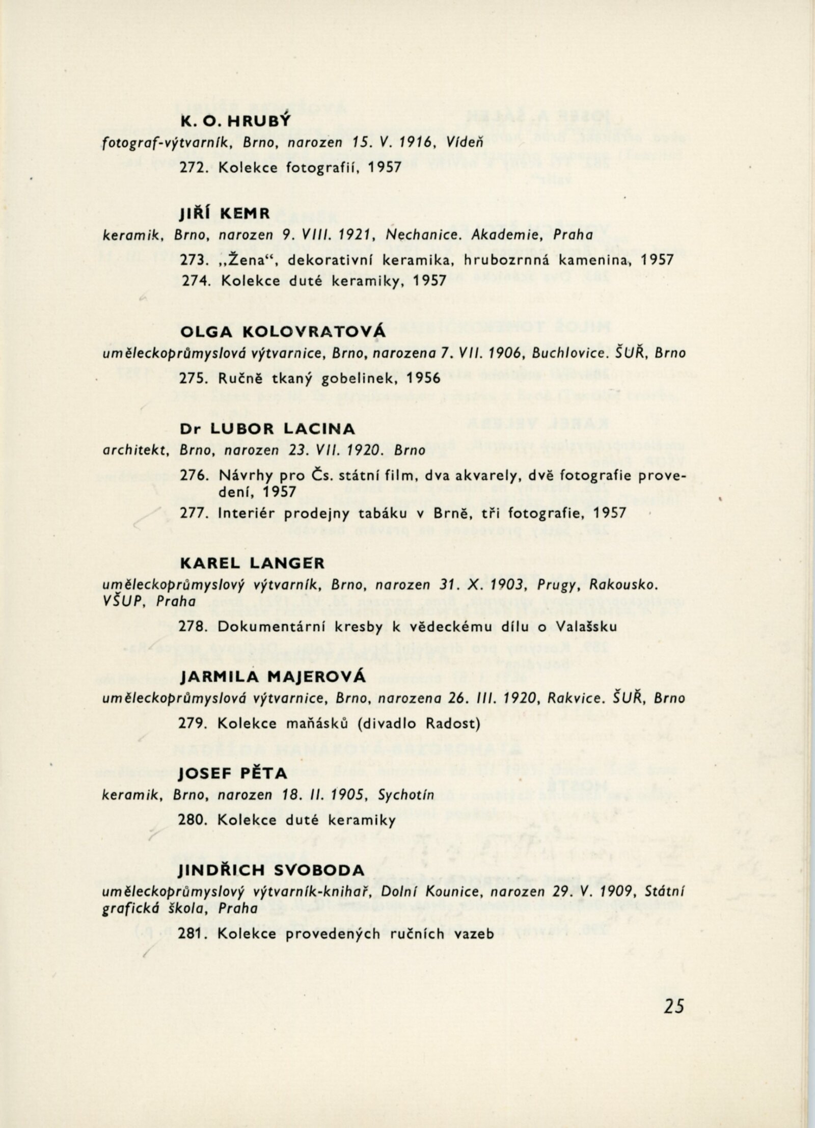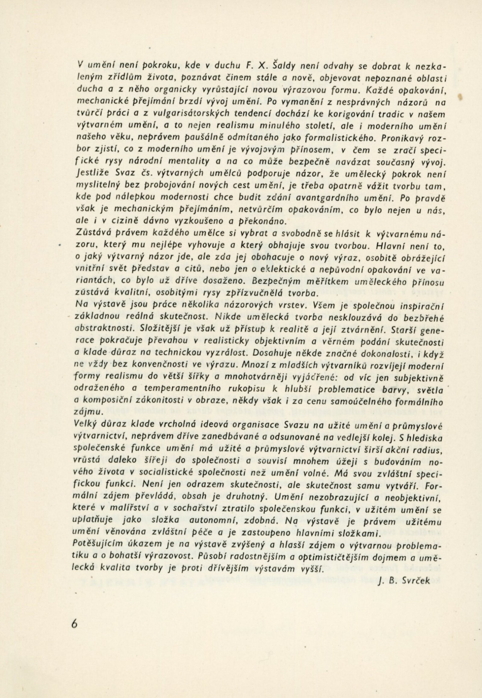 Výstava výtvarníků brněnské pobočky. Svaz československých výtvarných umělců. První členská výstava: Dům umění města Brna, 15. 12. 1957 – 15. 1. 1958 / Text: J. B. Svrček. – Brno: SČSVU, 1957. – 27 s., životní data vystavujících, DU 302. – Kubíček 7635; MZK; MG