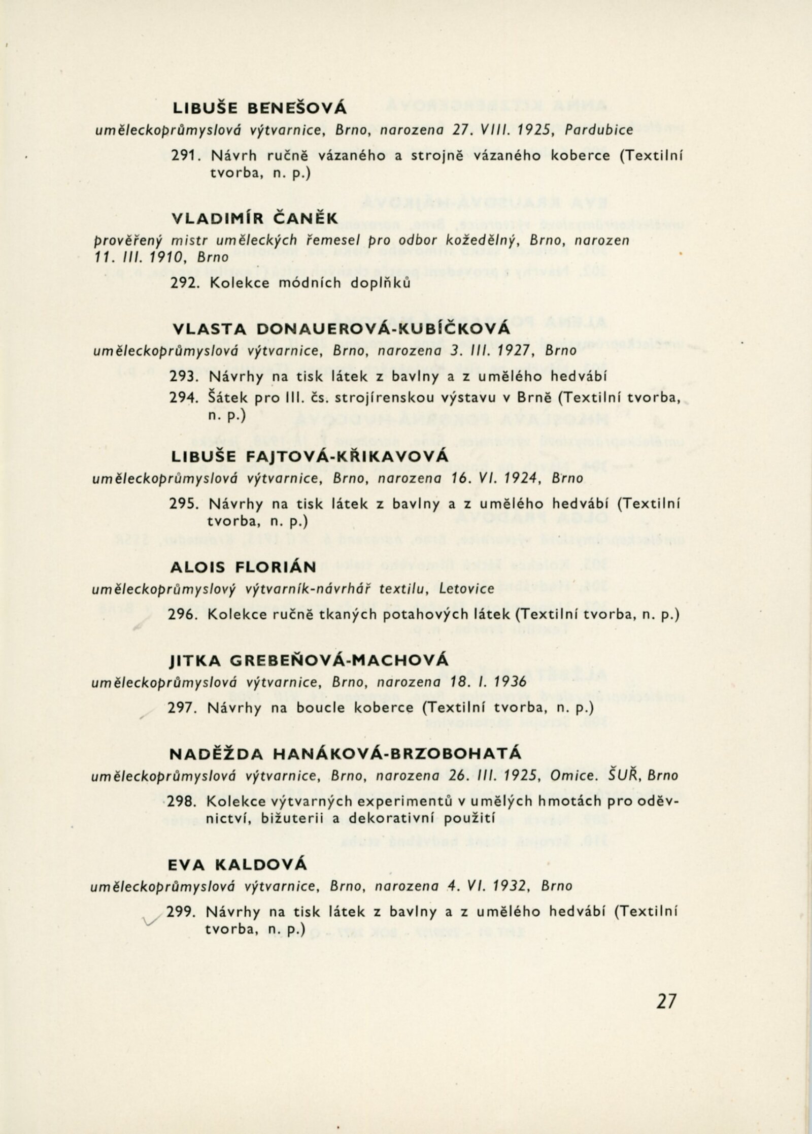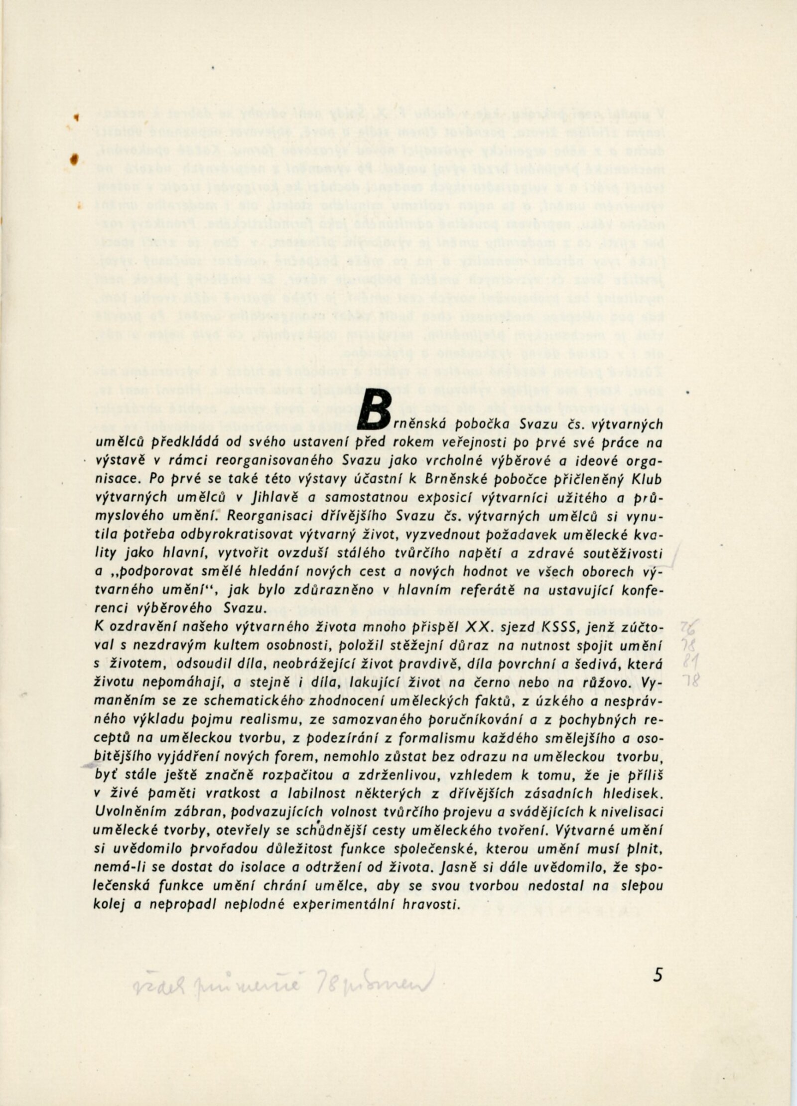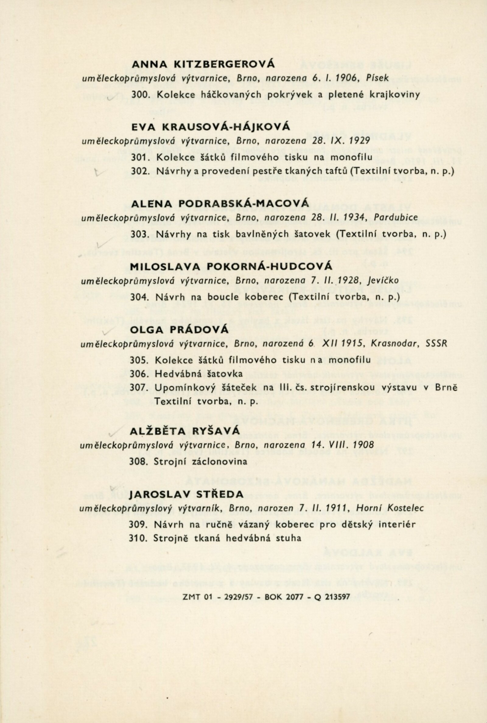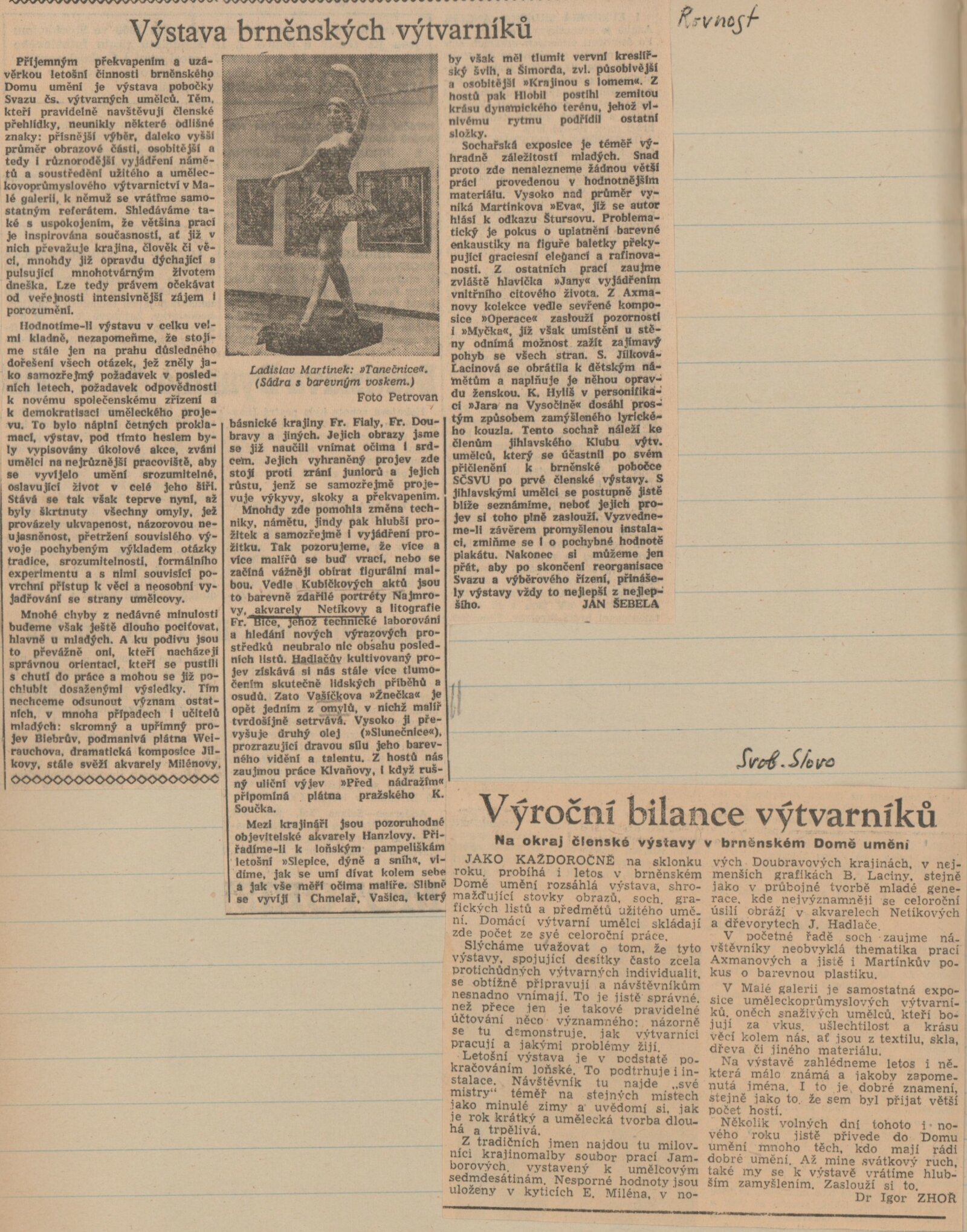 Výstava výtvarníků brněnské pobočky. Svaz československých výtvarných umělců. První členská výstava: Dům umění města Brna, 15. 12. 1957 – 15. 1. 1958 / Text: J. B. Svrček. – Brno: SČSVU, 1957. – 27 s., životní data vystavujících, DU 302. – Kubíček 7635; MZK; MG