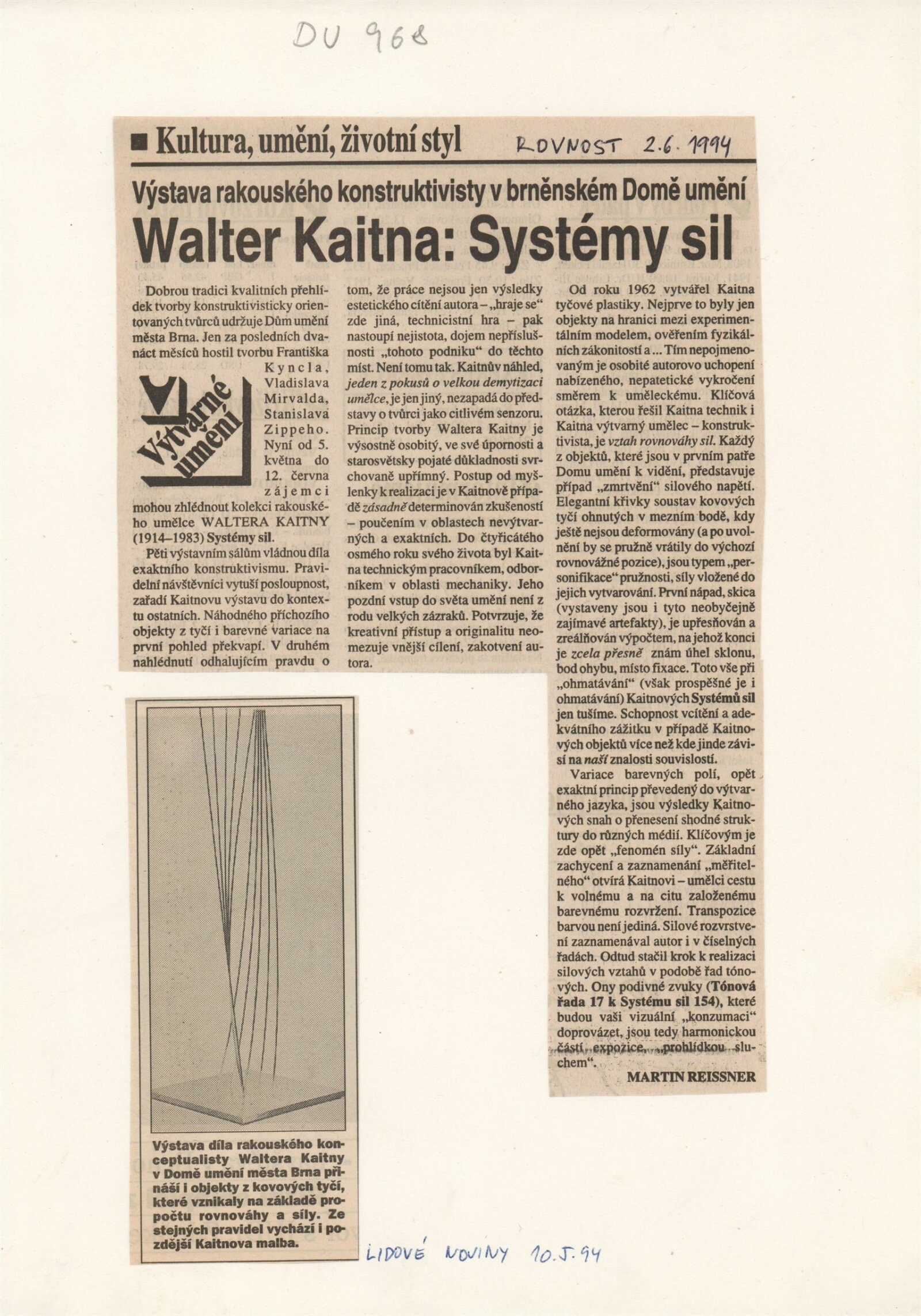 Walter Kaitna. Kräftesysteme 1962–1983: Dům umění města Brna 5. Mai – 12. Juni 1994 ... / Texty Jiří Valoch, Dieter Bogner, Wolfgang Pauser, Dietmar Guderian, autor. - Wien: Kunstraum Buchberg, - 130 s., obr. Český překlad Systémy sil. 1962-Texty Jiří Valoch, Dieter Bogner. - Brno: DUmB, - [8] s. Portrét, životní data, výstavy DU 968; MZK; MG