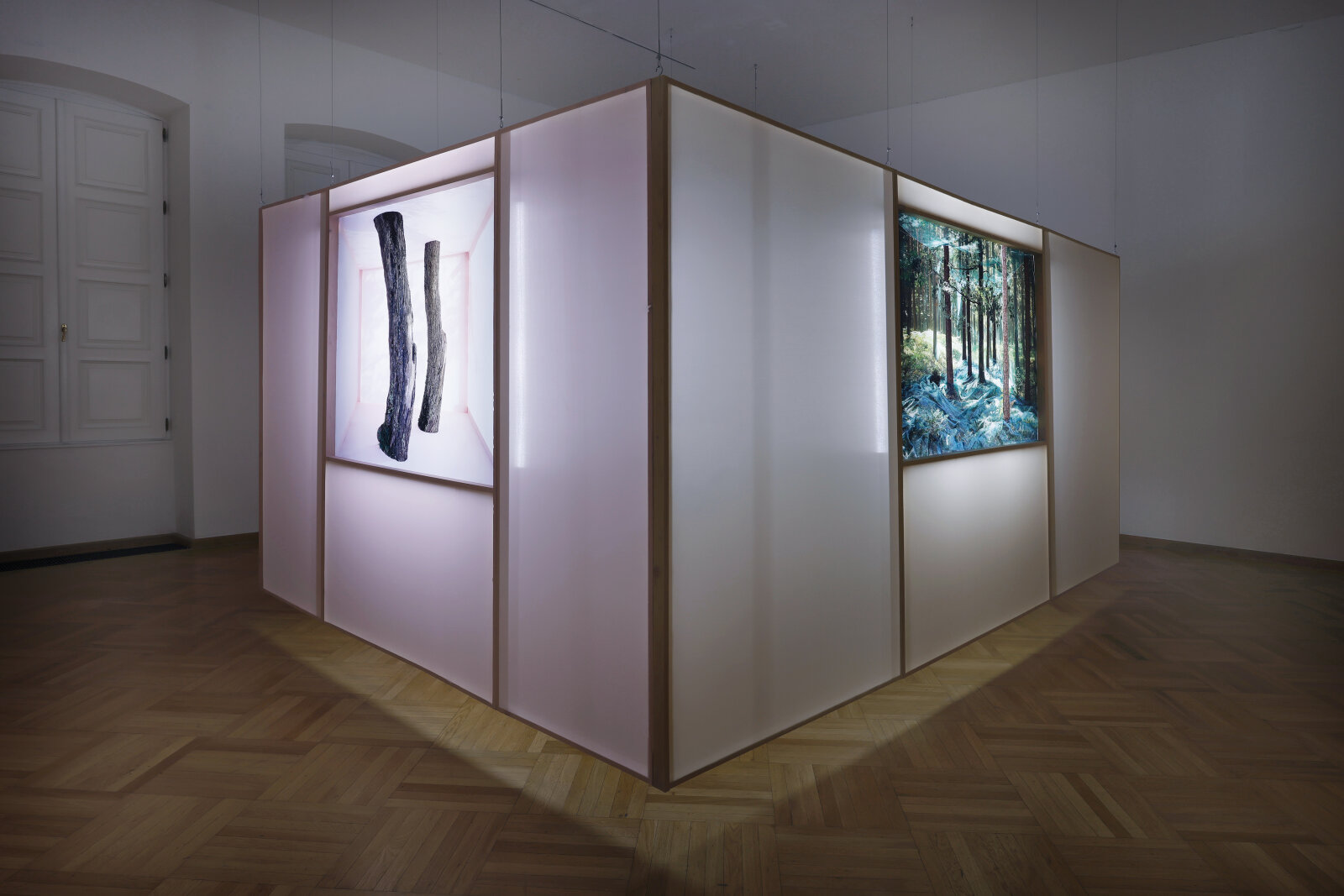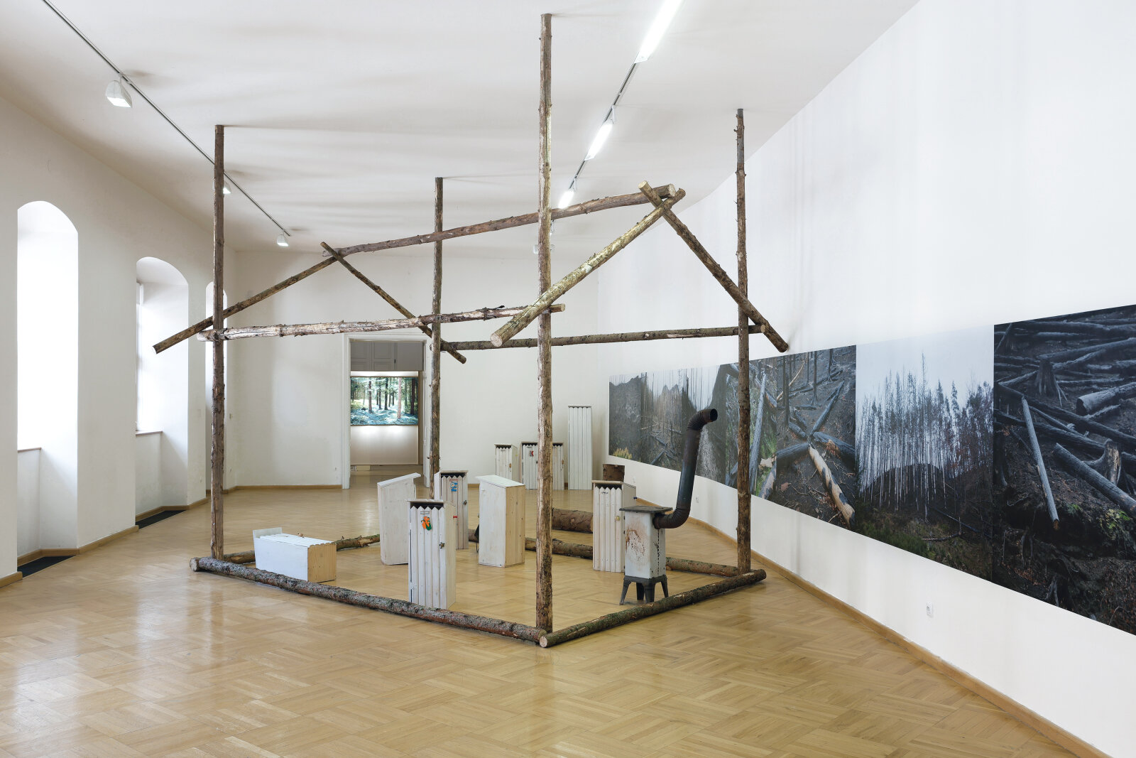 Tomáš Hrůza and Markus Guschelbauer's exhibition We Have Never Been Forest is a follow-up to the 2019 exhibition and book We Have Never Been Earth by Tomáš Hrůza and Andrea Průchová Hrůzová. We've never been modern - because modernity is a construct invented by humans, just like all the other categories that we have thought for centuries we correctly know our surroundings through. We divided the world into "nature" and "culture" and hoped that separating the human and the non-human would help us better understand and describe the world. But something else happened - the world began to fall apart. We were never the earth, we were never the forest - because we were never "just" human as understood by our Enlightenment-modernist-capitalist tradition. Tomáš Hrůza and Markus Guschelbauer at the House of the Lords of Kunštát are essentially "bringing wood to the gallery". Through this slightly absurd and ultimately nonsensical move, they refer to the interconnectedness of all living and non-living things, with an emphasis on the themes that have long appeared in both artists' work: trees and forest. But what is still a forest and what is no longer? There is no place in our landscape that is not at least a little bit influenced by man: the overgrown bark beetle and the dead trees in the streets refer directly to our activity. How can we take a step back and try to be more of a forest, while at the same time letting it live without our interference so that it stops being so human? Through "forest in the gallery" the artists look back at what is happening to our world and what paths we might take in the future. Although both originally photographers, they also step out of this box and into the space, guiding visitors through their imaginative, dadaist and slightly psychedelic musings.