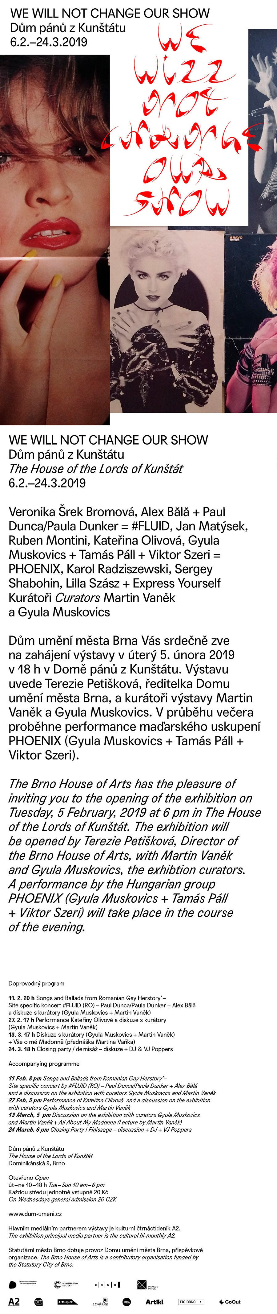 The title of the exhibition is a free paraphrase from the American pop icon, Madonna, when referring to the same issue (see the film “Madonna: Truth or Dare”, also known as “In Bed with Madonna”, directed by Alek Keshishian, 1991). Just as we will not change our show, we will not change the way we are according to the prescriptions of the heteronormative society. It does not matter, whether you are queer or straight, young or old, addicted to love, sex, pop culture, philosophy or science – our freedom to speak is your freedom, too.