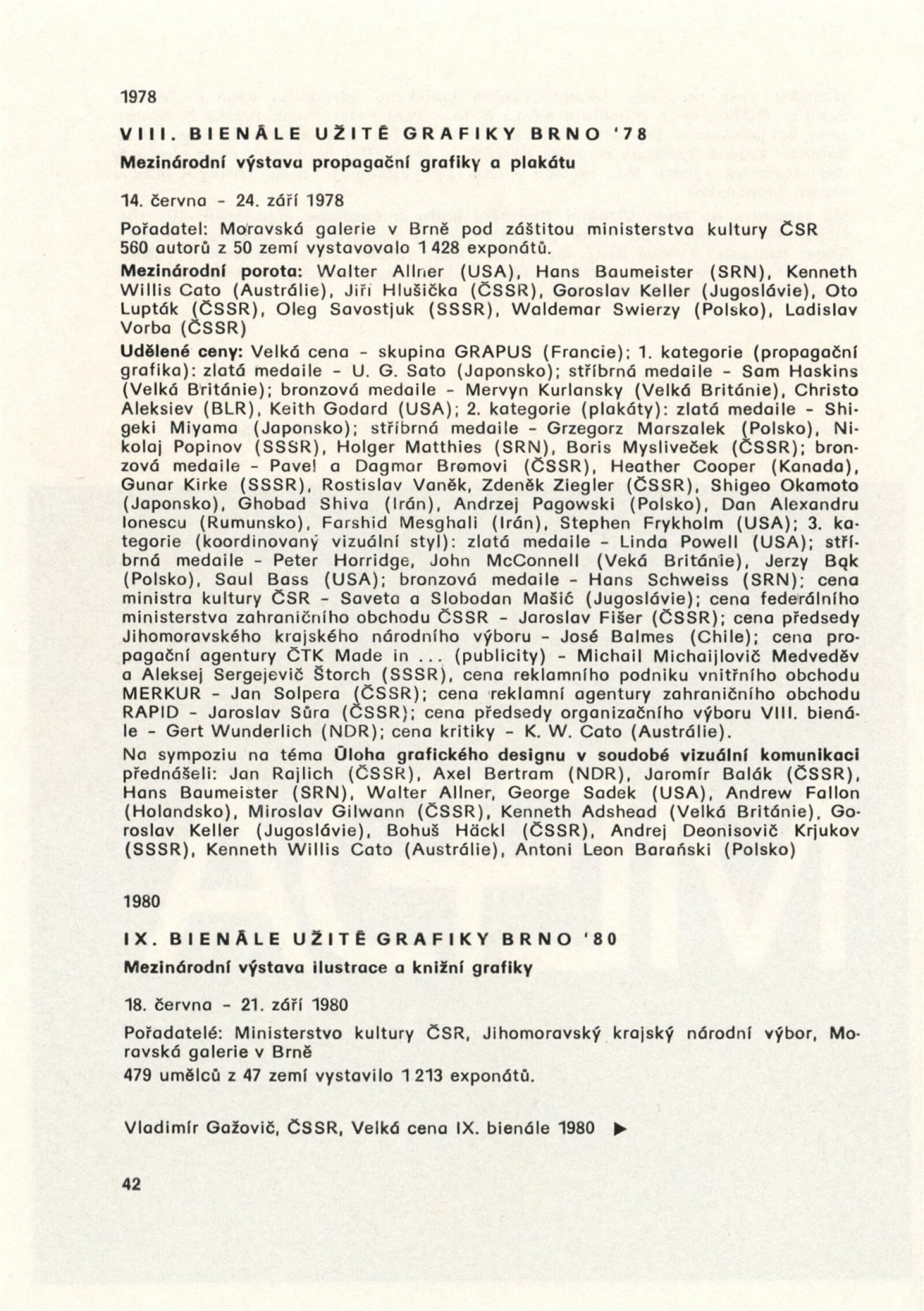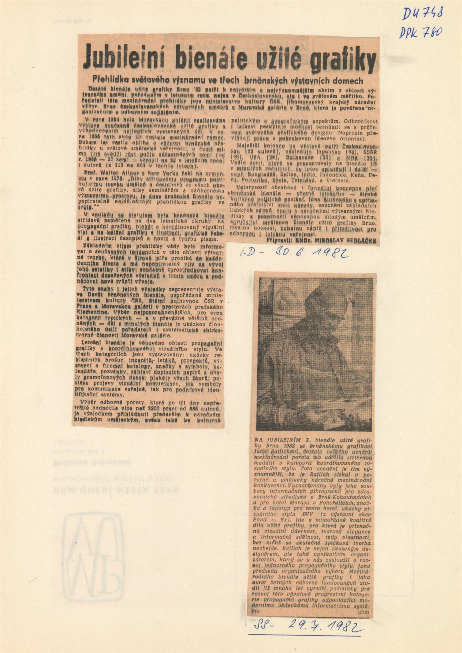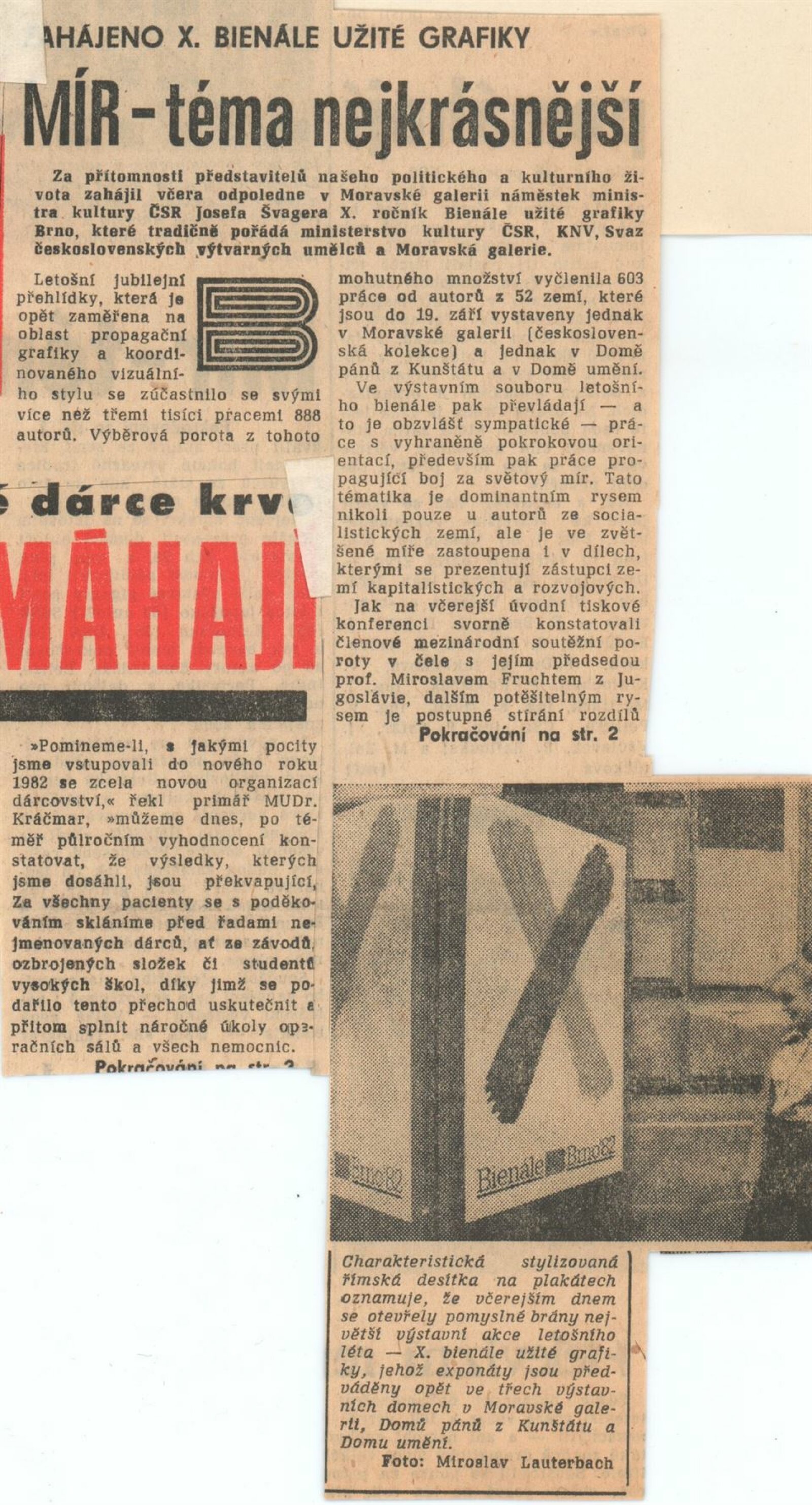 Mezinárodní výstava propagační grafiky a plakátu. X. bienále užité grafiky Brno 1982: Dům umění města Brna, Dům pánů z Kunštátu a Moravská galerie v Brně, 16. 6. – 19. 9. 1982 / Text: Jiří Hlušička. – Brno: Moravská galerie, 1982. – 420 s., obr., název a text též anglicky, DU 748, DPK 780. – MZK; MG