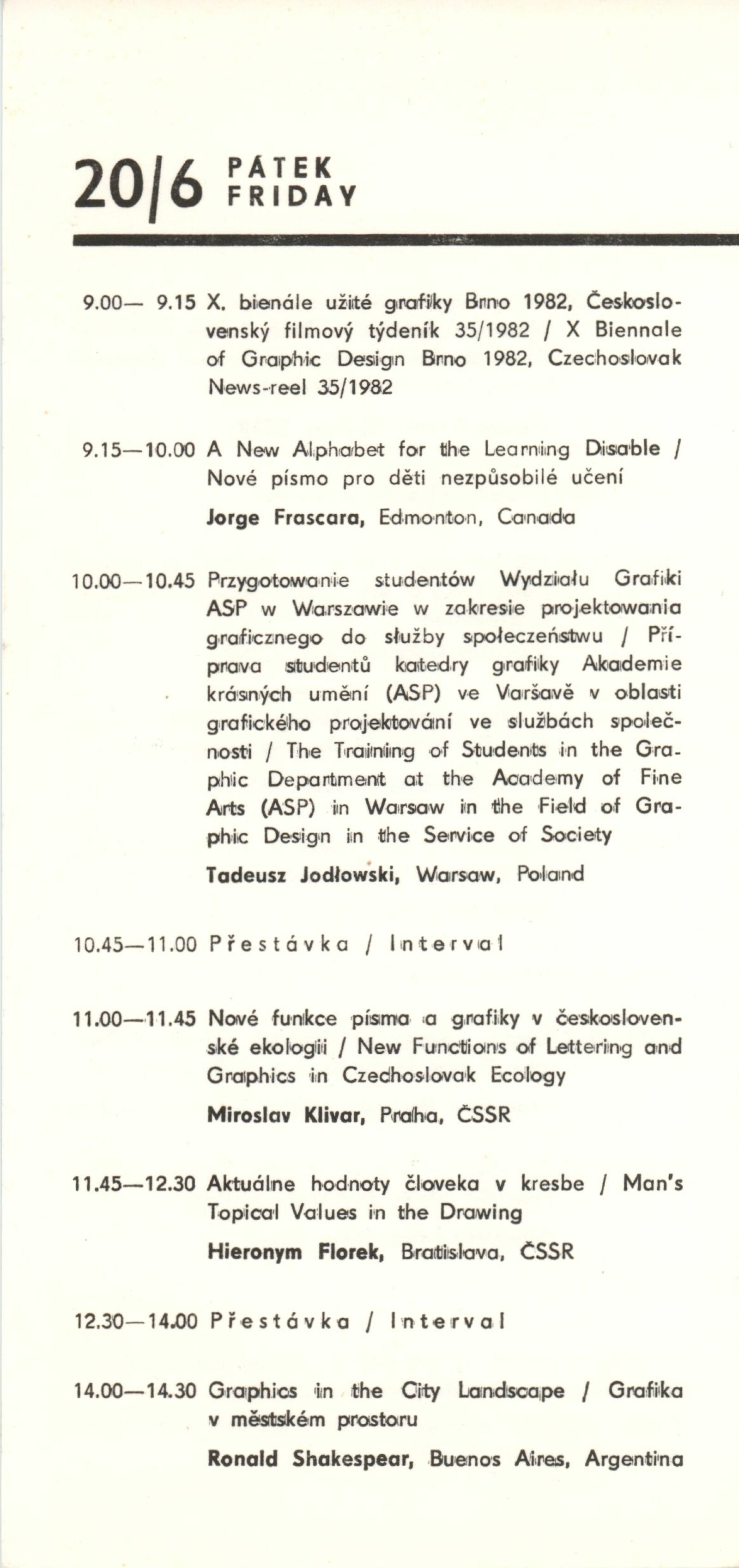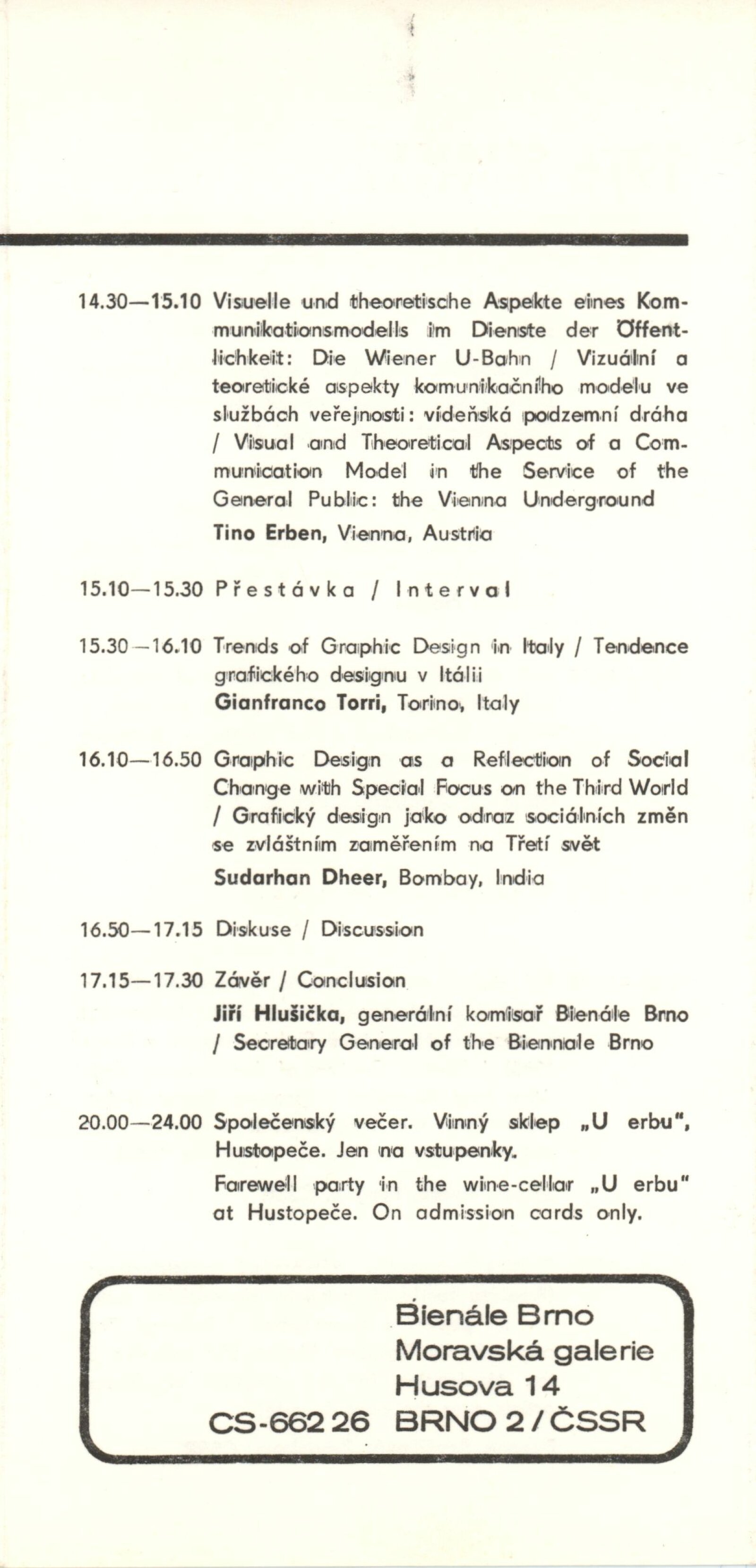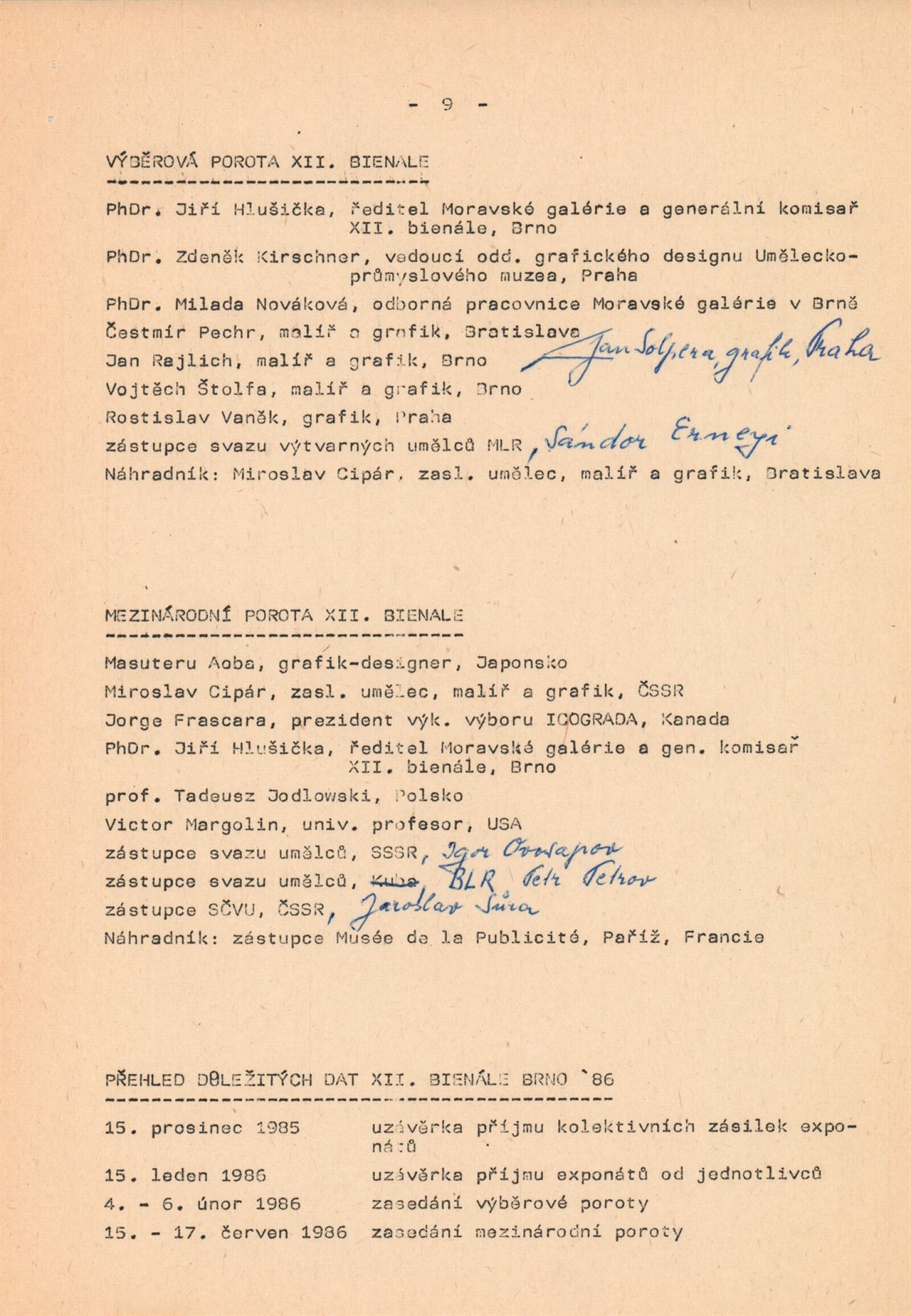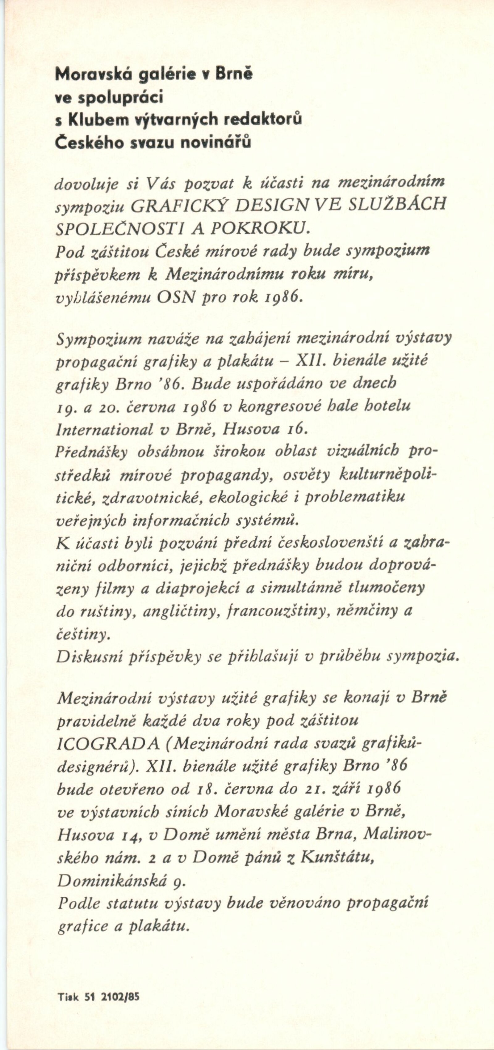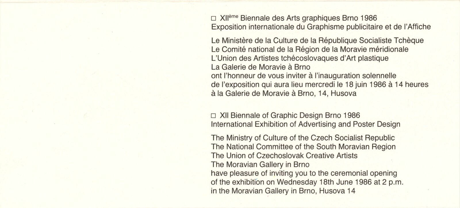 Mezinárodní výstava propagační grafiky a plakátu. XII. Bienále užité grafiky Brno 1986: Dům umění města Brna, Dům pánů z Kunštátu a Moravská galerie v Brně, 18. 6. – 21. 9. 1986 / Text: Jiří Hlušička. – Brno: Moravská galerie, 1986. – 376 s., obr, 16 s. bar. obr., z graf. tvorby umělců ČLR 8 s., DU 882. – MZK; MG