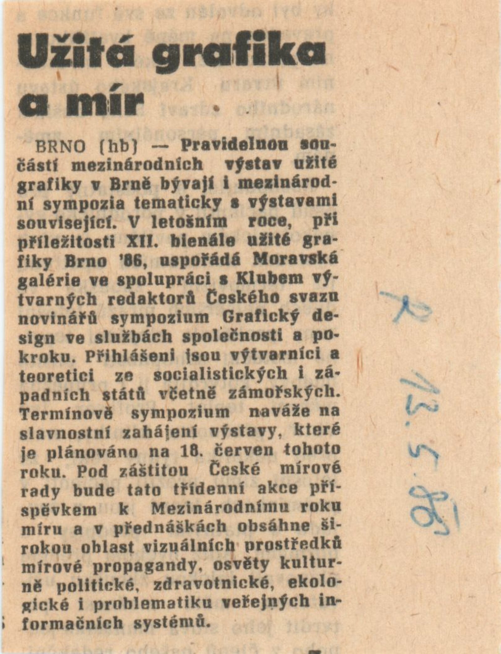 pozvánka, program bienále, bulletin bienále, podmínky účasti bienále, přihláška, statut ceny kritiky, časový harmonogram instalace bienále, provozní korespondence, smlouva o spolupráci, statistiky; zprávy a recenze v tisku (z BV, LN, P, Rovnost, RP, SS, TV, ZN), pozvánka na výstavu Masutera Aoby v rámci bienále v MG ČSS v Brně (1986), 2x pozvánka na výstavu Čestmíra Pechra ve foyer Janáčkova divadla v Brně (1986)
