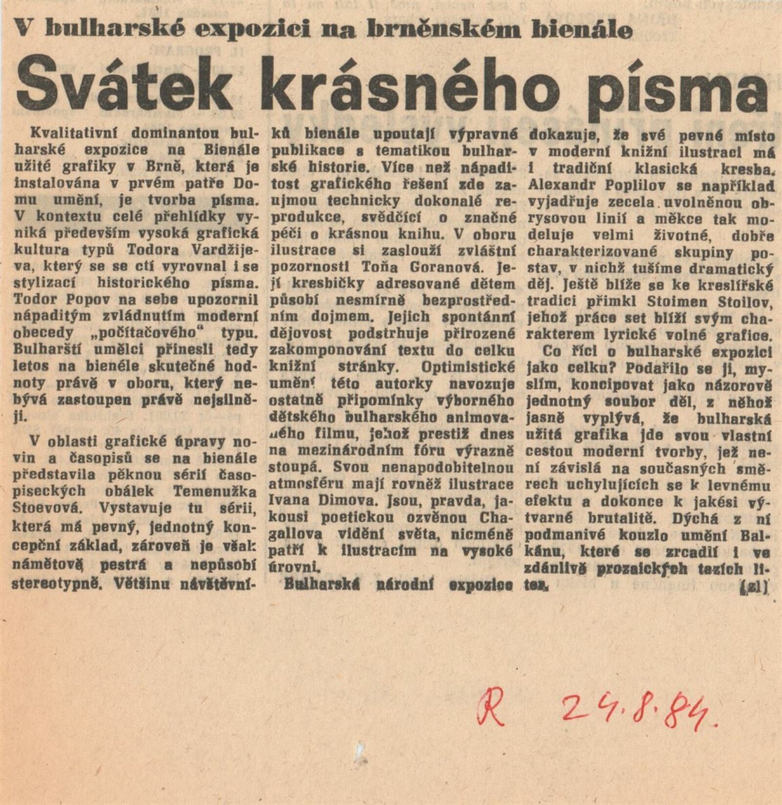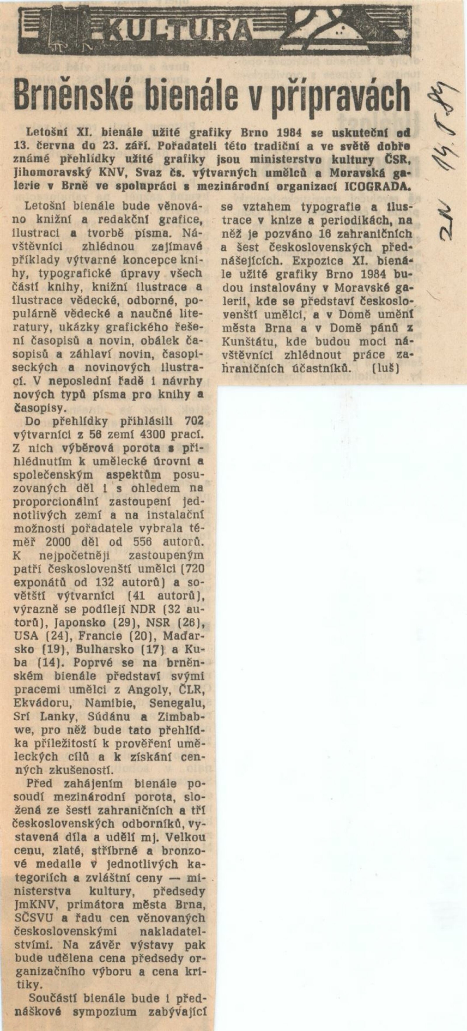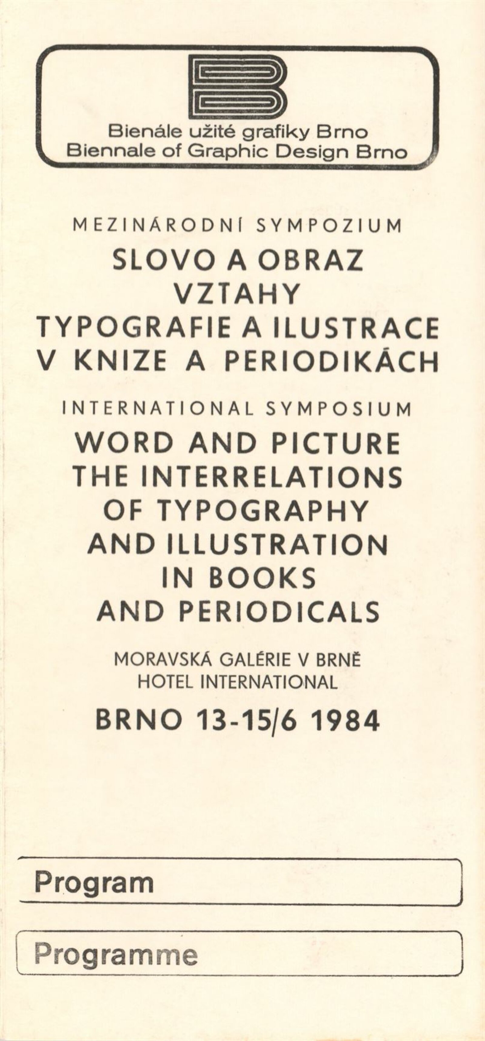 Mezinárodní výstava ilustrace a knižní grafiky. XI. bienále užité grafiky Brno 1984: Dům umění města Brna, Dům pánů z Kunštátu a Moravská galerie v Brně, 13. 6. – 23. 9. 1984 / Text: Jiří Hlušička. – Brno: Moravská galerie, 1984. – 352 s., obr., skládačka 6 s., název a text též anglicky, DU 785. – DPK 825; MZK; MG