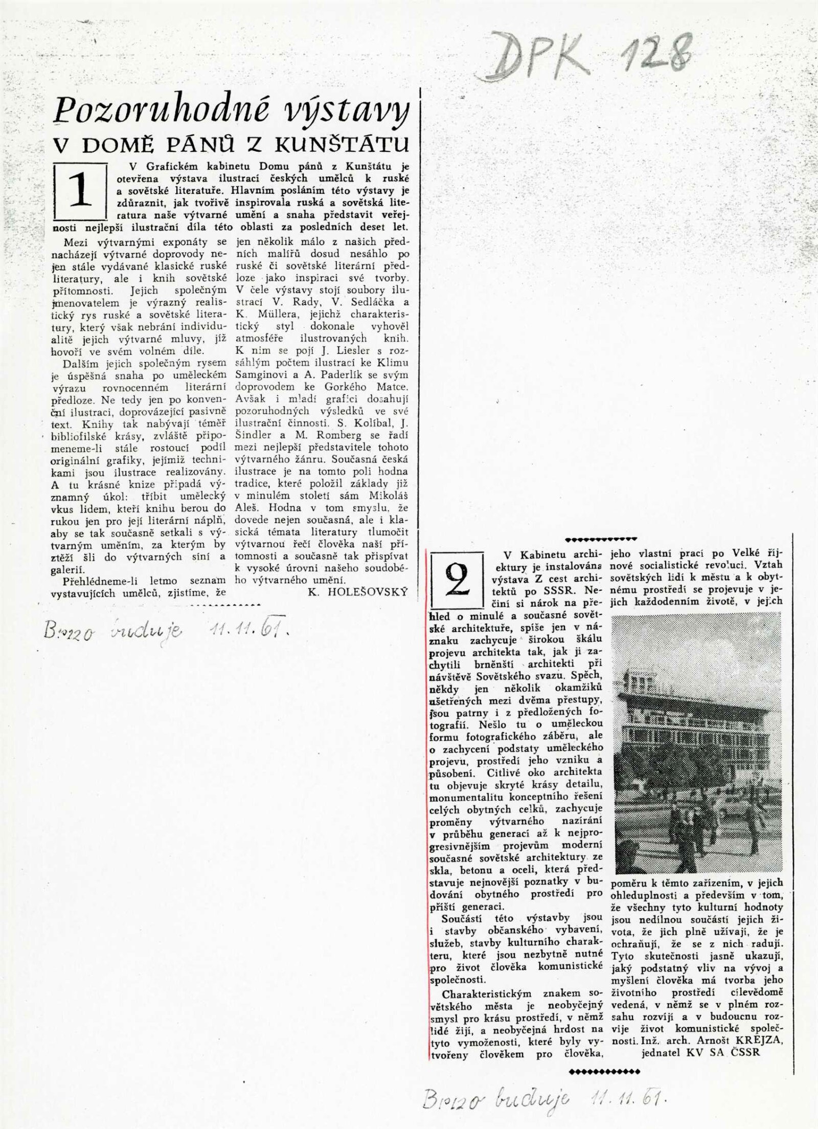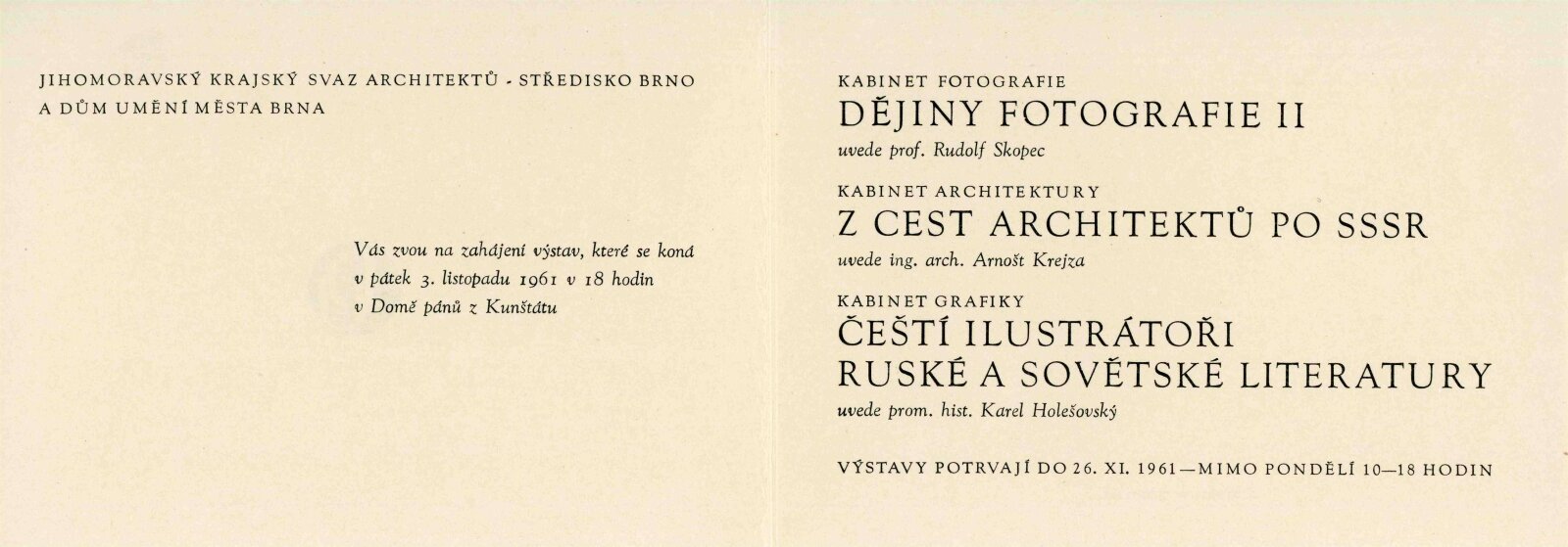 Z cest architektů po SSSR: Dům umění města Brna / Dům pánů z Kunštátu, Kabinet architektury Svazu architektů ČSSR, 3. 11. – 26. 11. 1961 / Brno: Svaz architektů ČSSR, 1961. – 4 s., obr., DPK 128