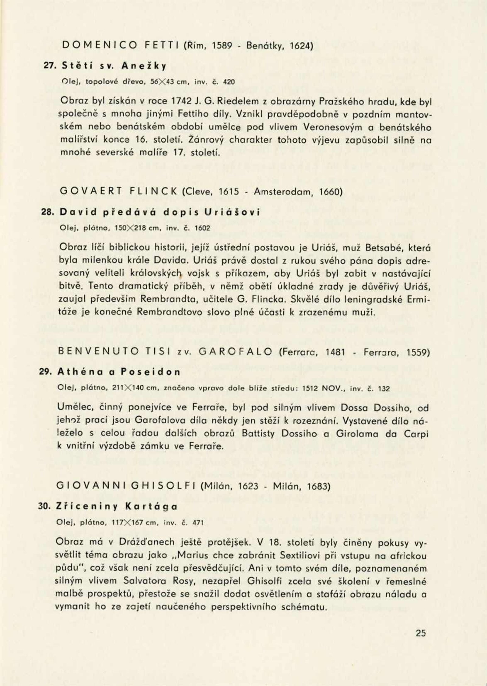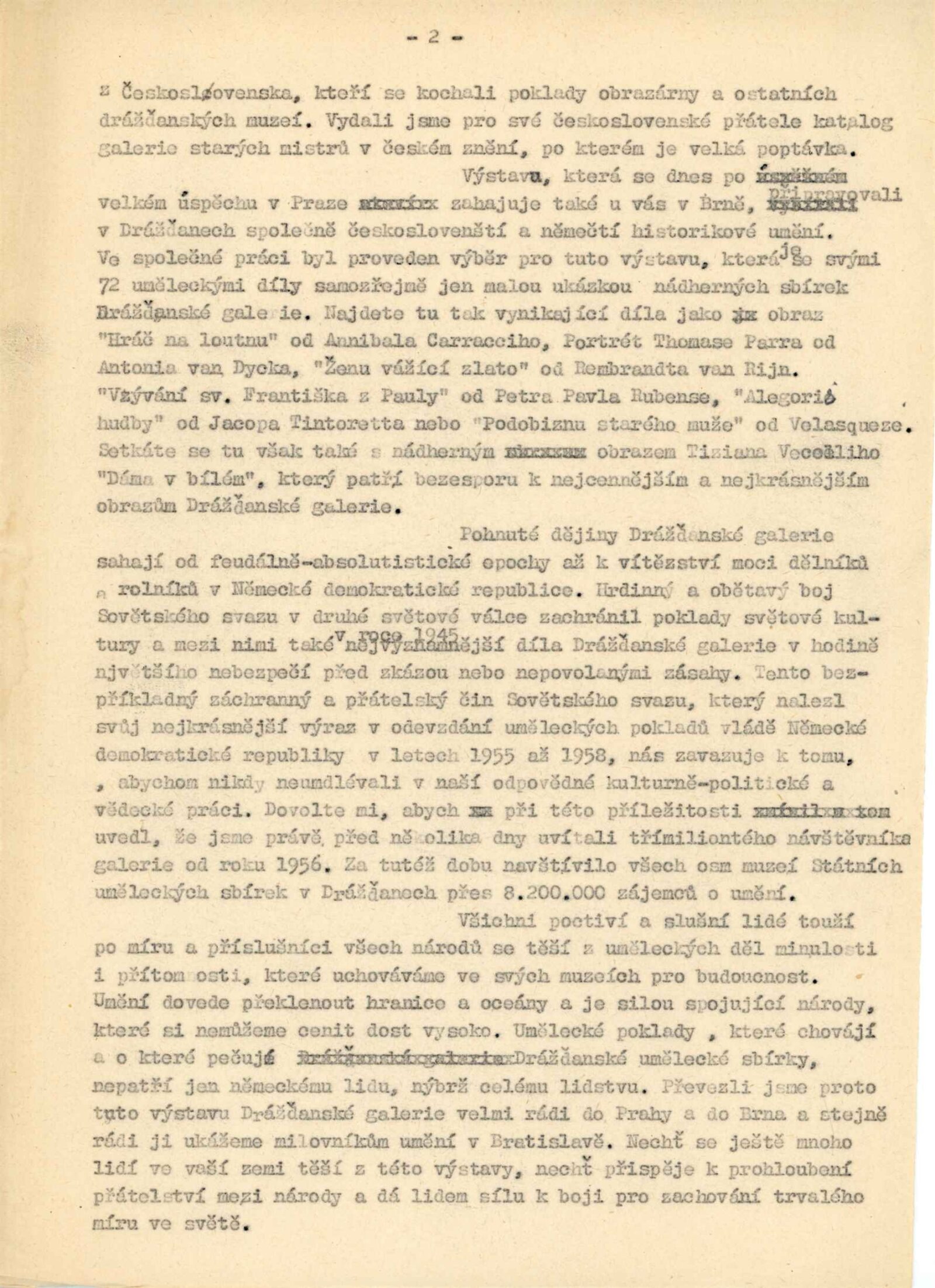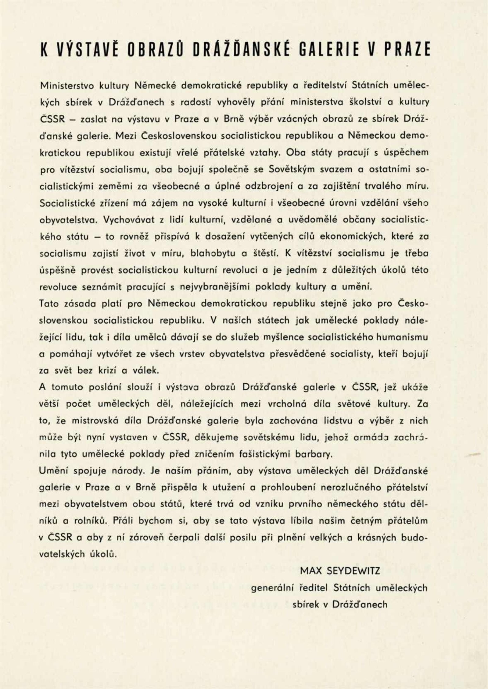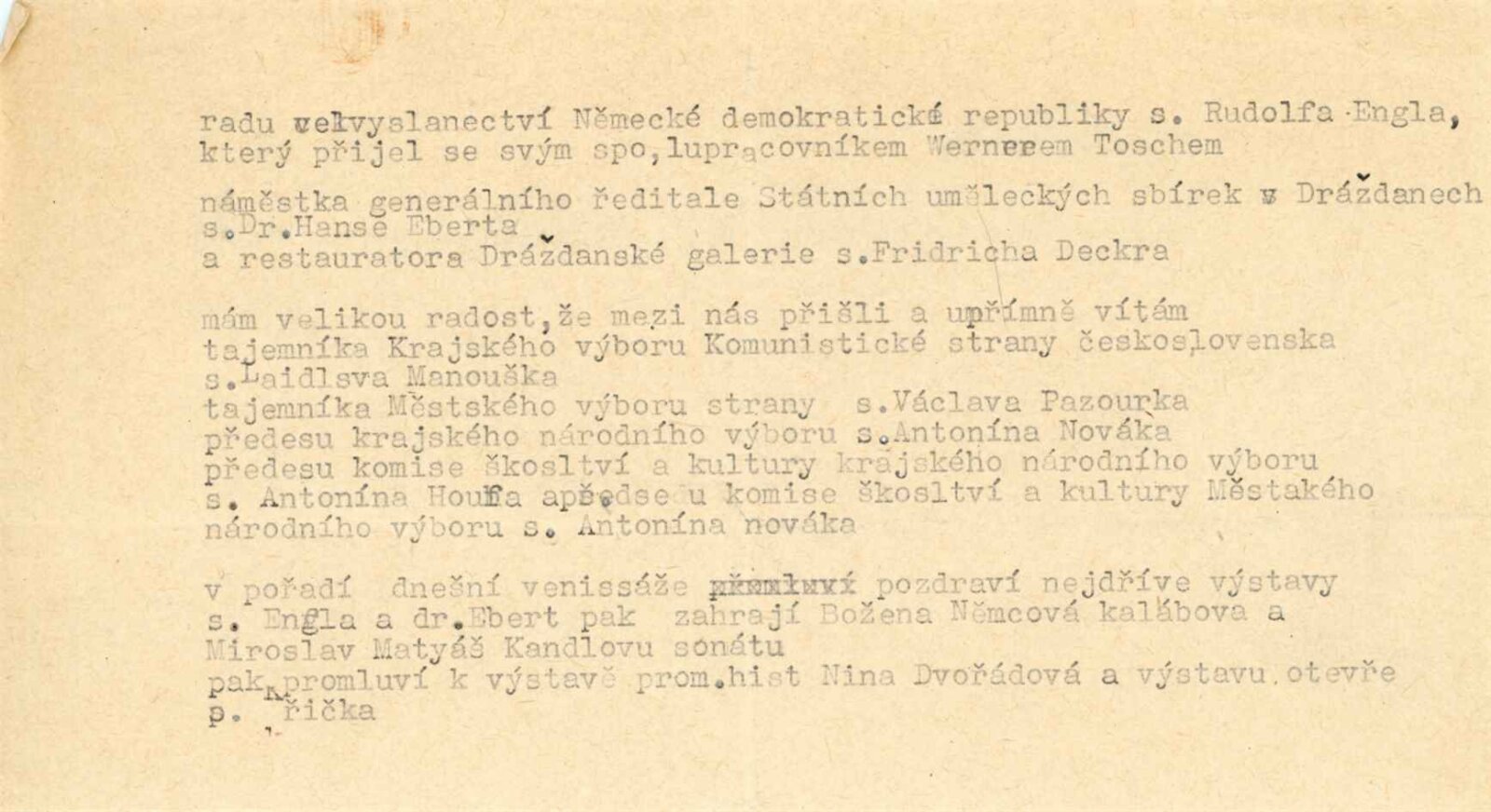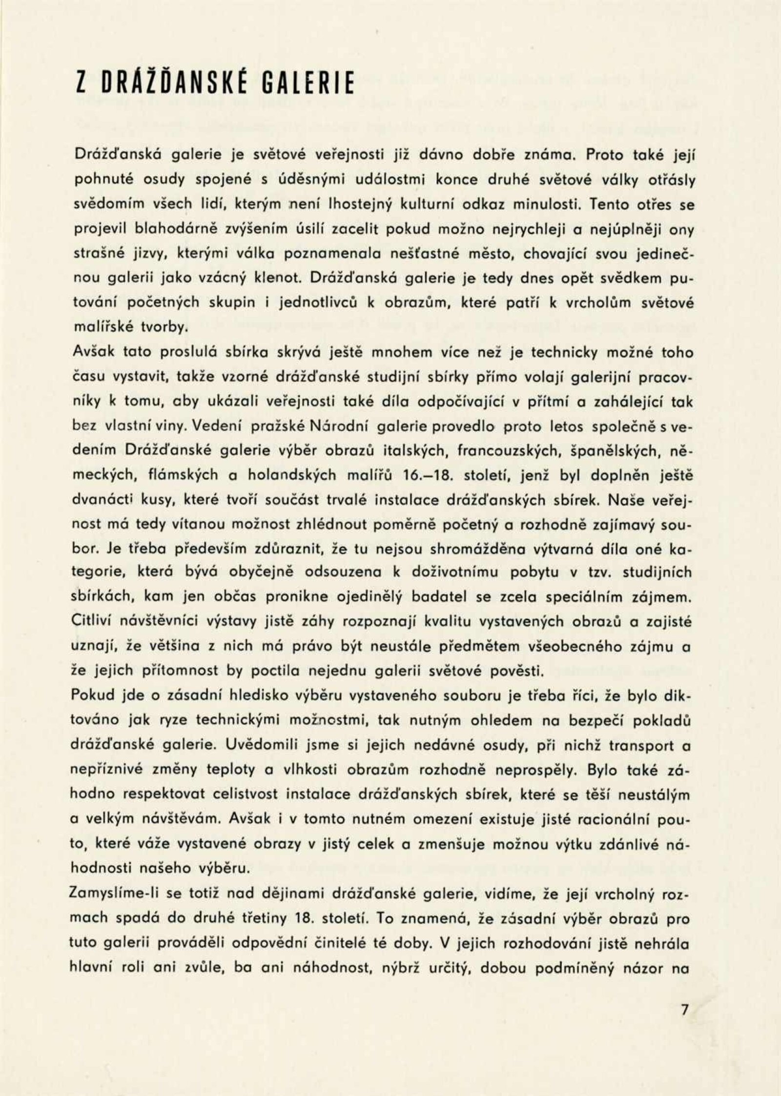pozvánka, katalog (z DU i NG), malé plakáty, texty pro tisk, text na zahájení, projev ředitele drážďanské sbírky Hanse Eberta při zahájení, seznam děl, foto obrazů a z vernisáže, korespondence (o realizaci výstav – M. Seydewitz i o výstavách v DPK, H. Ebert, MŠK, NG, korespondence o restaurátorském průzkumu, o zaslání diapozitivů z Kult. inf. střediska NDR, oběžník OŠK MNV V Brně s anoncí výstavy v DU, korespondence o převzetí výstavy do Bratislavy), zápůjční smlouva, soupis hromadných návštěv, recenze v tisku, propagační materiál z NDR