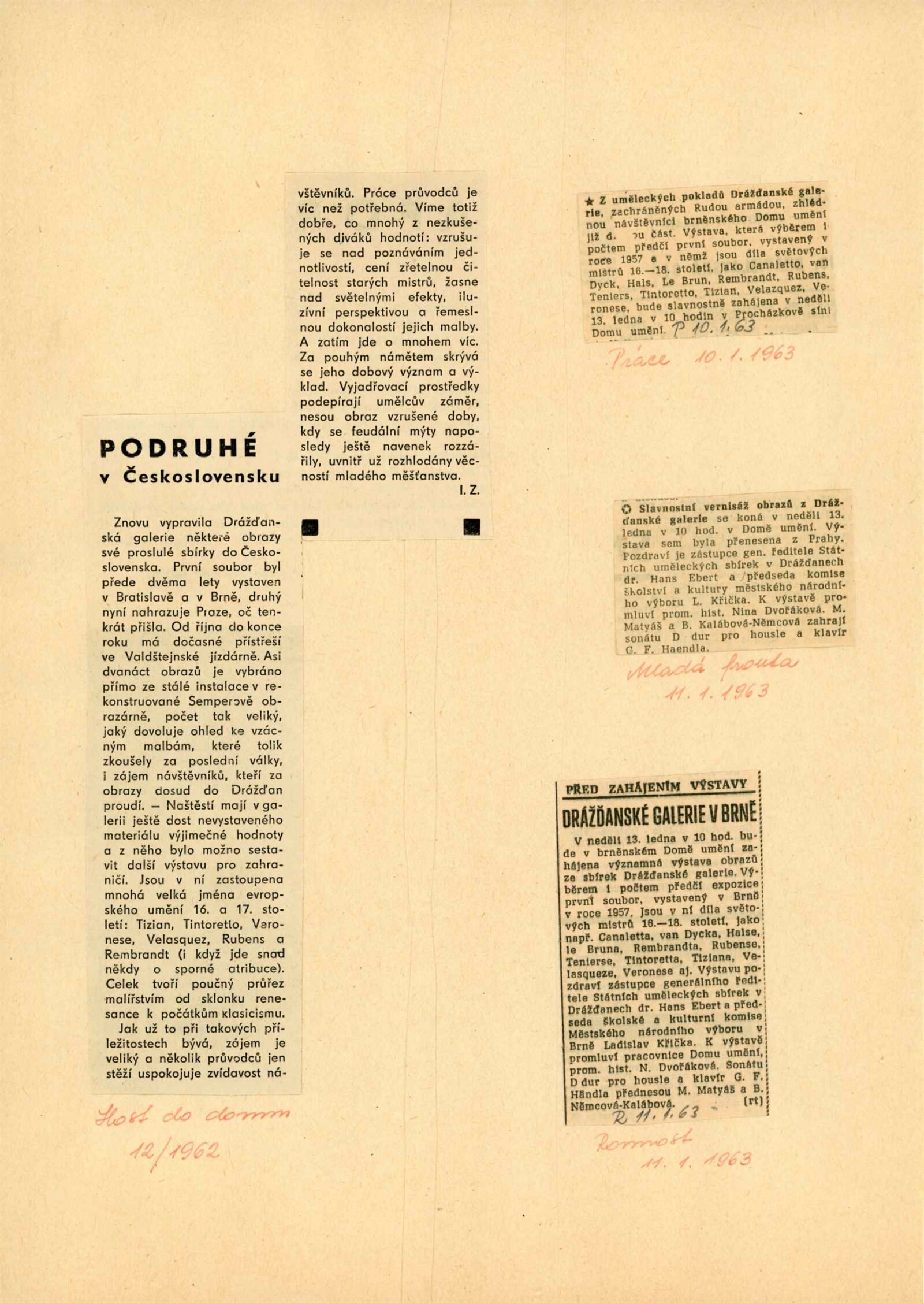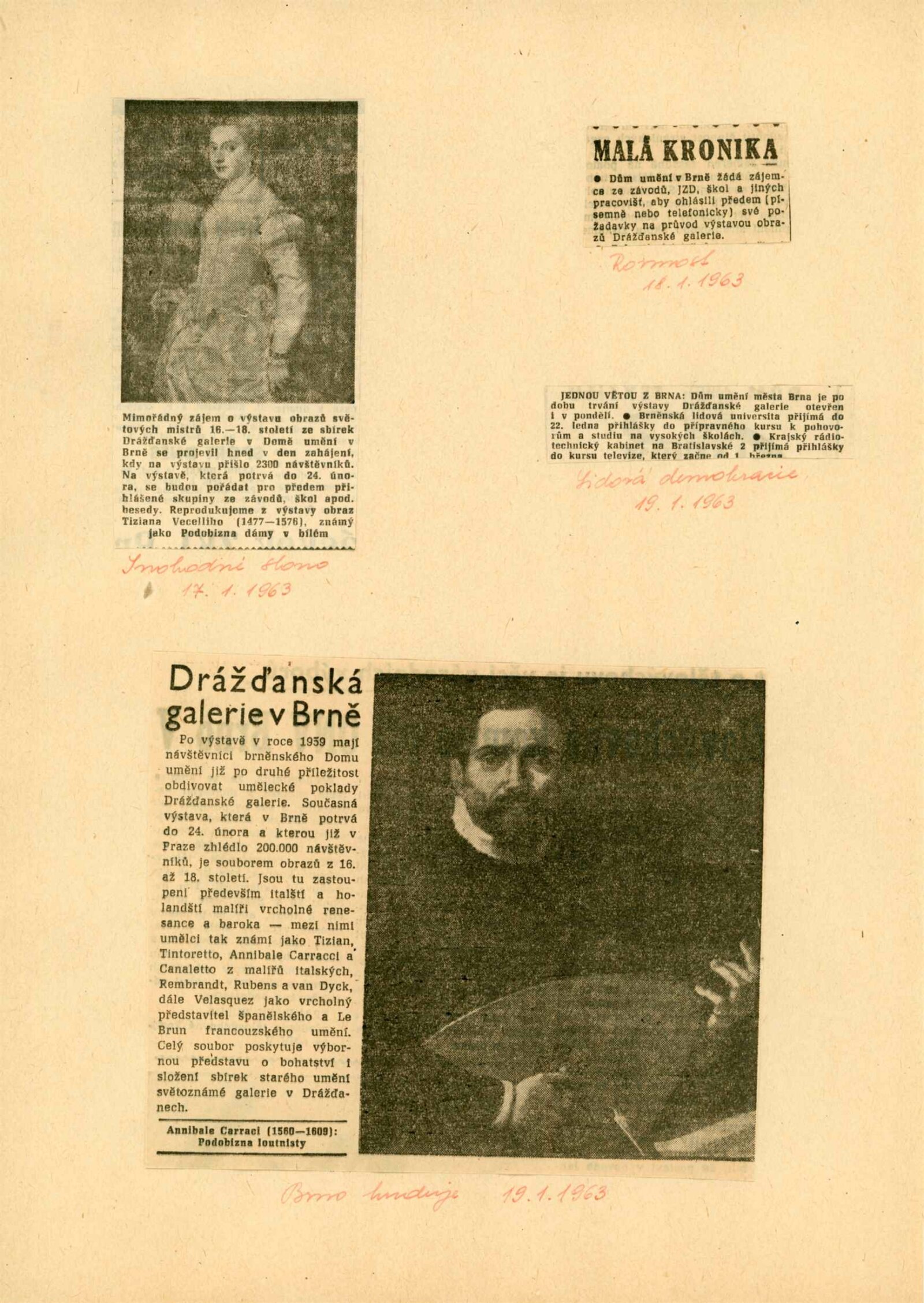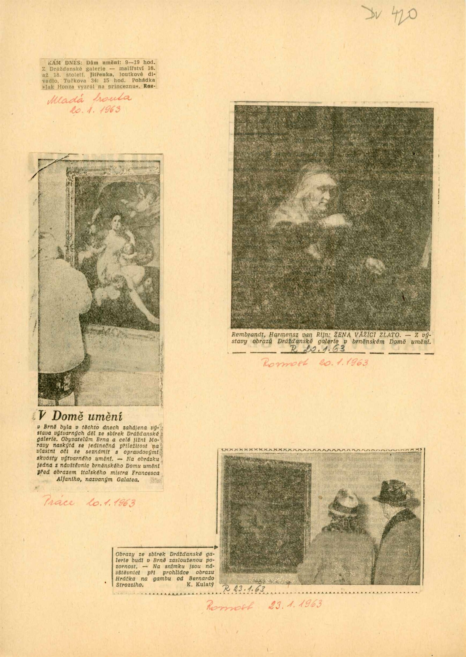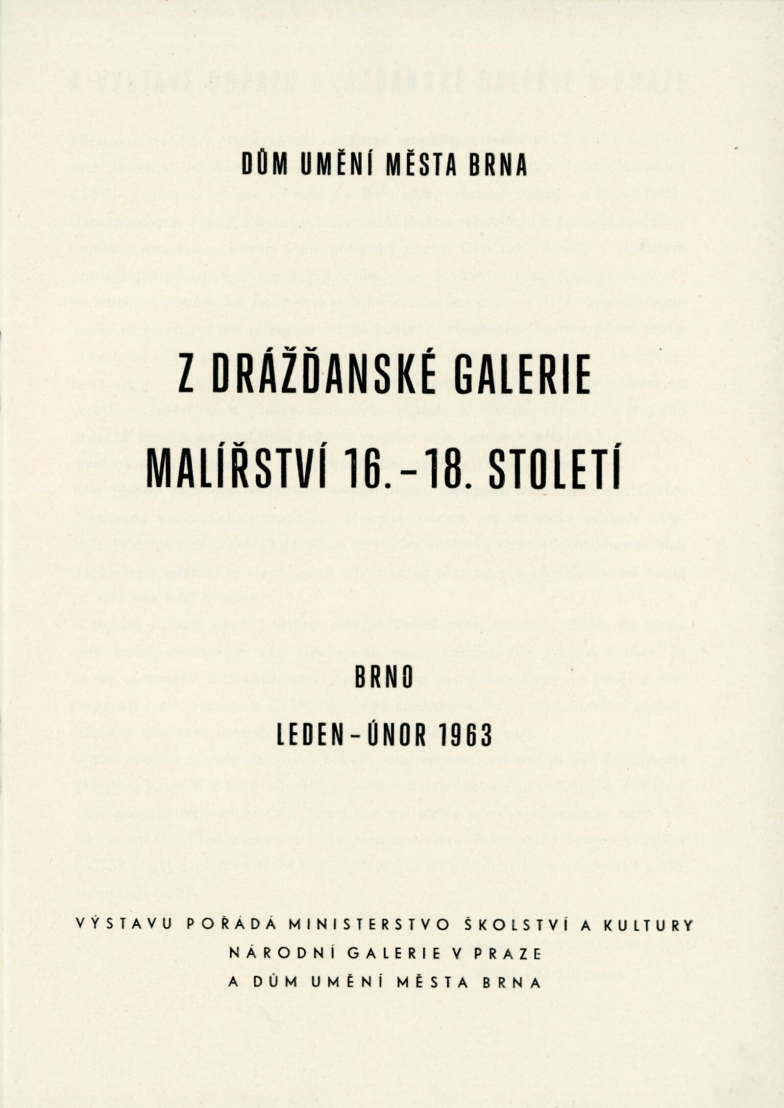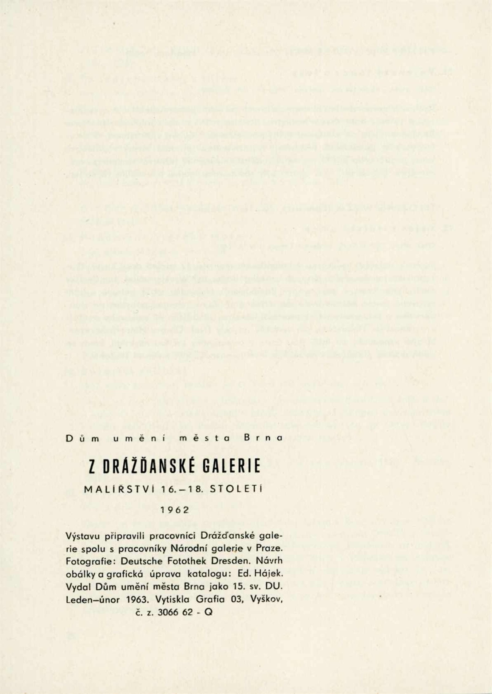 Z drážďanské galerie. Malířství 16.–18.století: Dům umění města Brna, 13. 1. – 24. 2. 1963 / Texty: Max Seydewitz, Jaromír Šíp. – Brno: DUmB, 1963. – 35 s., obr., odborné popisy, DU 420. – MG