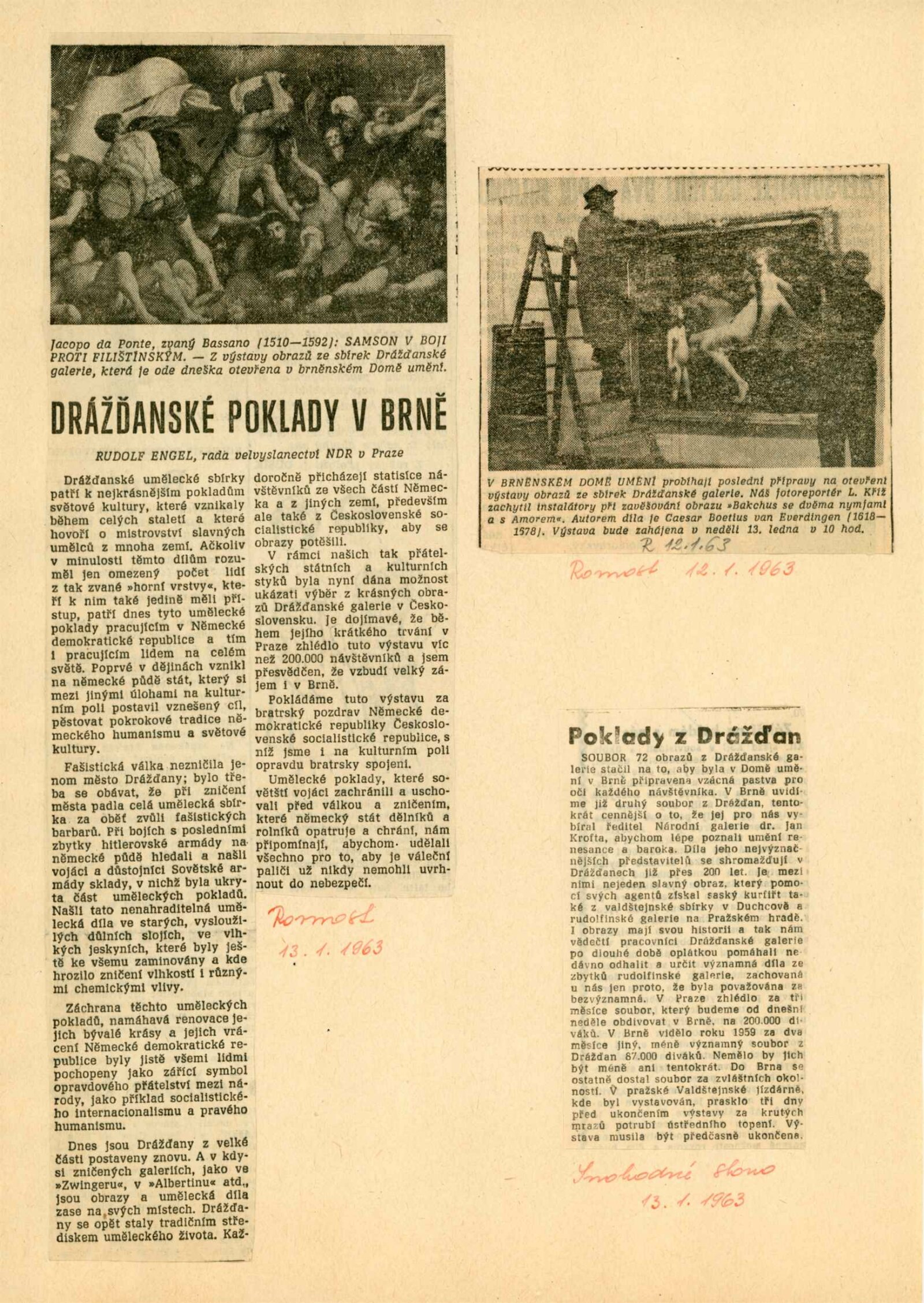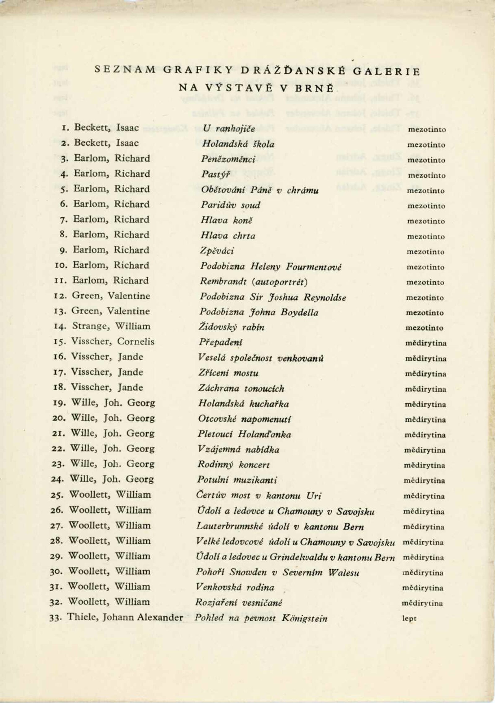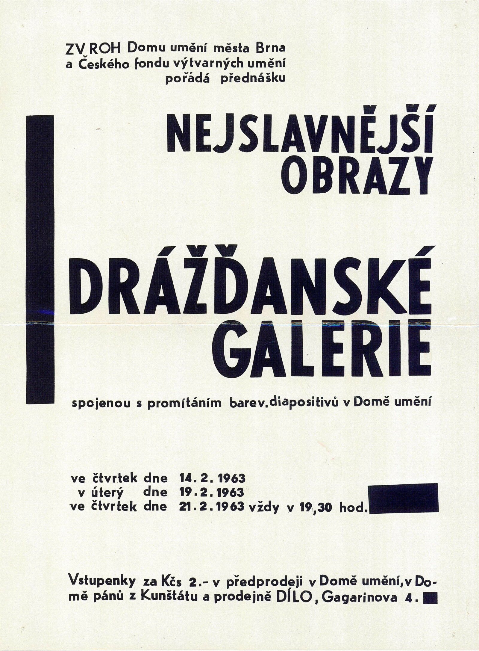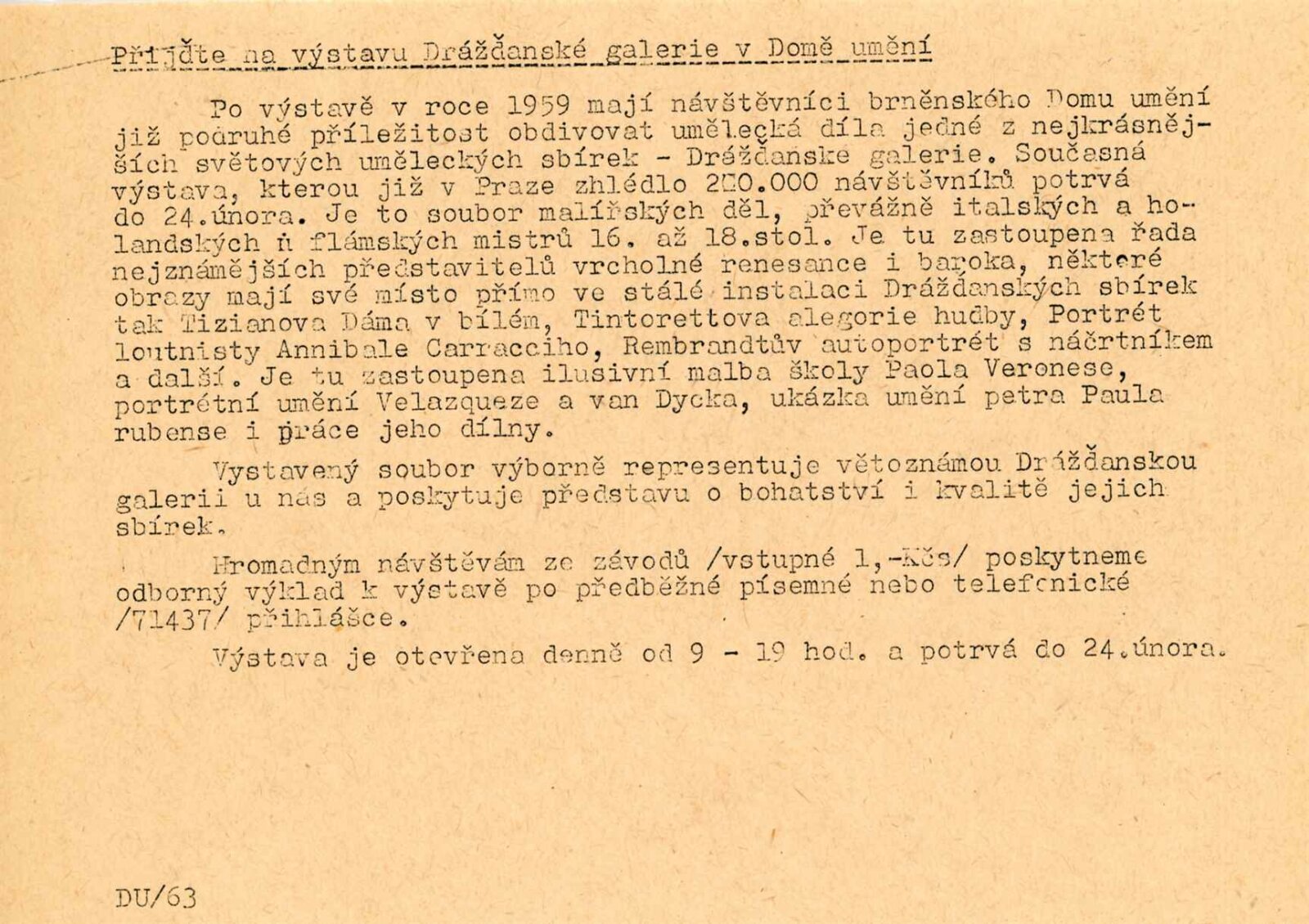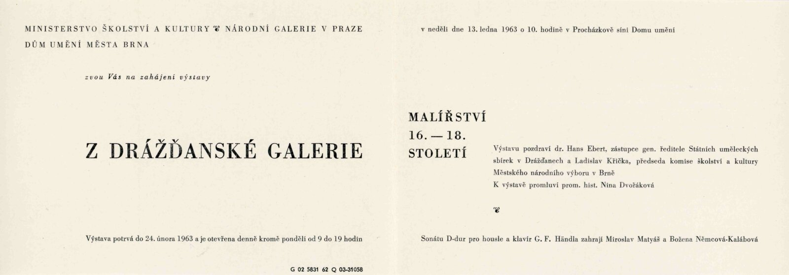 Z drážďanské galerie. Malířství 16.–18.století: Dům umění města Brna, 13. 1. – 24. 2. 1963 / Texty: Max Seydewitz, Jaromír Šíp. – Brno: DUmB, 1963. – 35 s., obr., odborné popisy, DU 420. – MG