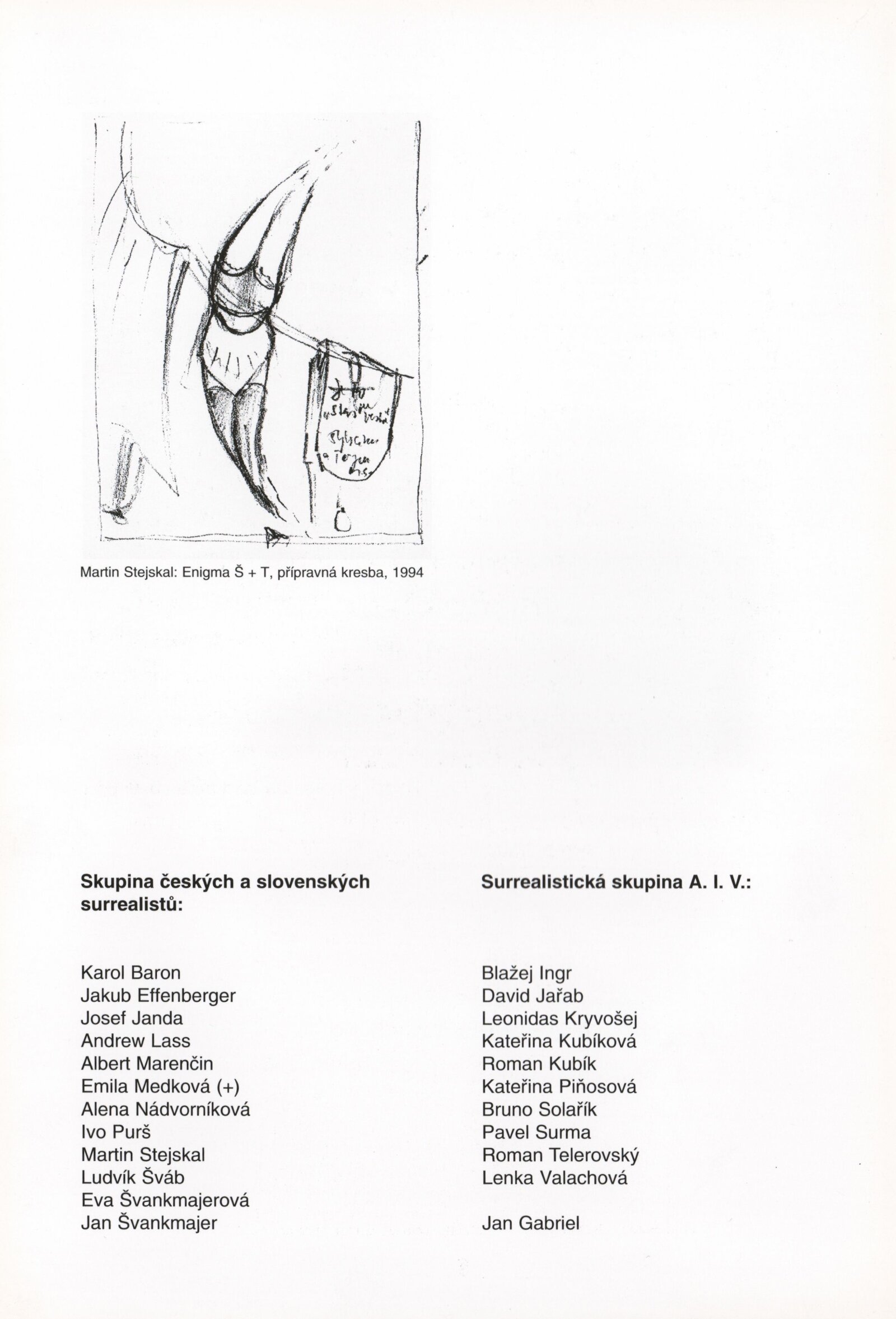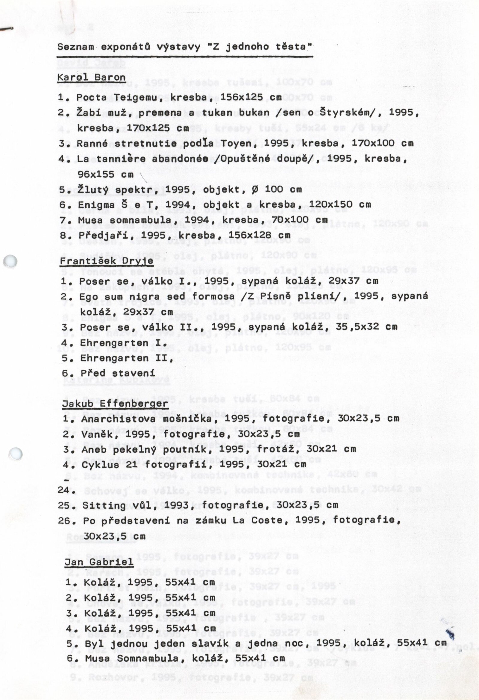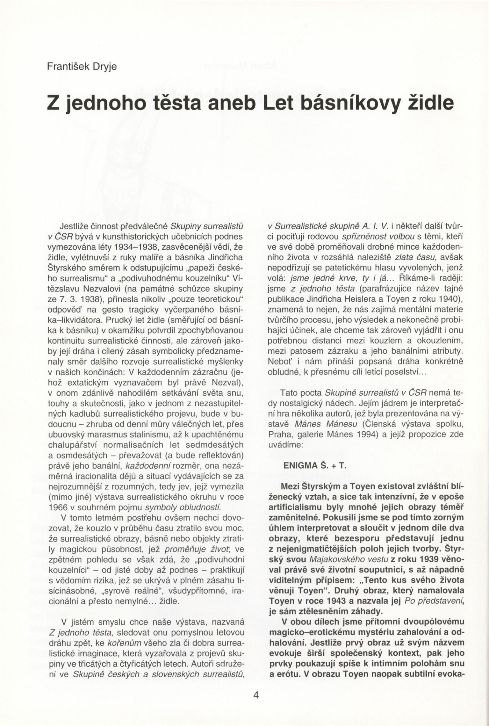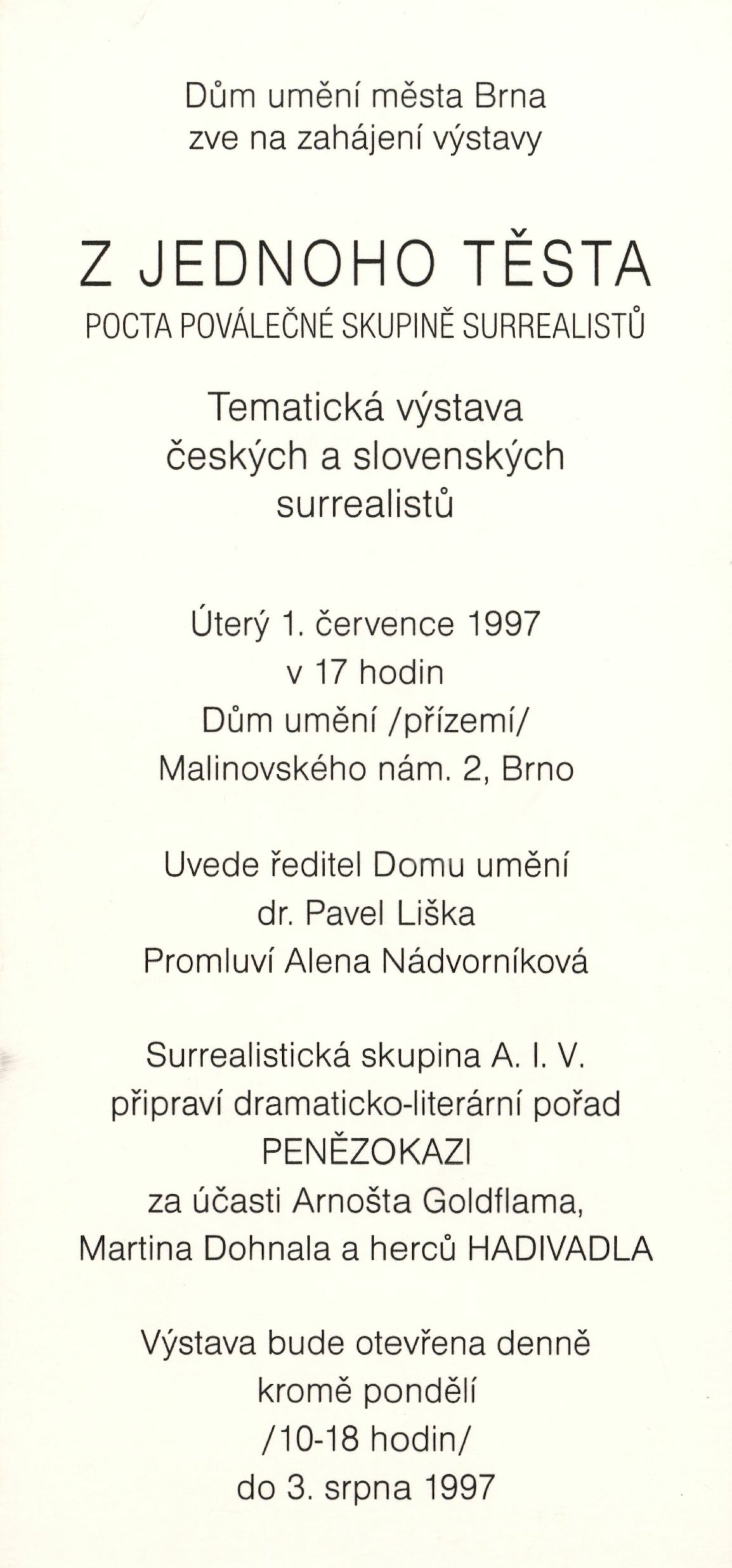 Z jednoho těsta. Pocta poválečné skupině surrealistů. Tématická výstava českých a slovenských surrealistů: Dům umění města Brna, 1. 7. – 3. 8. 1997 / Převzatý katalog. Z jednoho těsta. Pocta skupině surrealistů v ČSR. Tématická výstava Skupiny českých a slovenských surrealistů a Surrealistické skupiny A. I. V. / Texty: různých autorů. – Praha: SVU Mánes, 1997. – 50 s., obr., DU 1056. – MZK